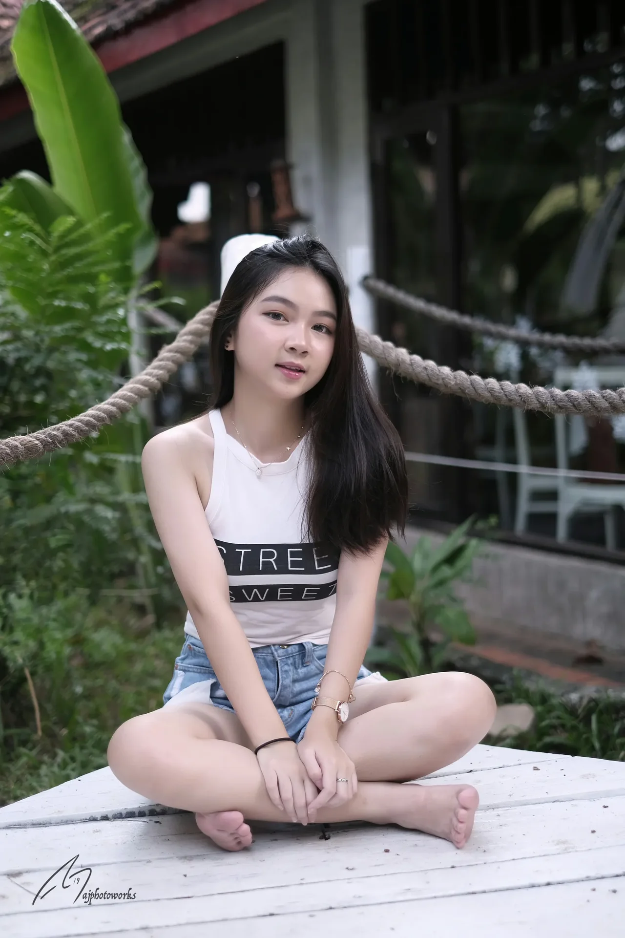A serene garden pathway adorned with lush greenery and delicate flowers, where a young woman enjoys a moment of calm, wrapped in the beauty of nature.