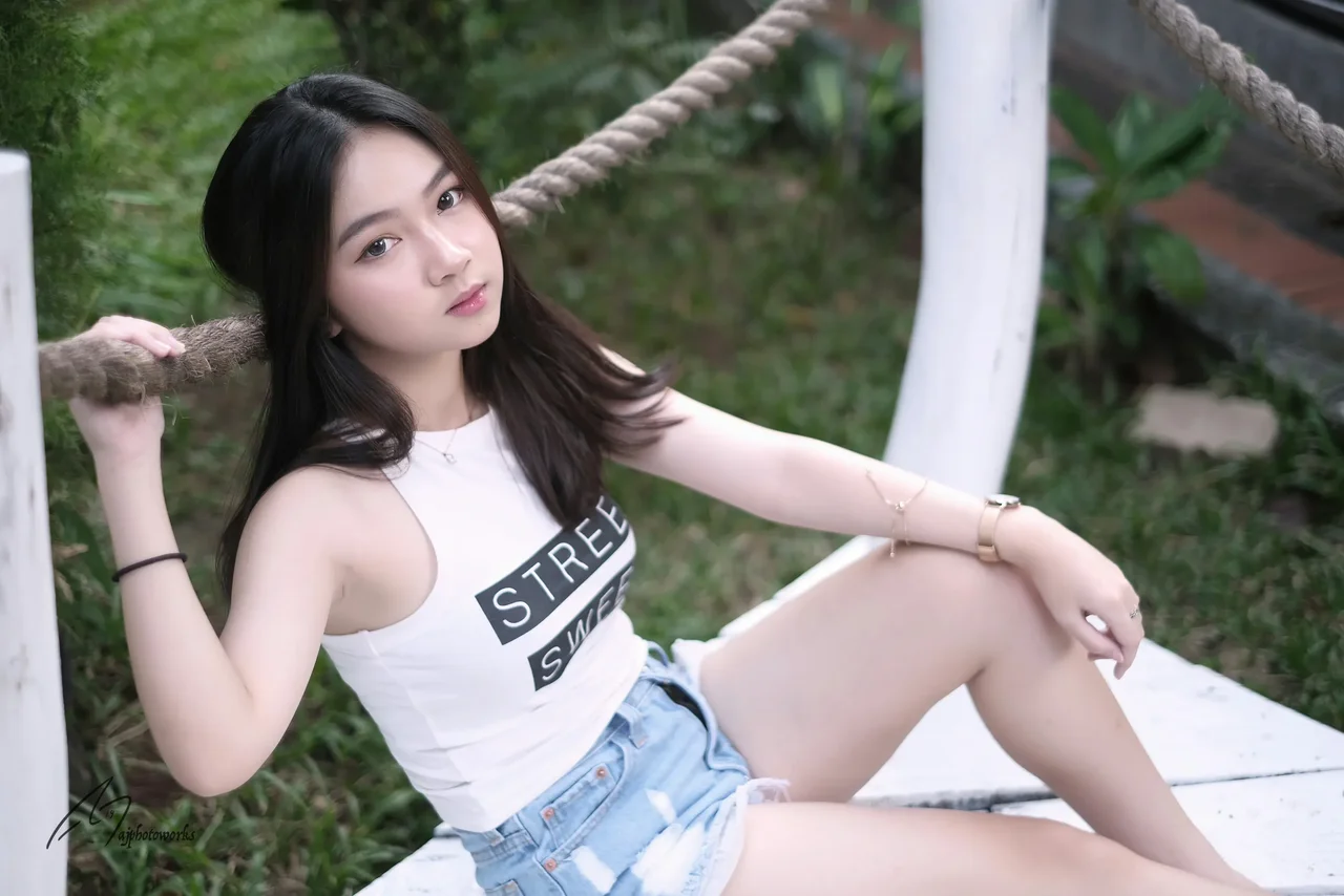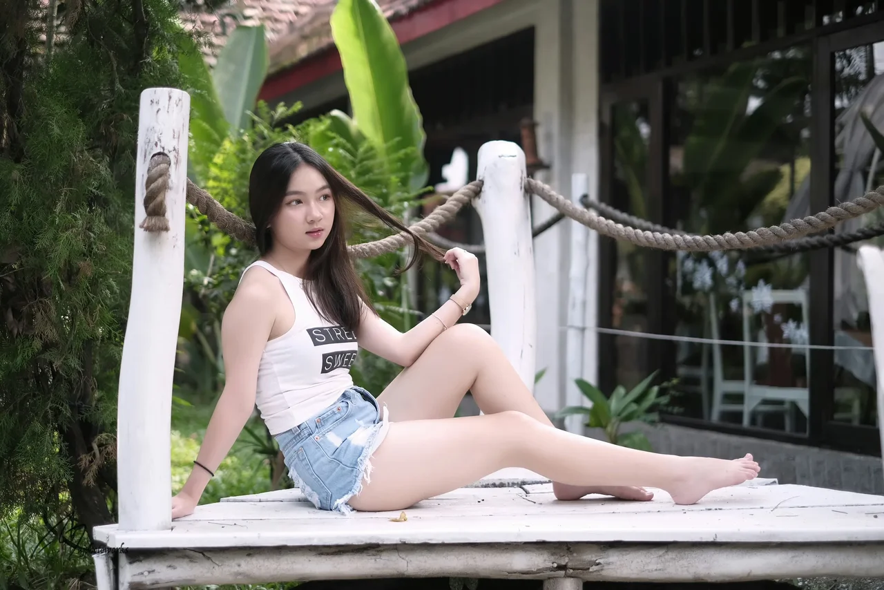 A young woman in a 'STREET SWEET' tank top and distressed denim shorts poses effortlessly on a rope-wrapped wooden bench amidst lush bamboo and modern architecture, exuding relaxed elegance in a serene urban oasis.