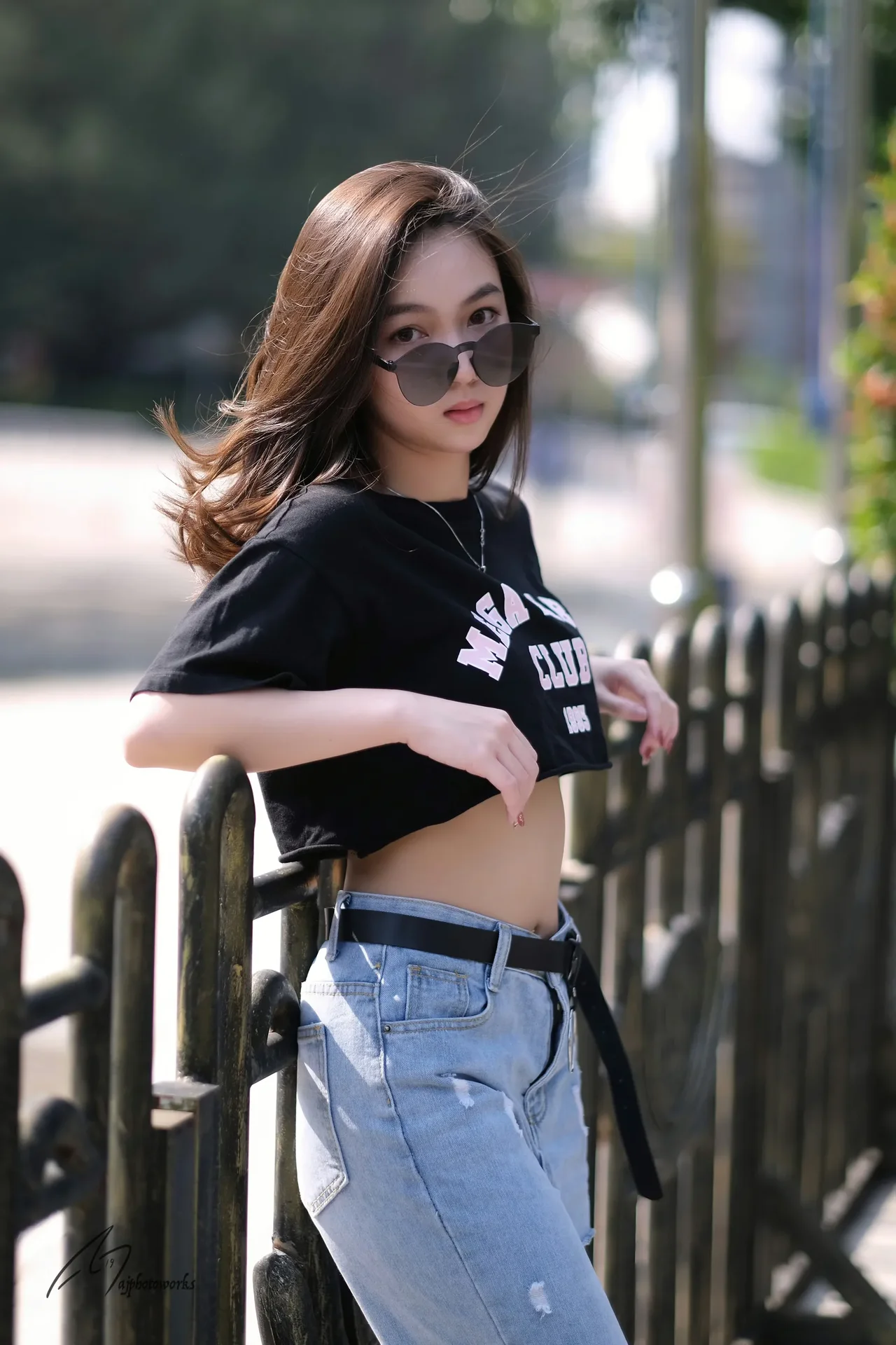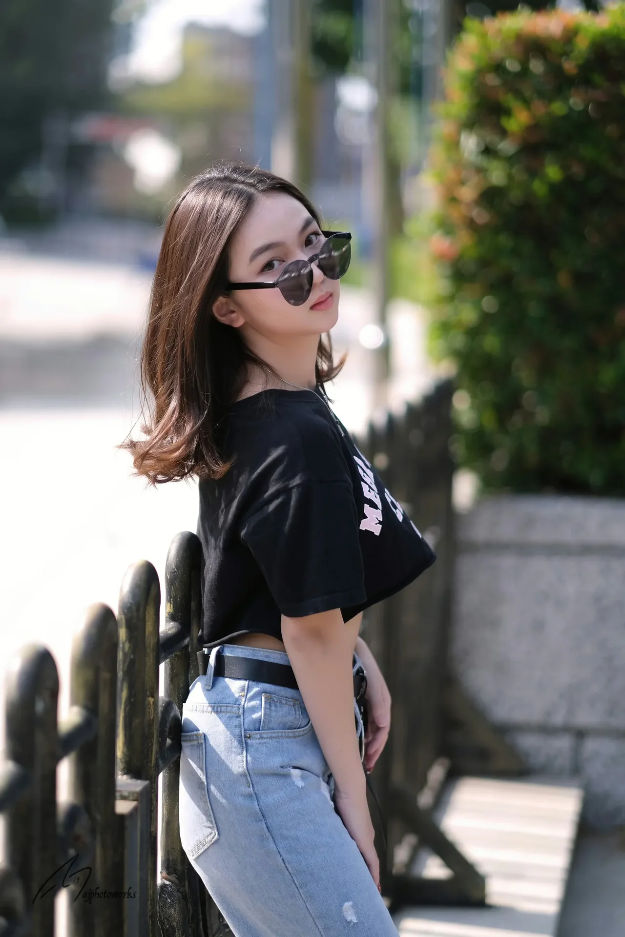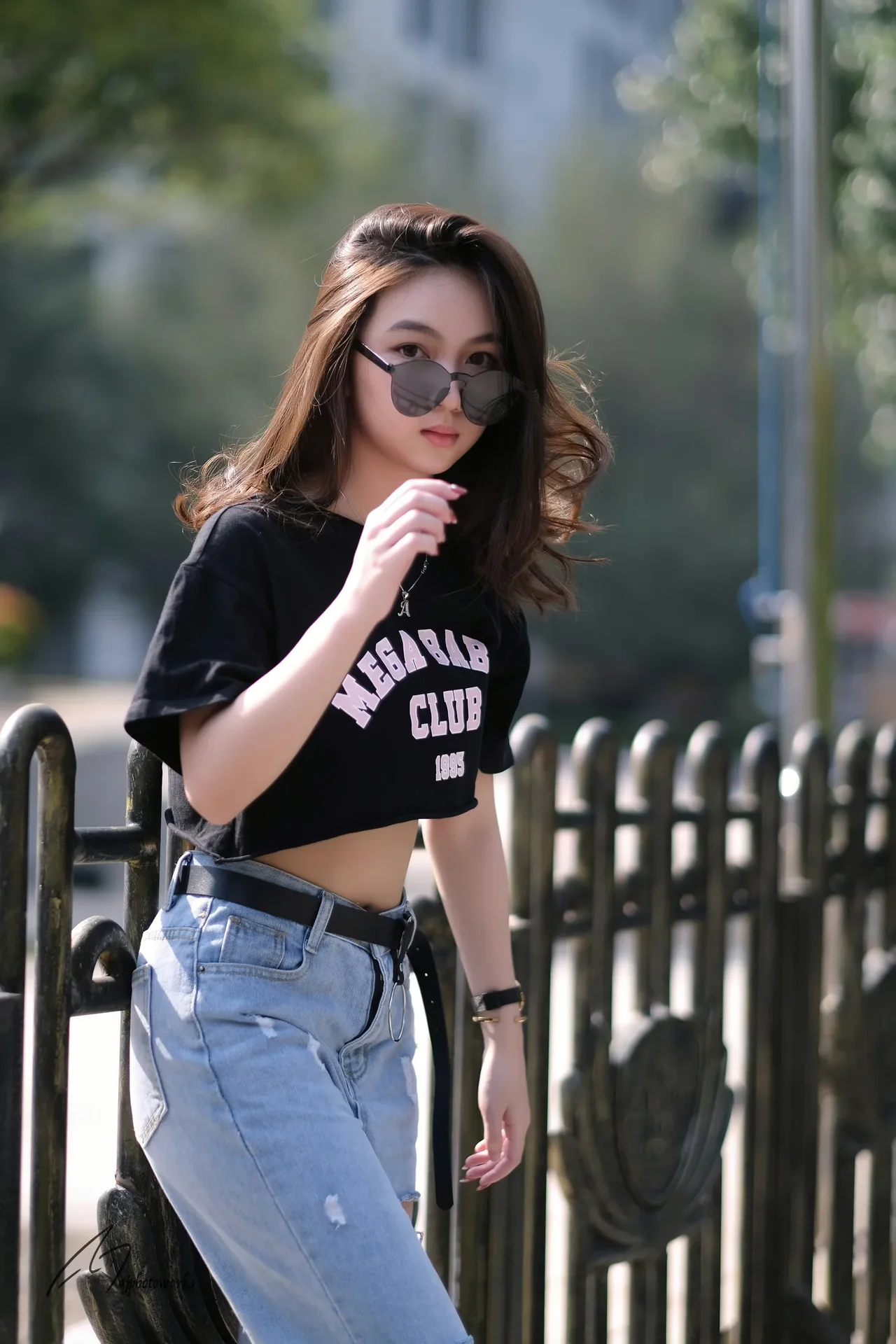 A casual fashion editorial portrait set in an urban park, featuring a woman wearing a black cropped t-shirt, ripped denim jeans, and sunglasses, styled with urban greenery and natural daylight.