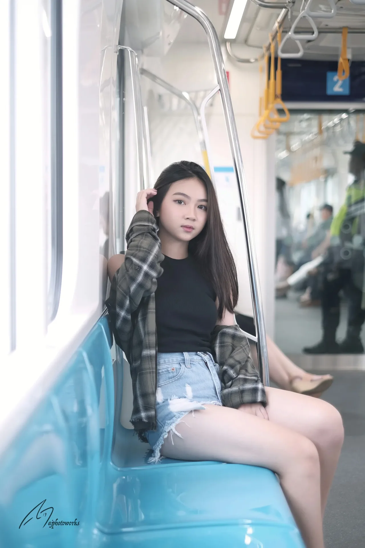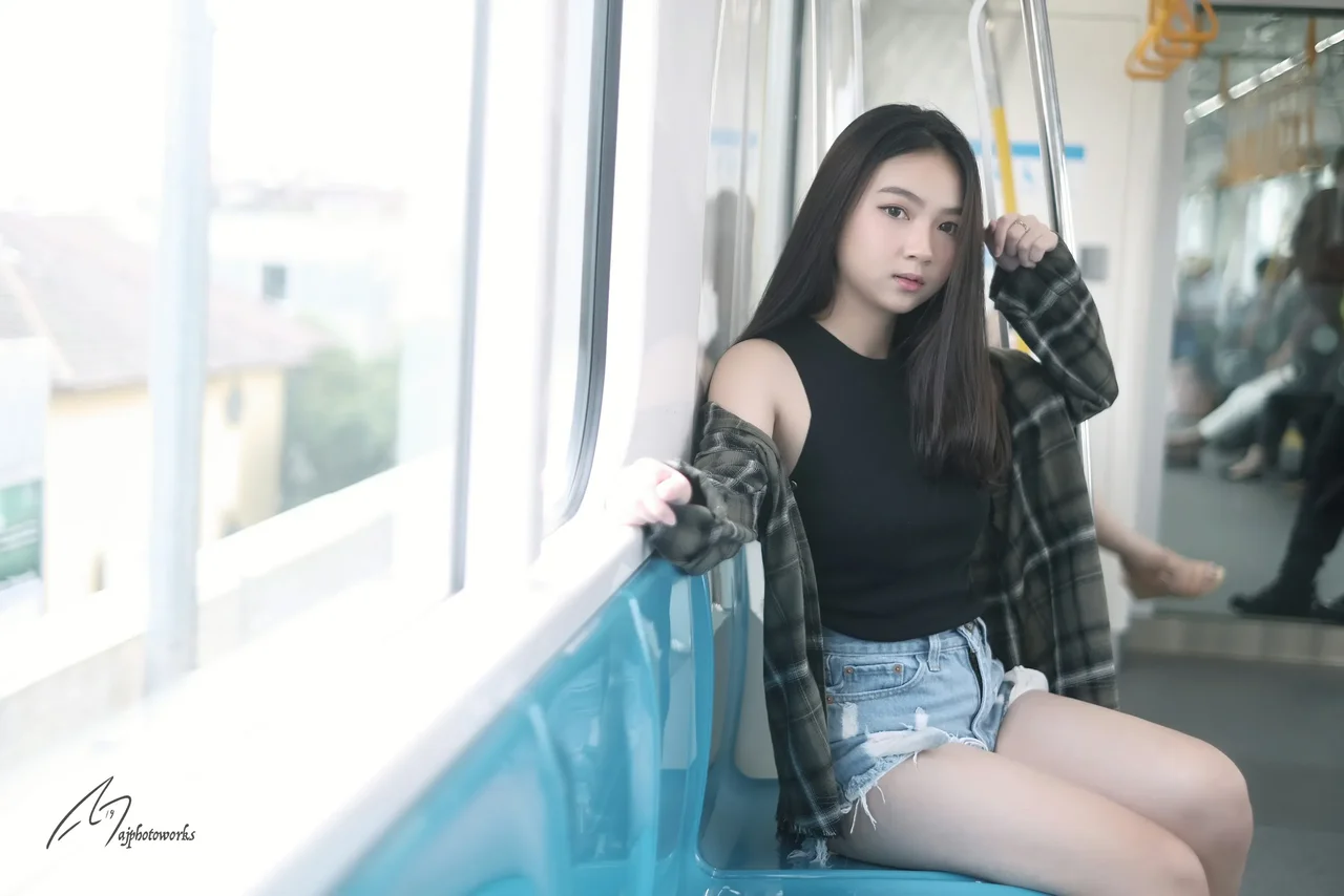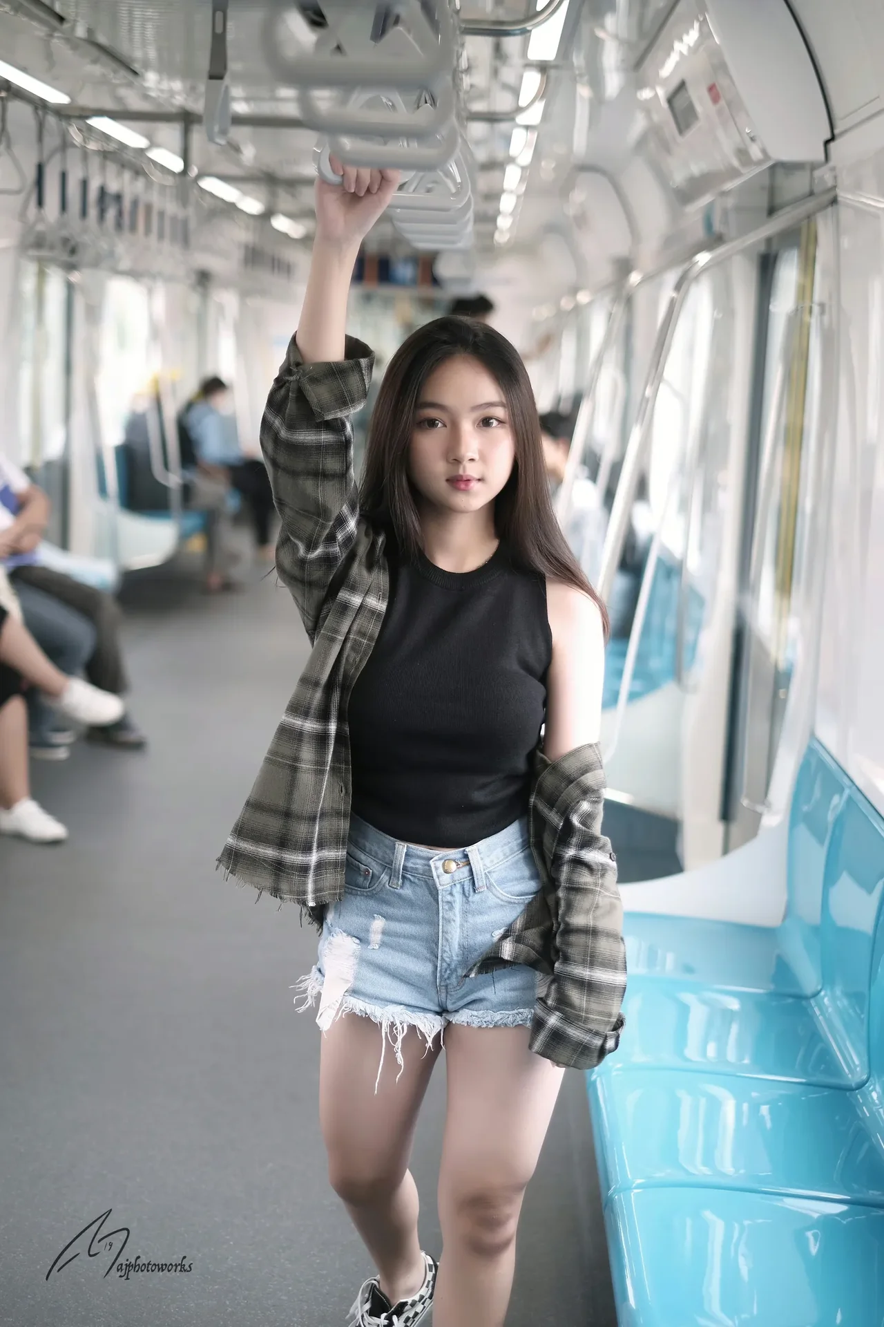 A young woman in a black sleeveless top, frayed denim shorts, and a checkered jacket poses elegantly inside a modern blue subway car, blending urban transit elements with street fashion.
