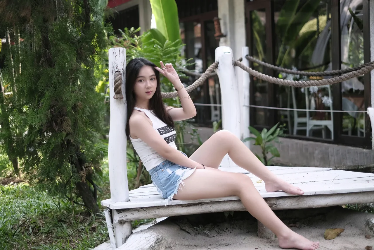 A blend of casual chic and natural serenity in a sunlit outdoor portrait.