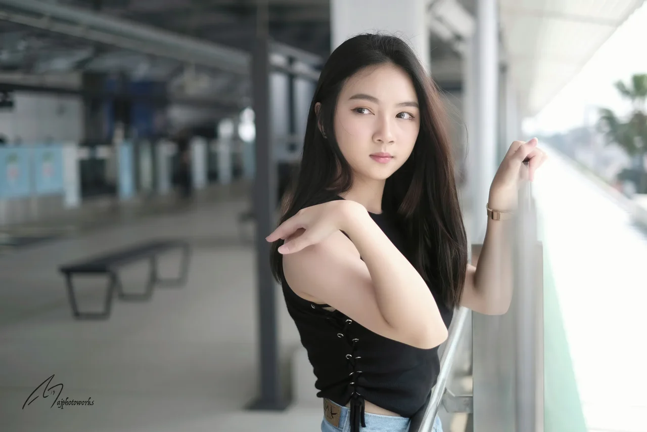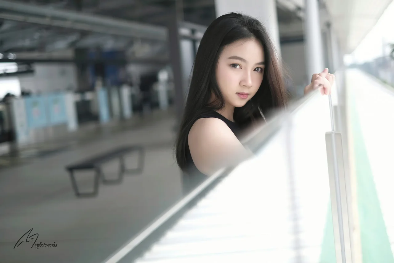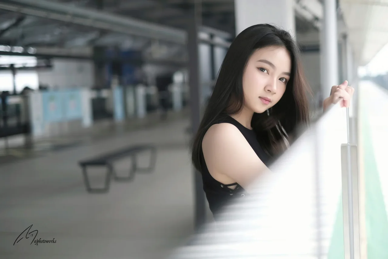 A contemplative moment captured in an urban transit hub, blending fashion and environmental storytelling.