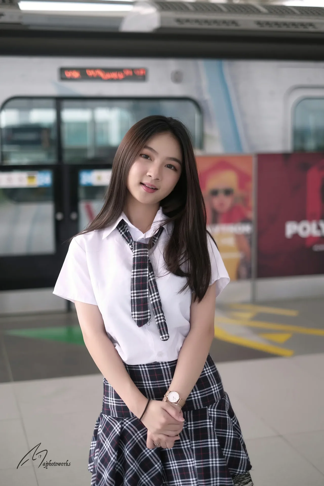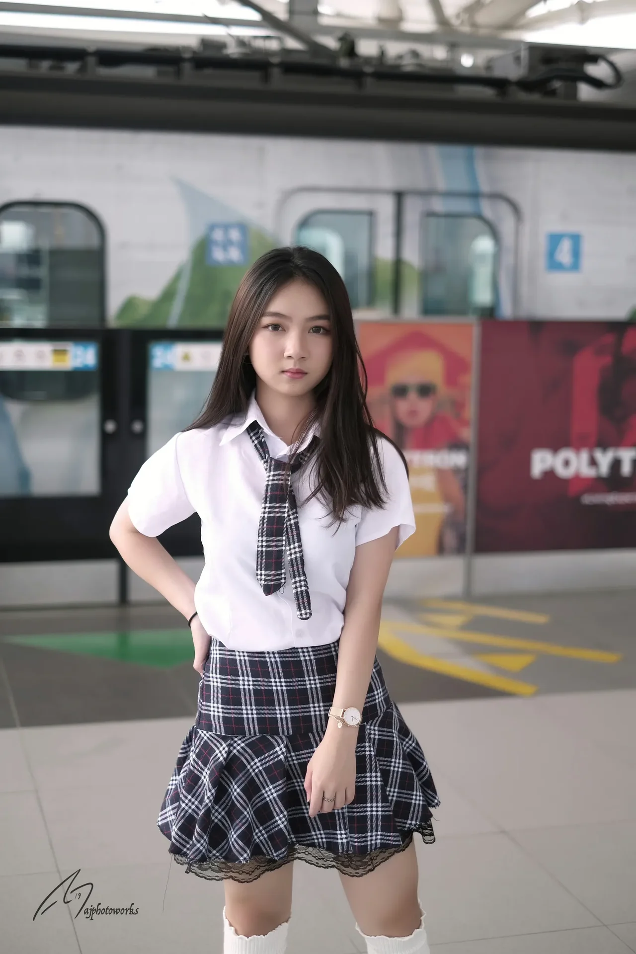 A vibrant portrait in a train station featuring a school uniform with playful accessories.