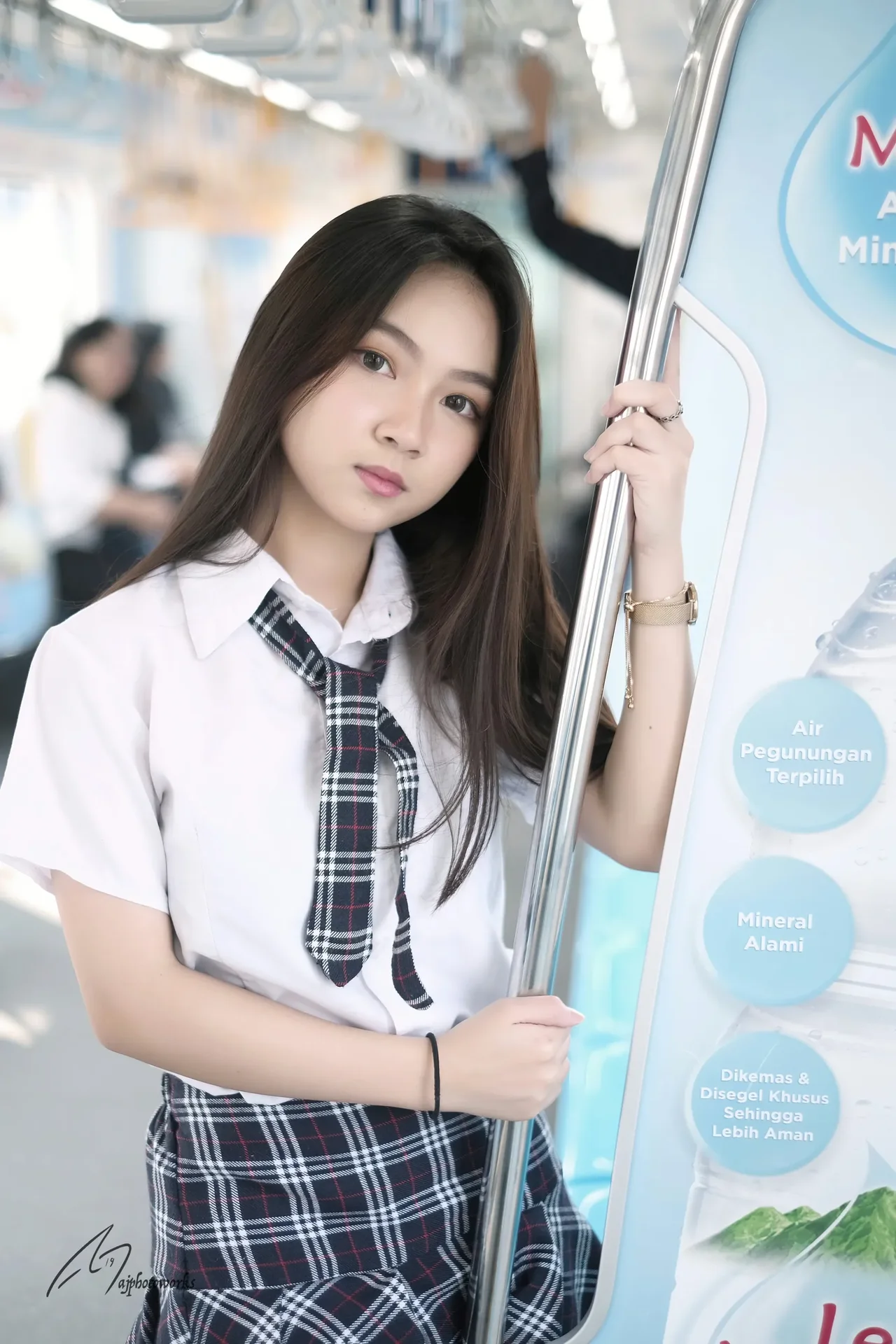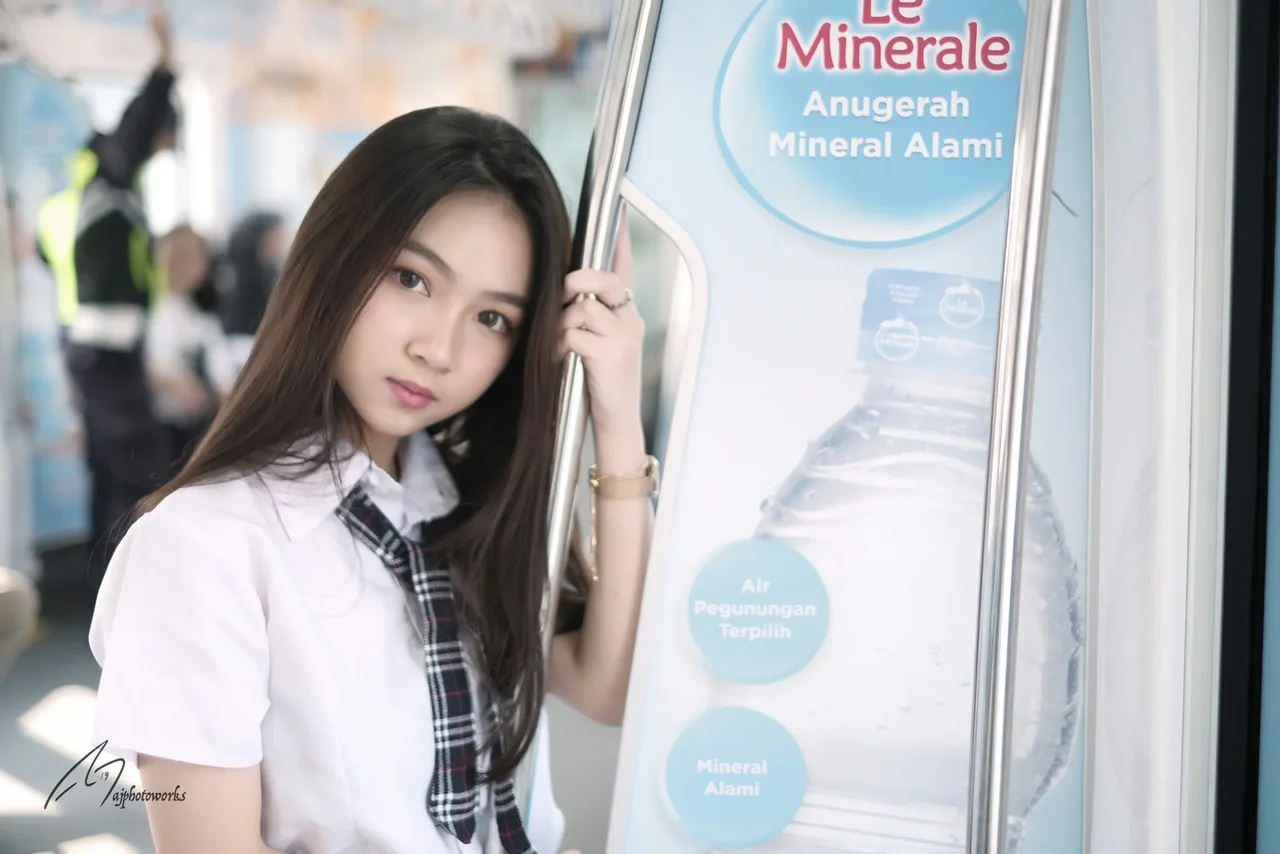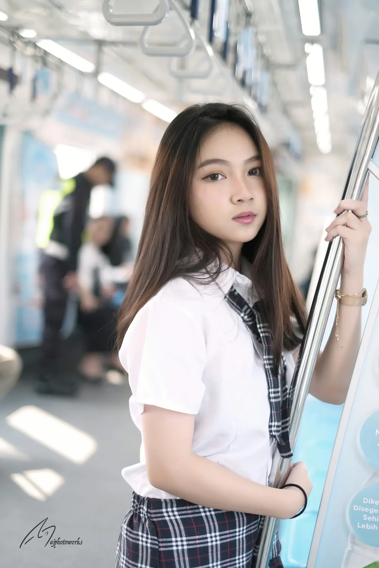 A young woman in a traditional school uniform stands confidently against a public subway backdrop, blending candid travel photography with fashion elements.