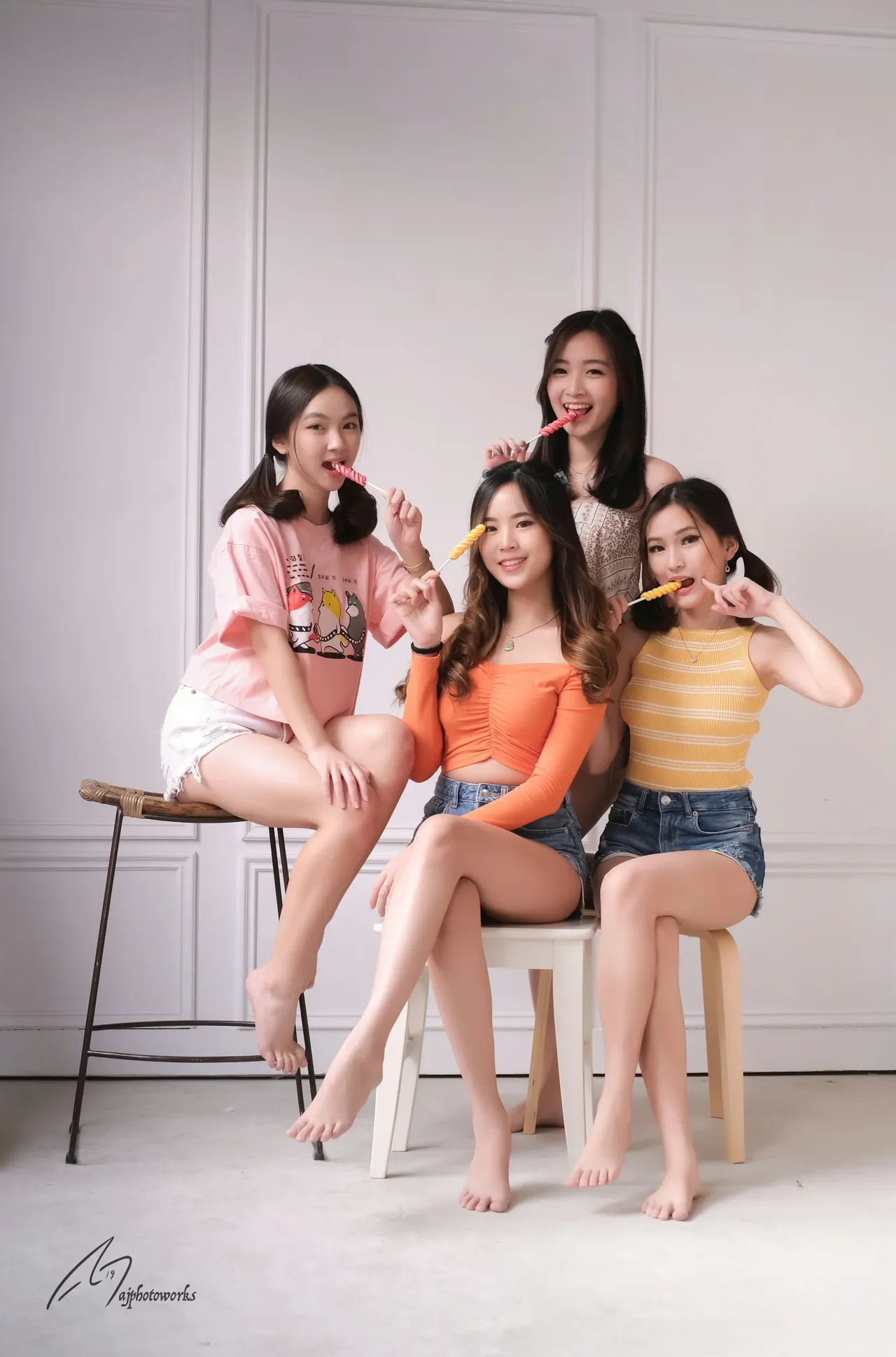 Youthful energy meets playful fashion, capturing four models in casual denim and pastel ensembles enjoying a sweet moment with candy sticks and whimsical gestures.
