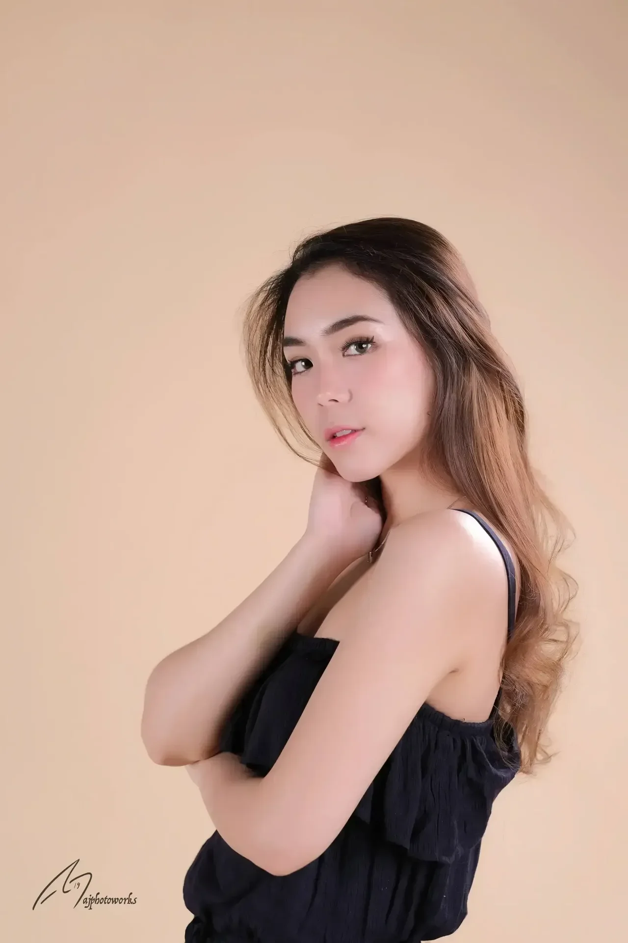Elegant studio portrait showcasing a confident woman in a black ruffled dress, with warm and cool lighting contrasts and minimalist setup.