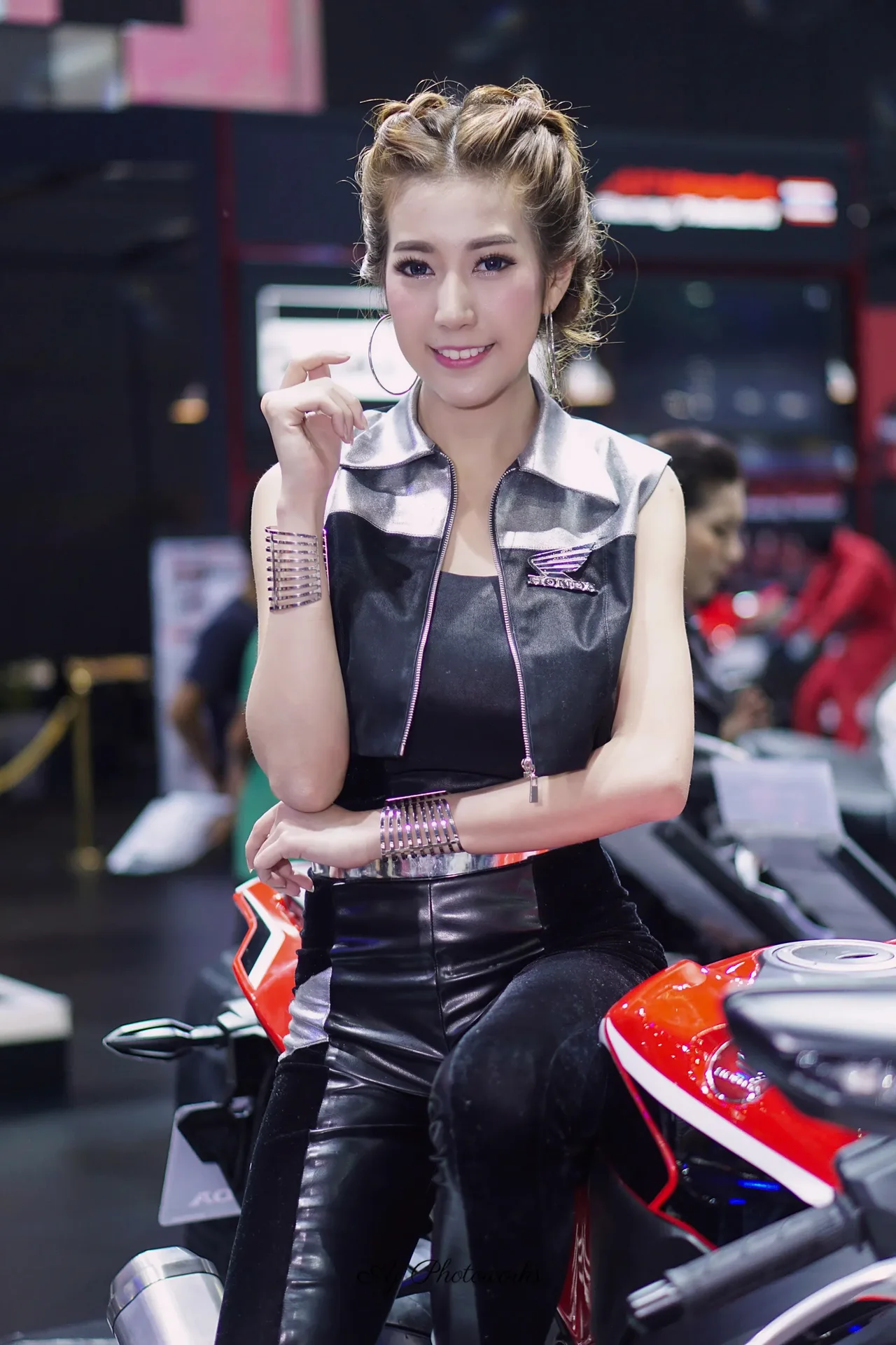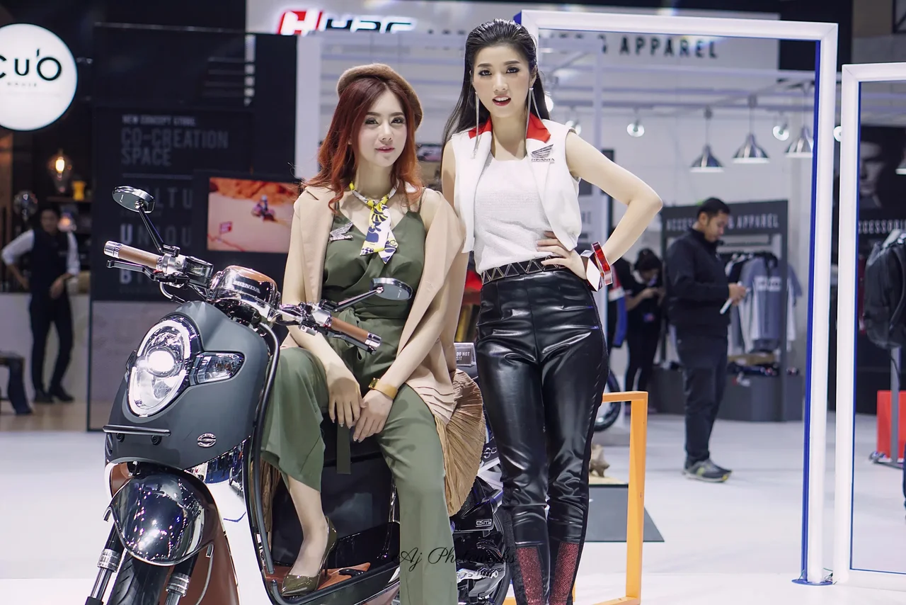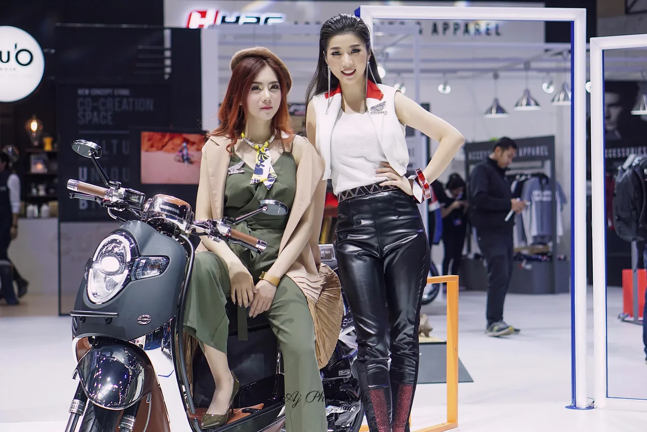 Honda-inspired fashion meets motorcycle allure at a vibrant event.