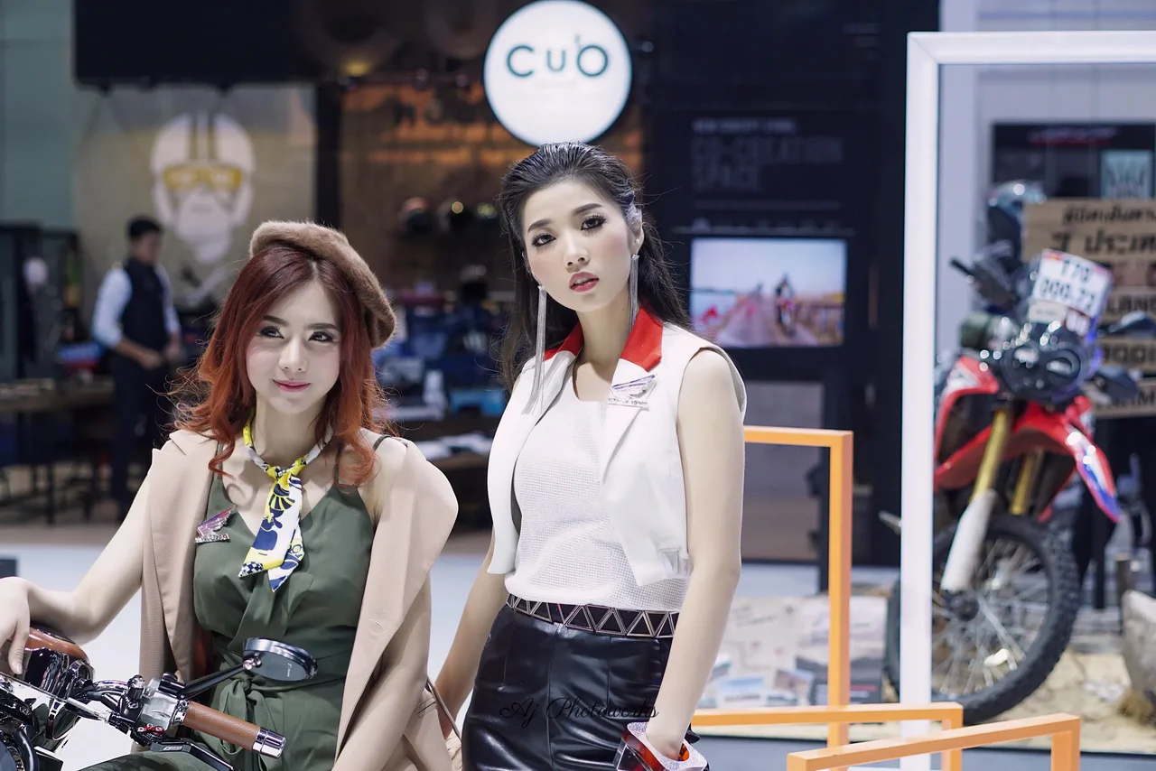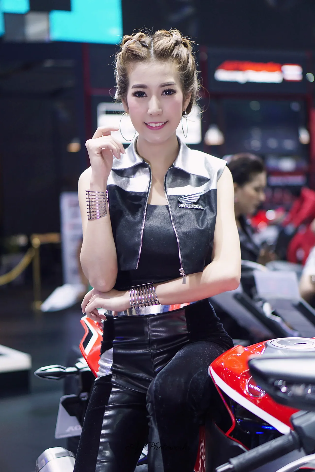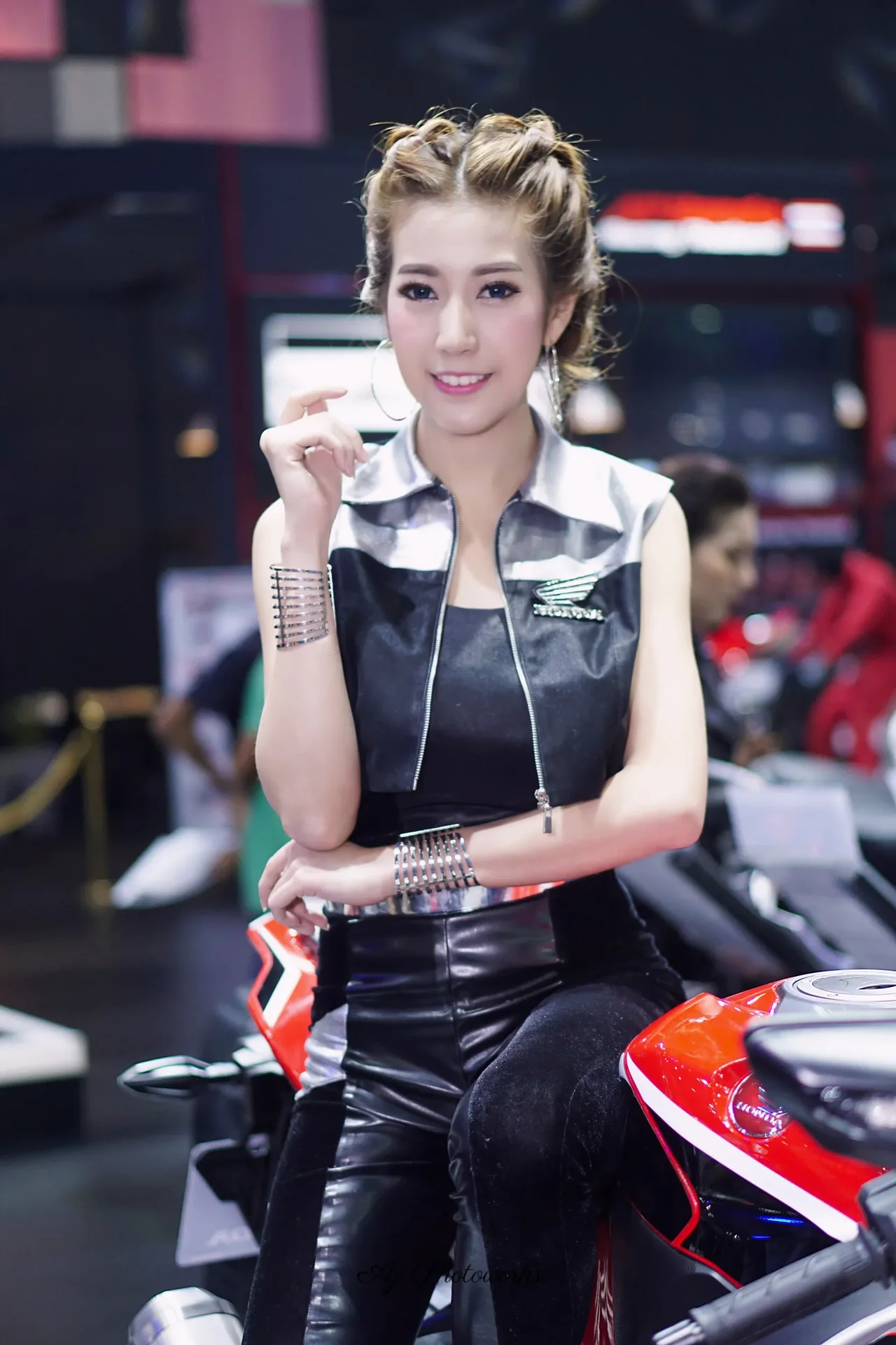 Honda-inspired fashion meets motorcycle allure at a vibrant event.