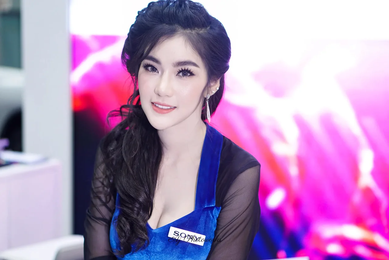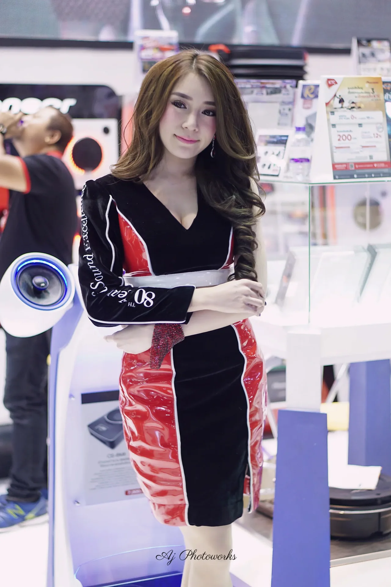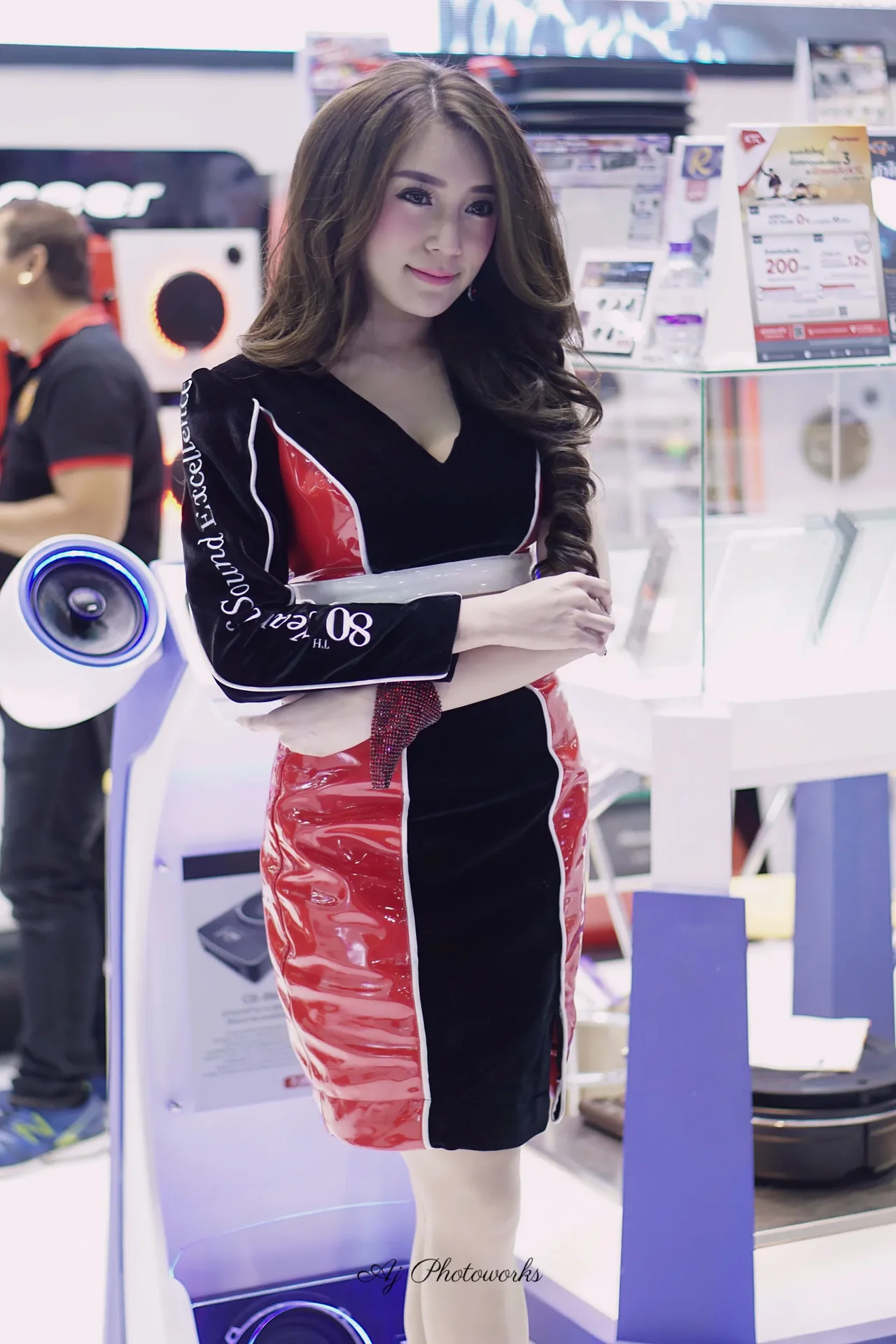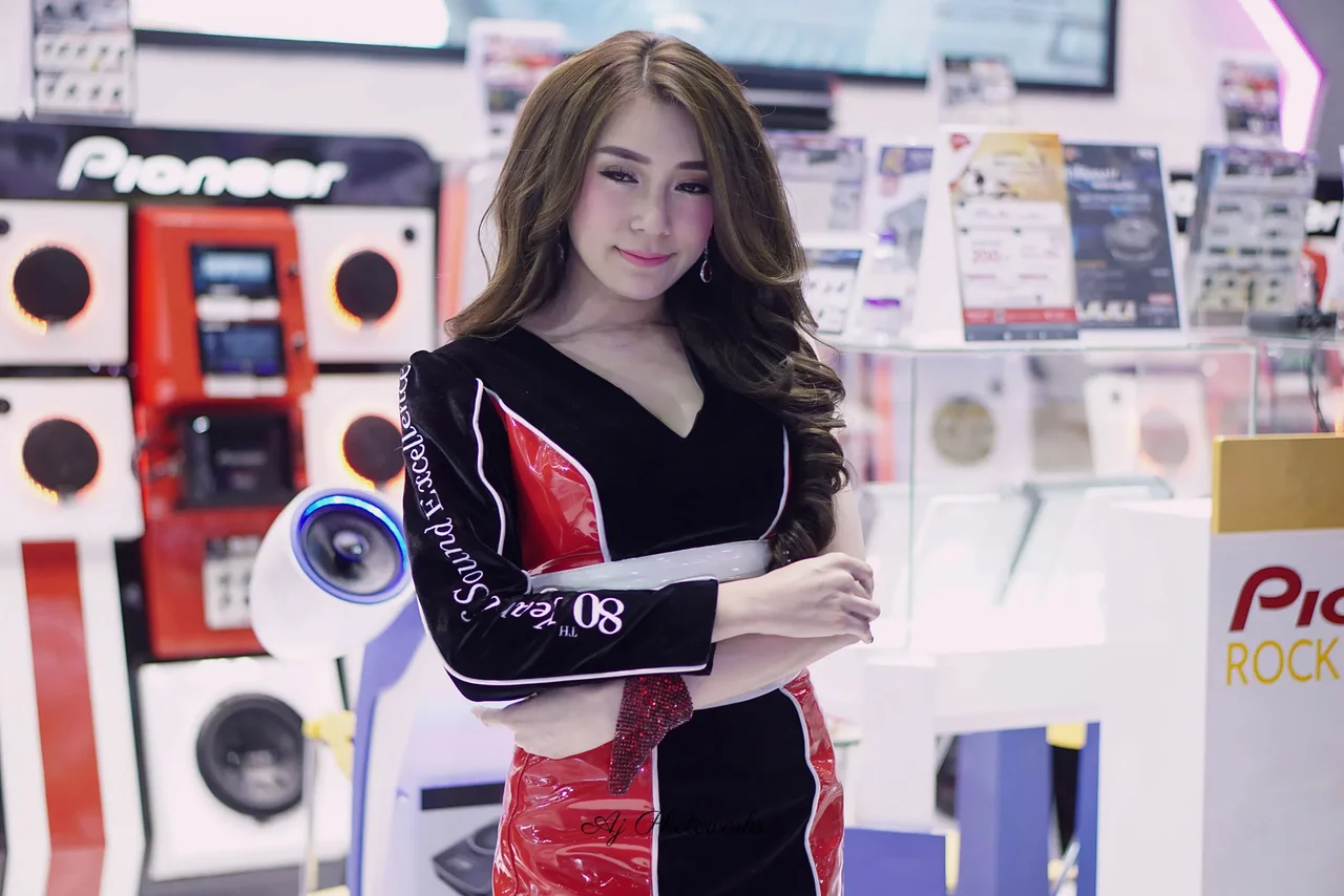 A woman in a blue dress poses at an audio event, with Sony branding prominent in the messy, colorful background. Later, she wears a red and black outfit at a Pioneer-themed exhibit with vibrant displays.