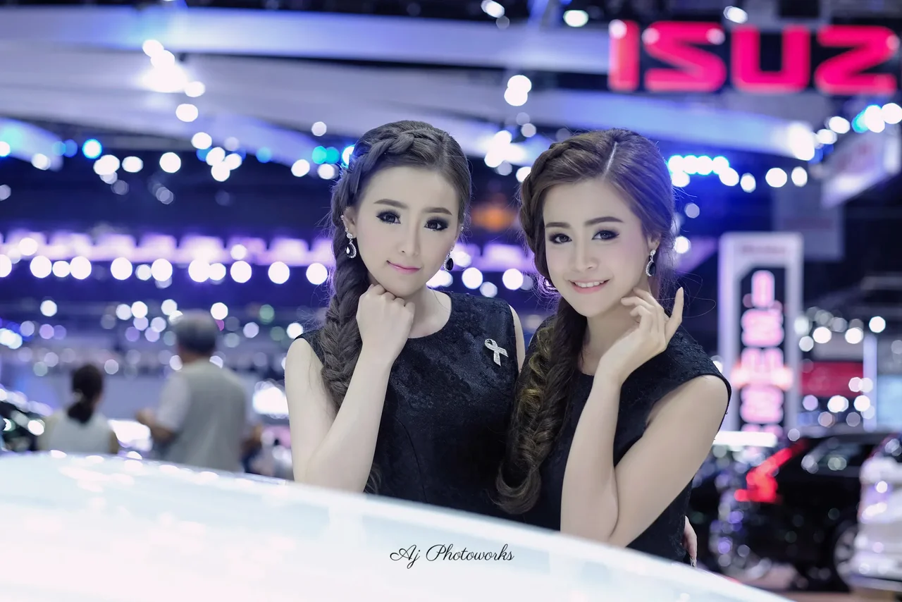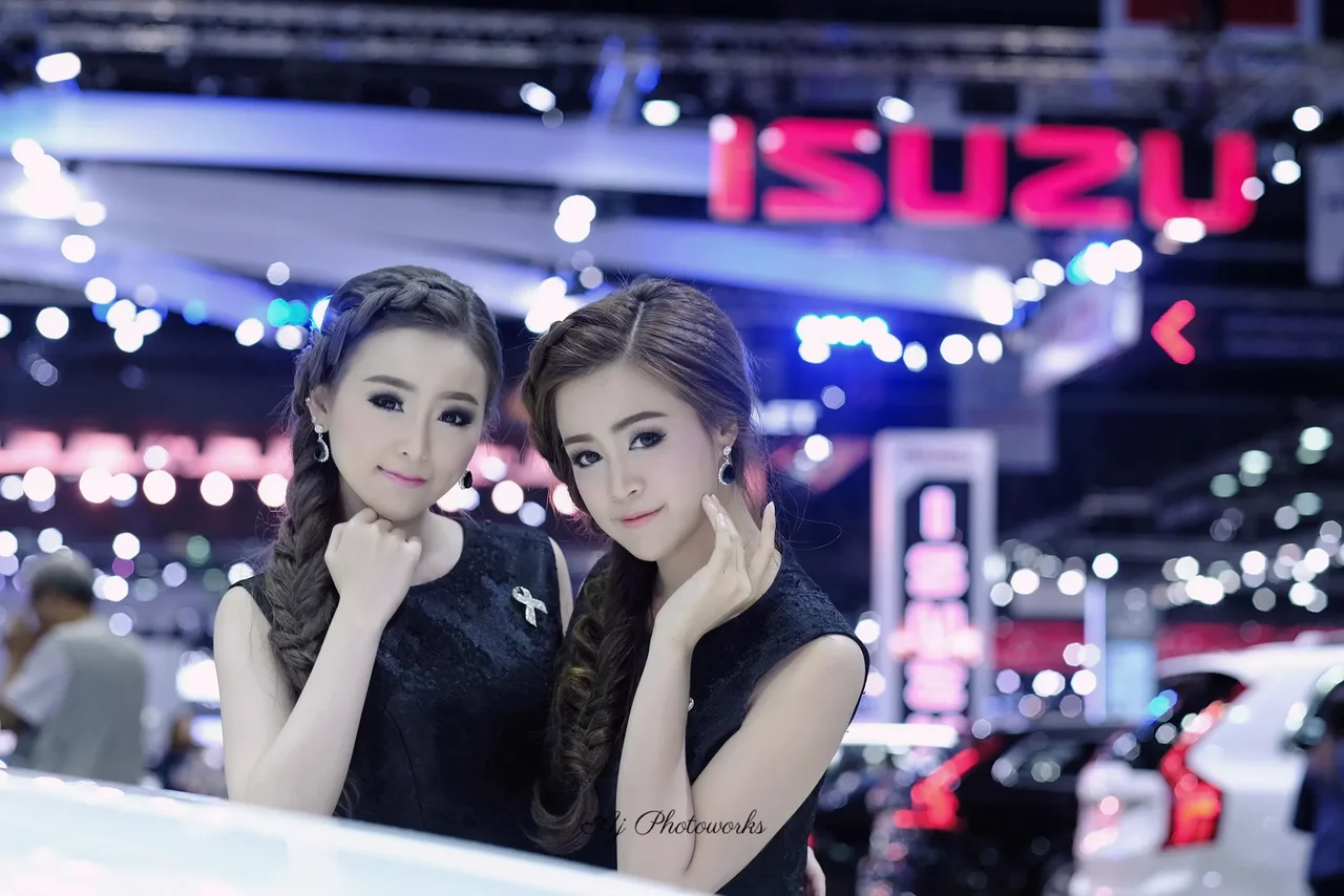 Two models in black floral lace dresses with silver accents pose confidently in front of a white car at an ISUZU auto exhibition, surrounded by vibrant event lighting.