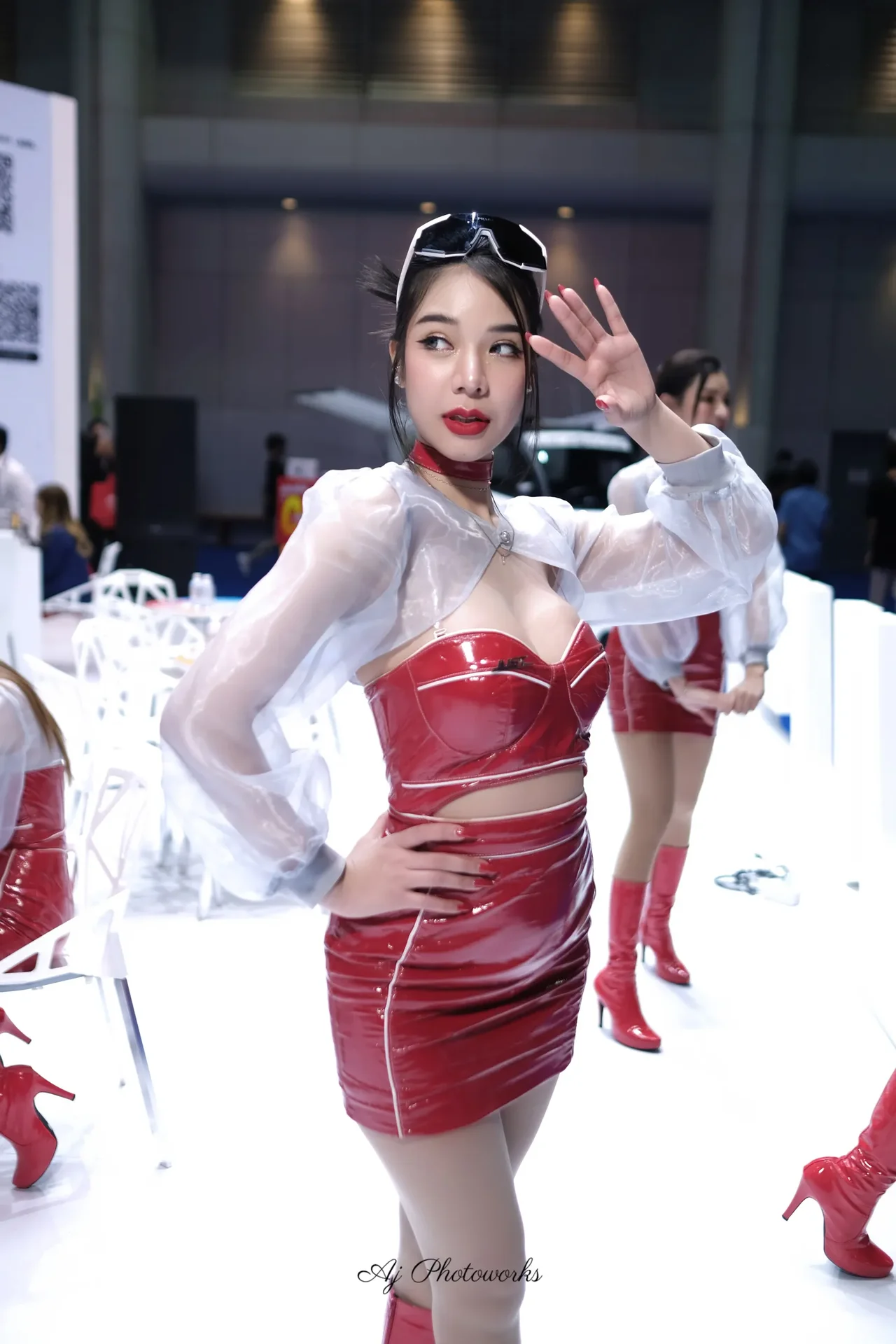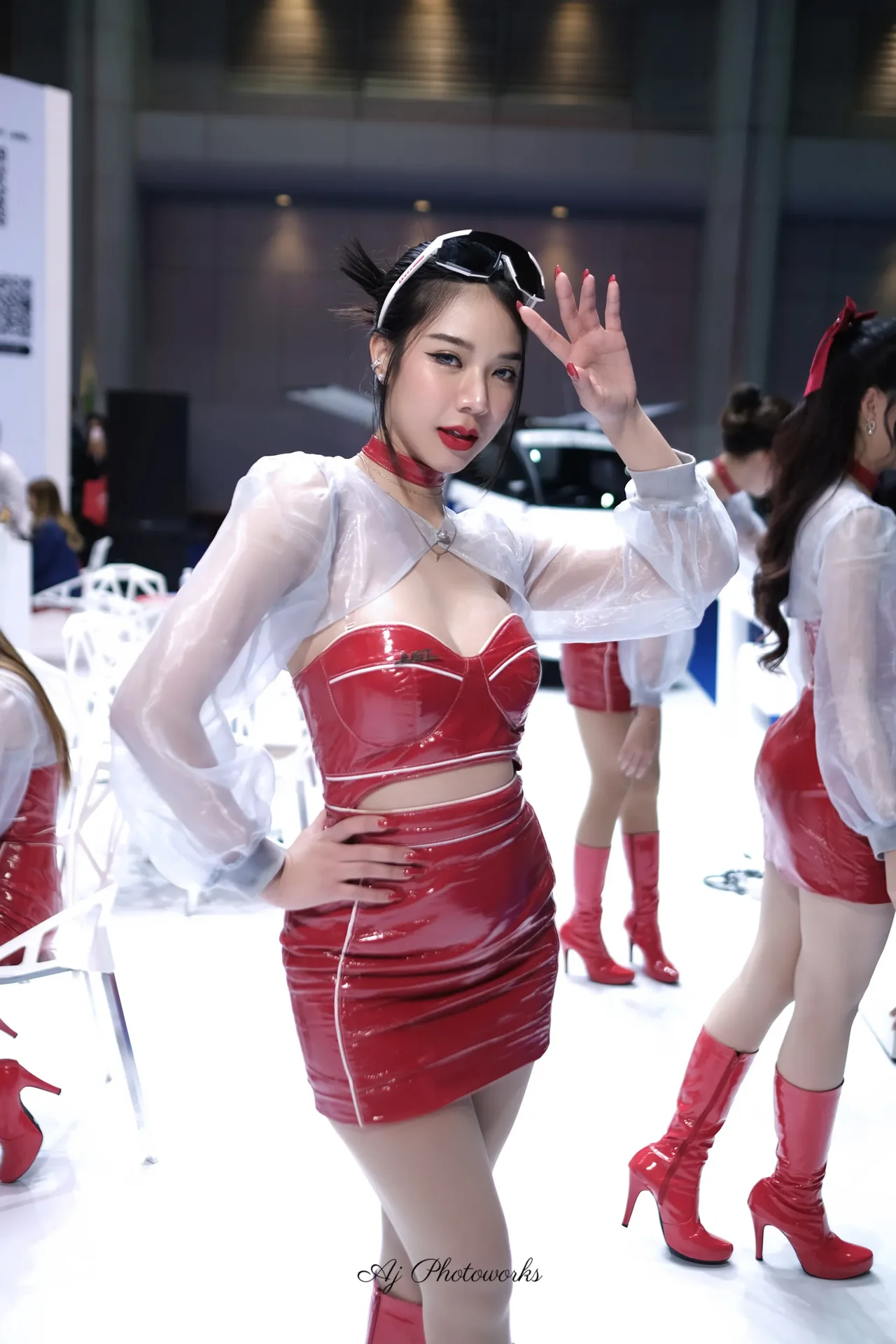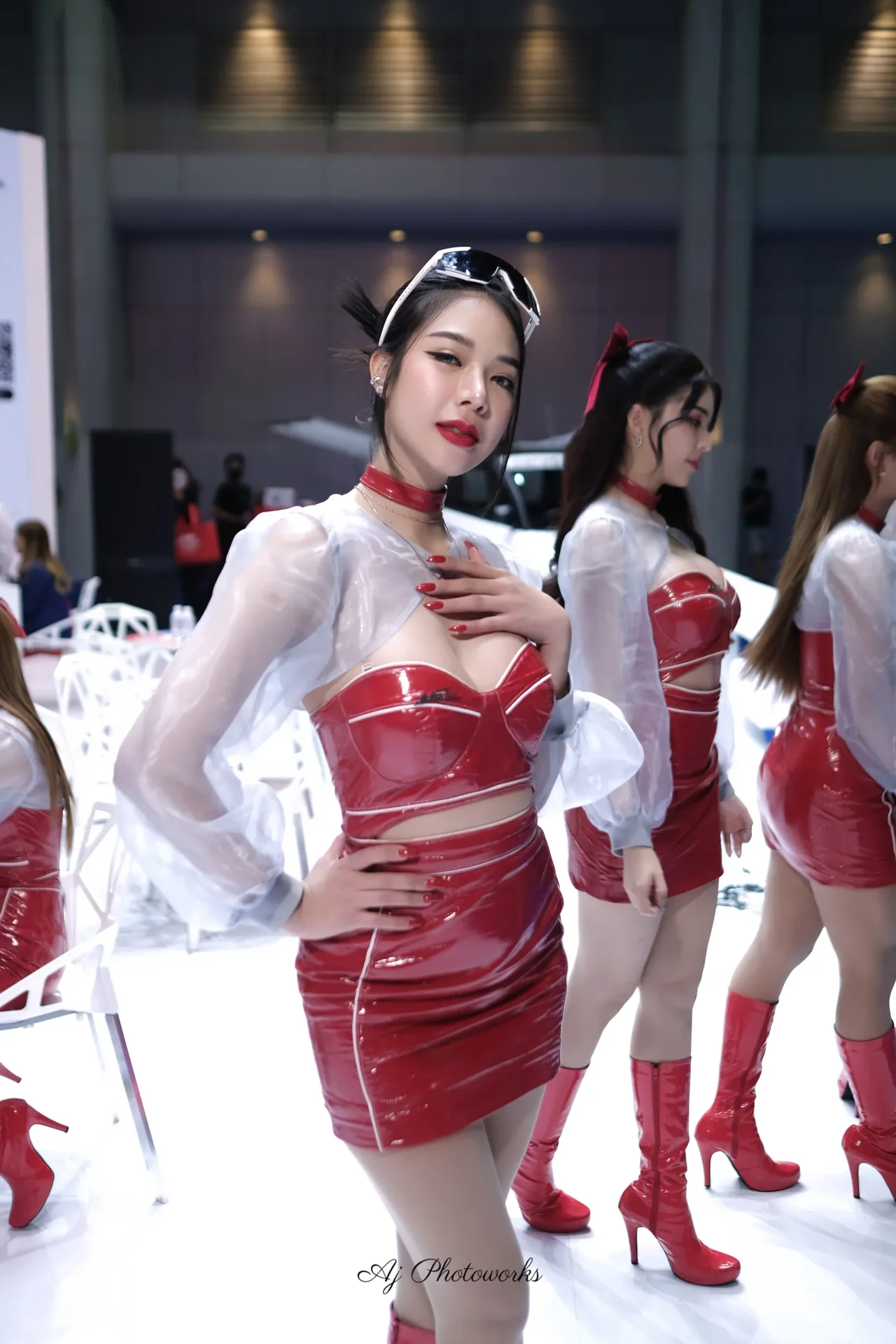 Shiny red latex dresses with sheer white tops and arm compartments, paired with thigh-high red boots, exuding glamour and confidence in an indoor expo setting with pristine white floors and industrial metal railings.