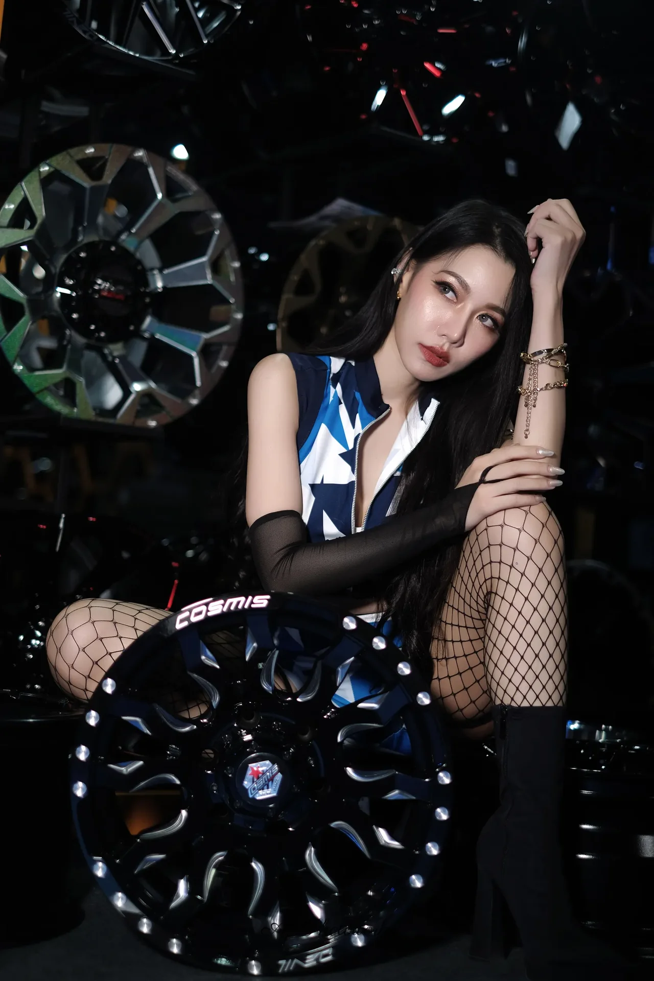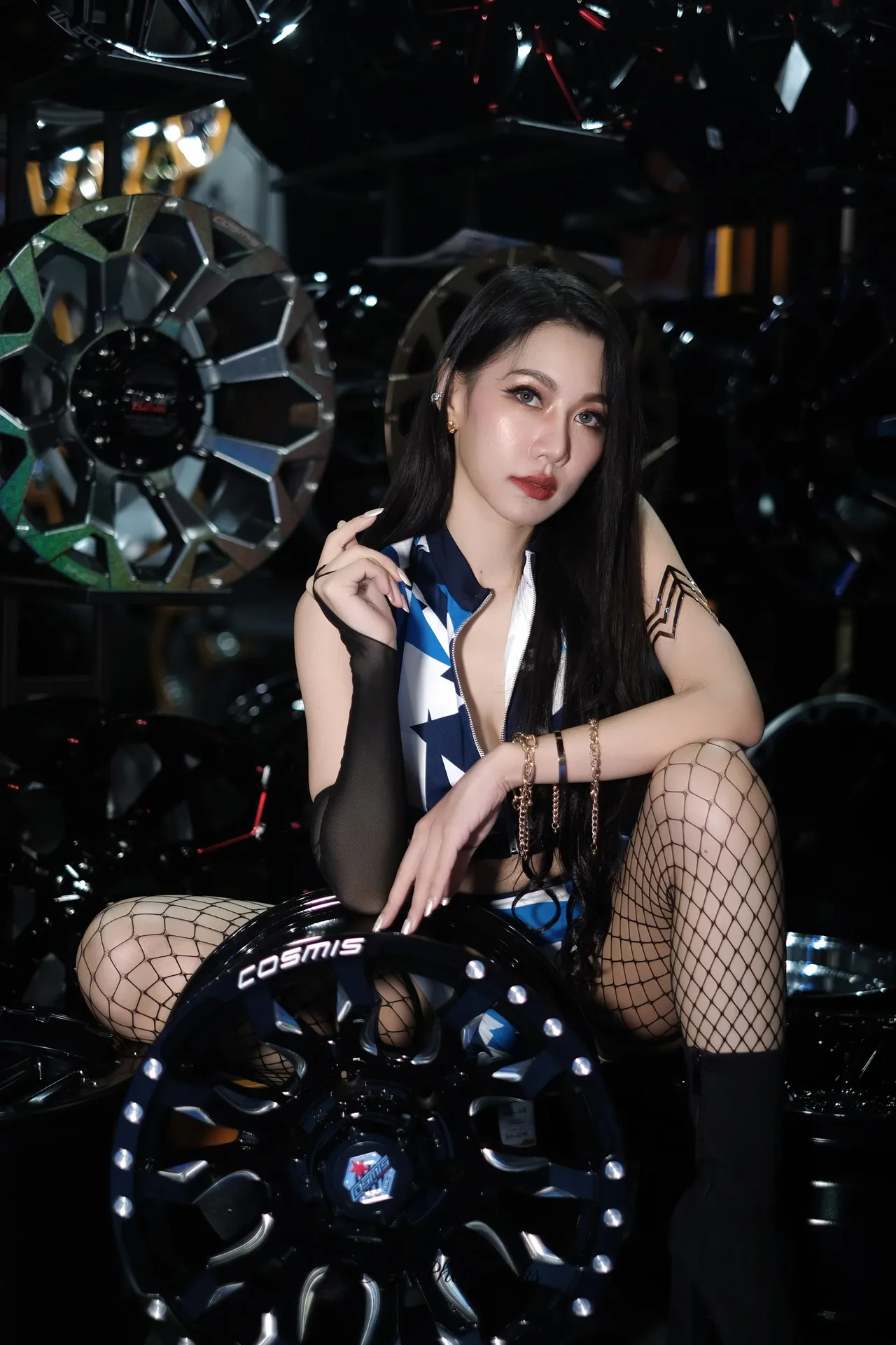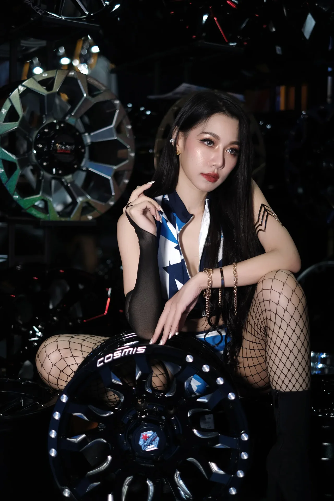 A fusion of edgy fashion and automotive passion, framed in a high-octane automotive sanctuary.