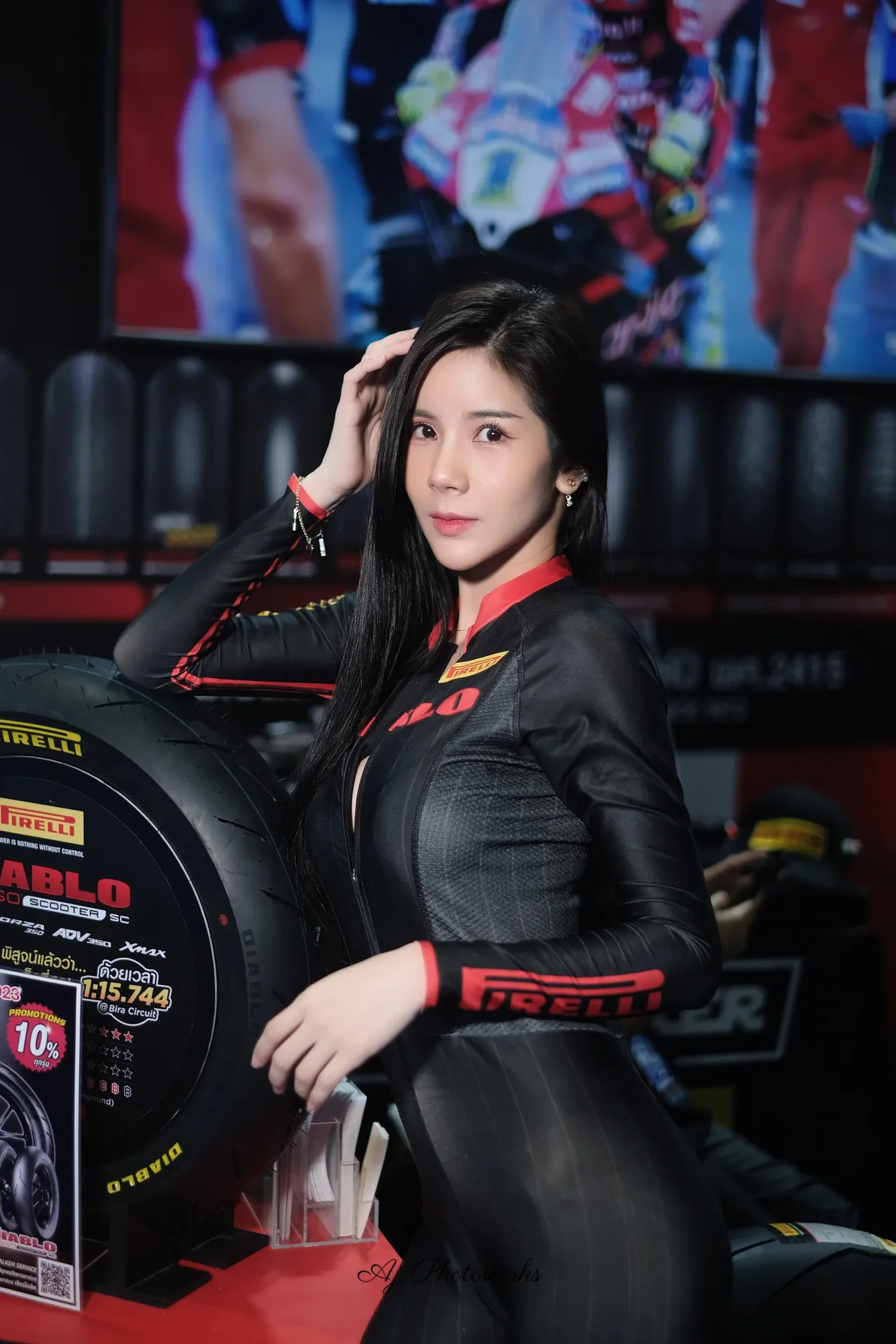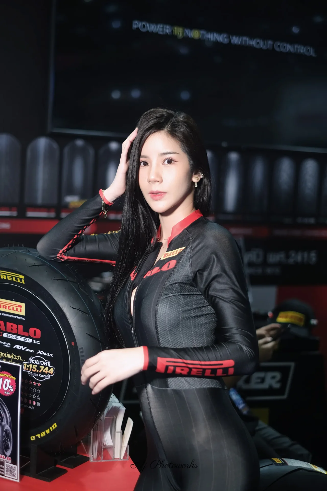 A striking promotional shoot featuring a fashion-forward individual in a high-performance racing jumpsuit, blending motorsport branding with bold aesthetics.
