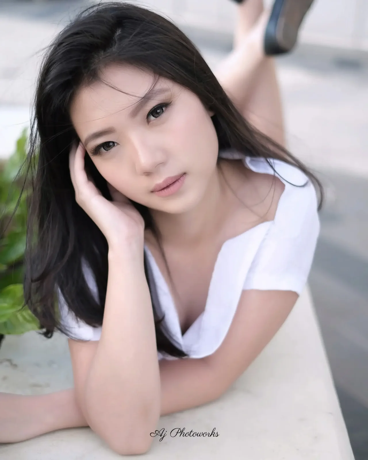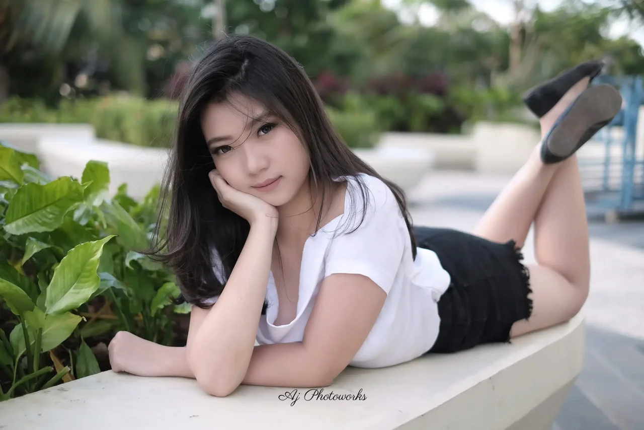 A fashion-focused portrait of a model in a white top and black frayed shorts outdoors, capturing natural vibrancy.