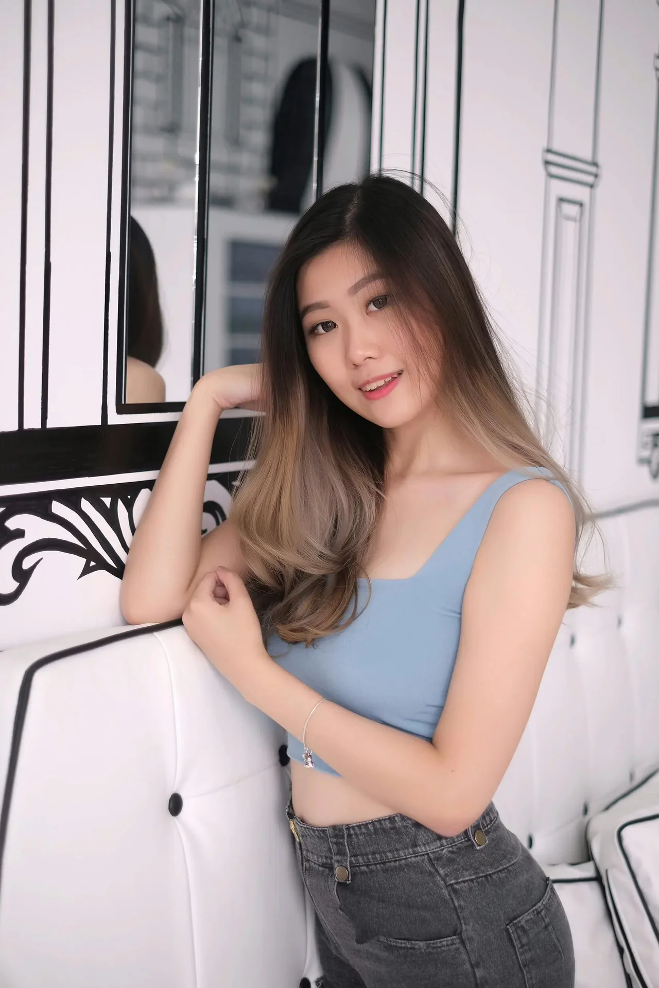 A woman in a light blue tank top and distressed denim shorts poses confidently on a white, tufted studio bench against a wall with black architectural outlines and mirrored panels.