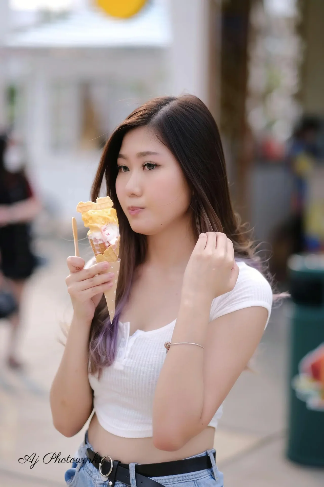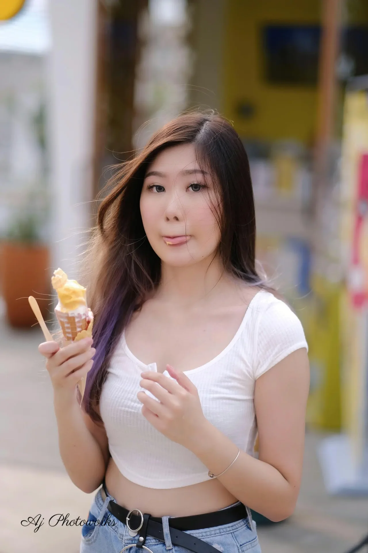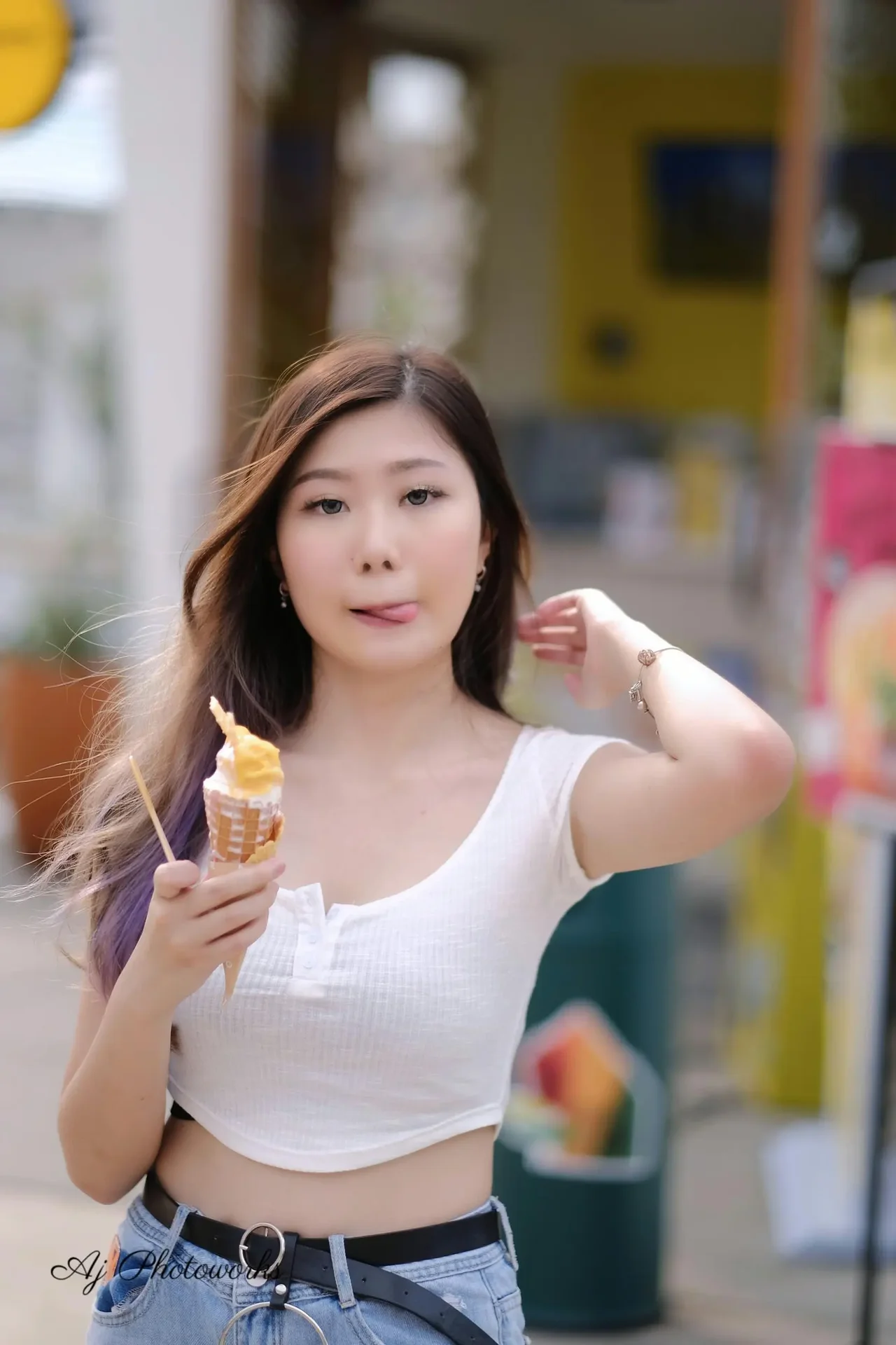 A woman poses playfully with an ice cream cone on a sunny street, wearing a casual white crop top and denim shorts.