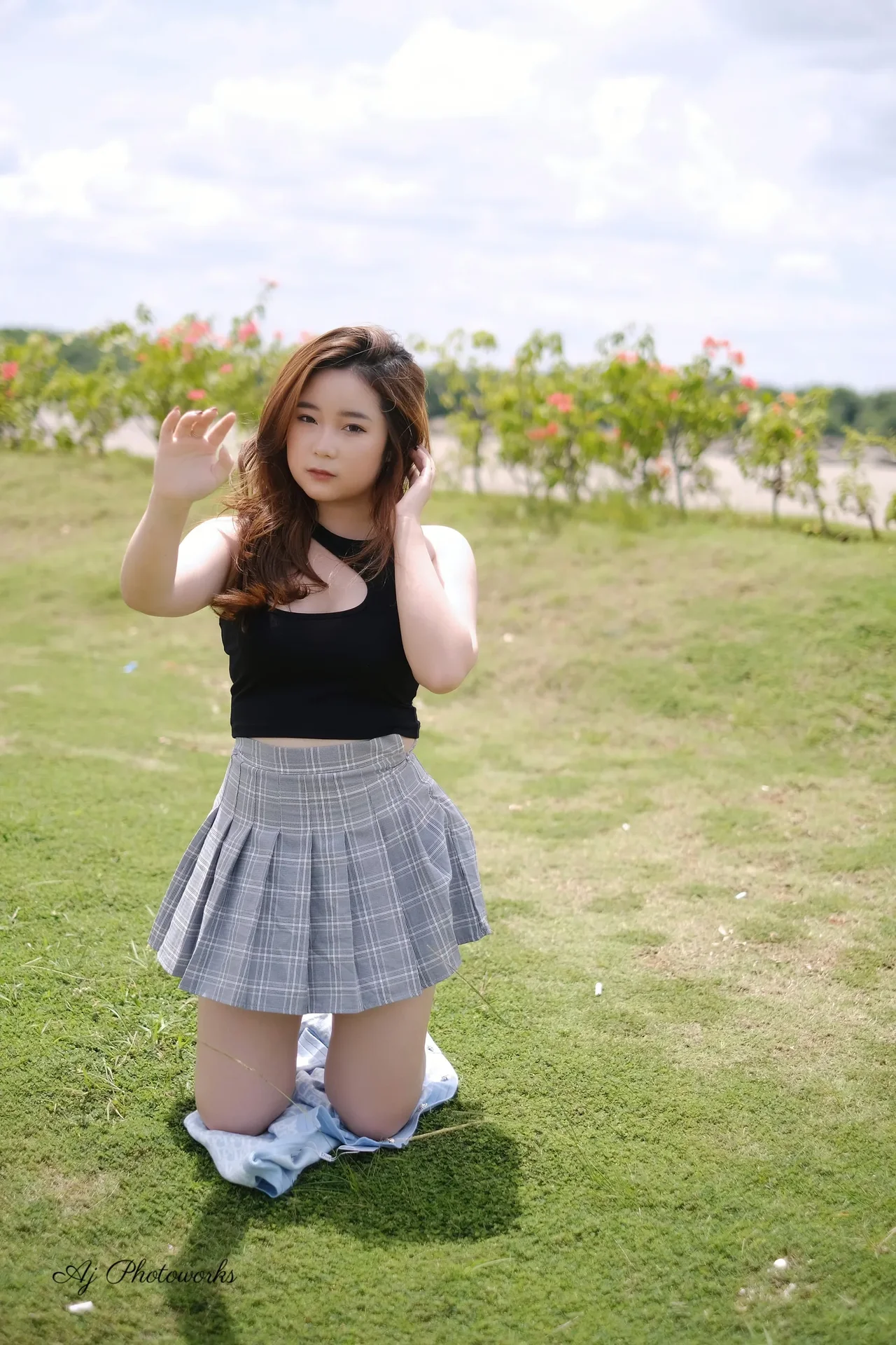 A fashionable pose with a blend of natural elements and stylish attire in a serene outdoor setting.