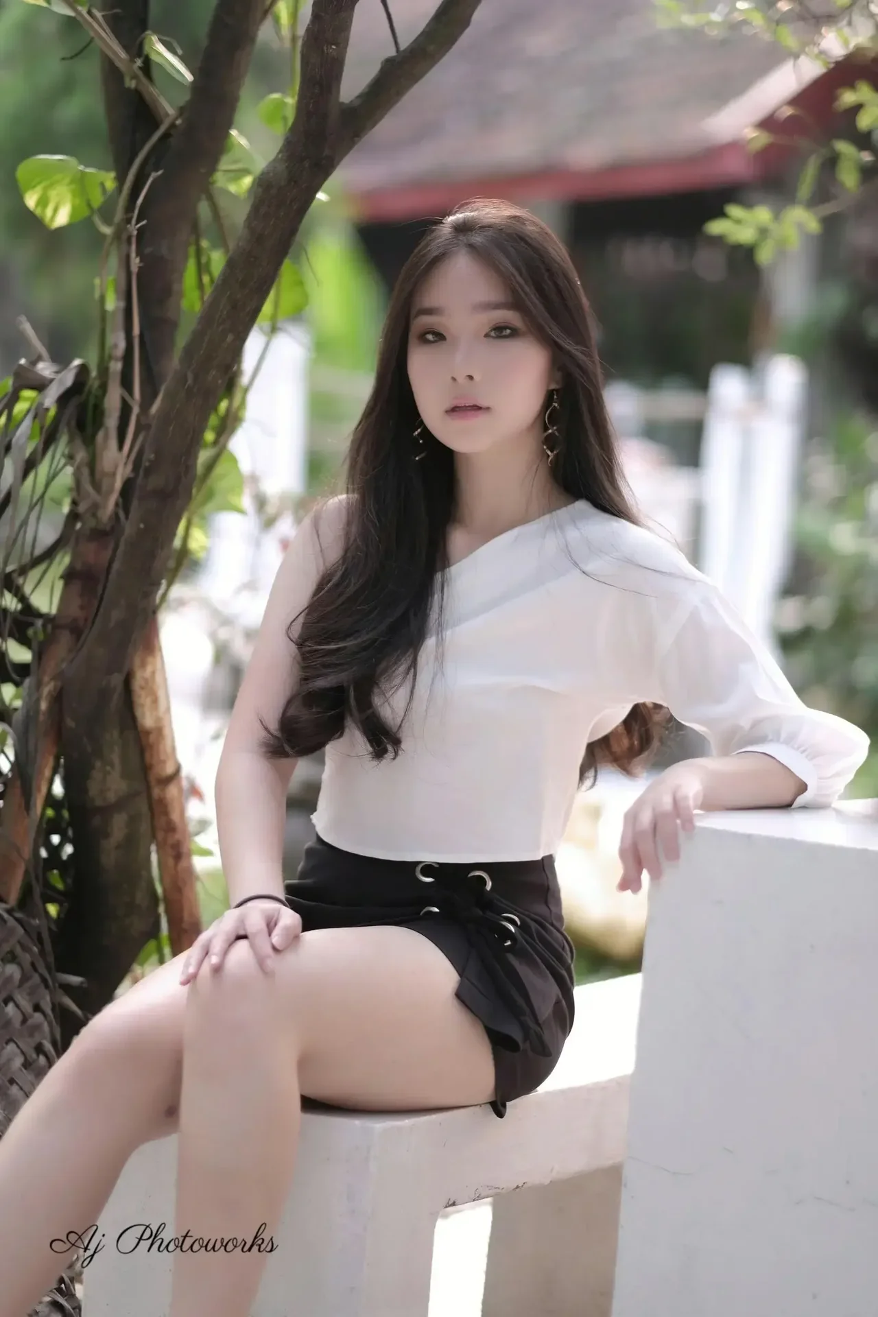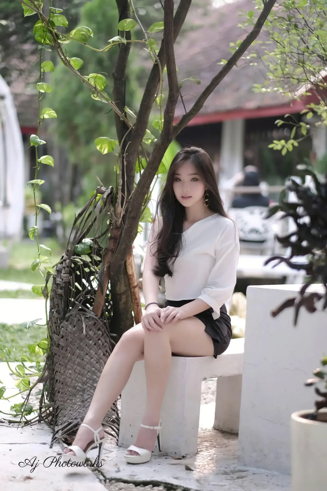A serene outdoor portrait of a woman in a white crop top and black lace-up skirt, surrounded by lush greenery under warm natural light.