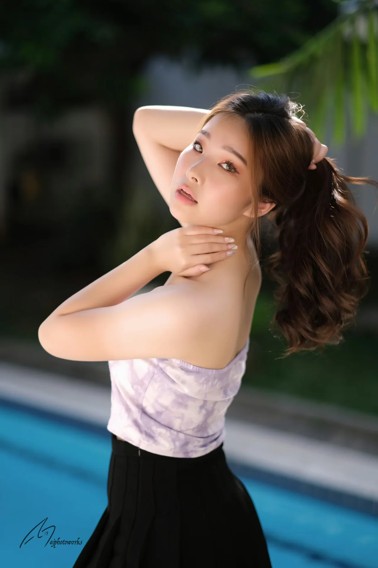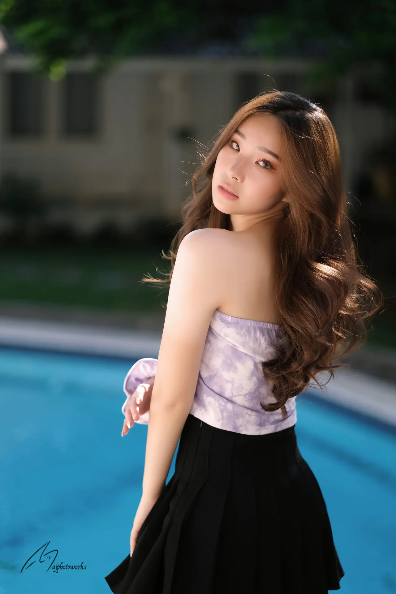 A striking portrait of a young woman with flowing brunette hair, adorned in a chic purplish tie-dye crop top and a sleek black pleated skirt, standing elegantly by a shimmering pool with a sophisticated backdrop of greenery and a building in the distance.