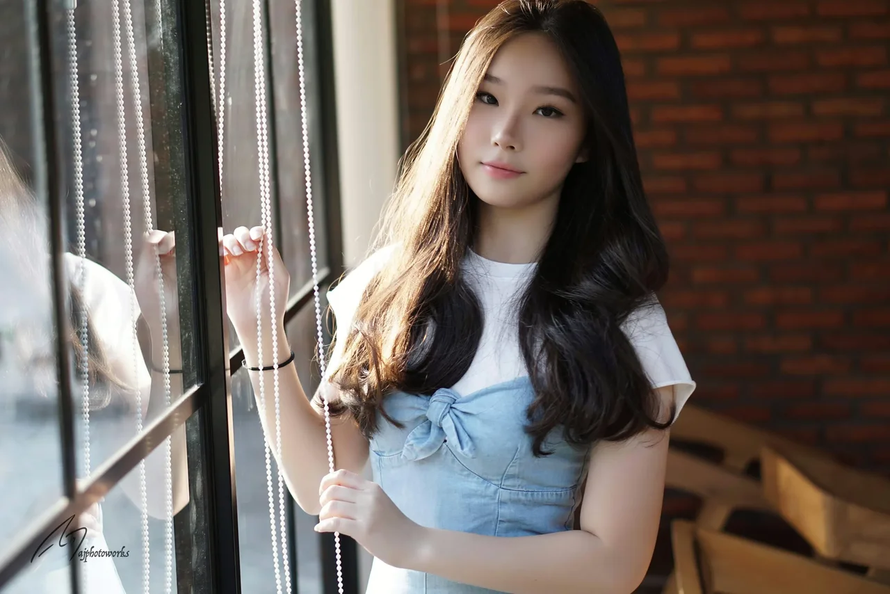 Elegance in Motion: A modern staircase serves as the backdrop for a woman's poised grace, blending casual fashion with architectural allure.