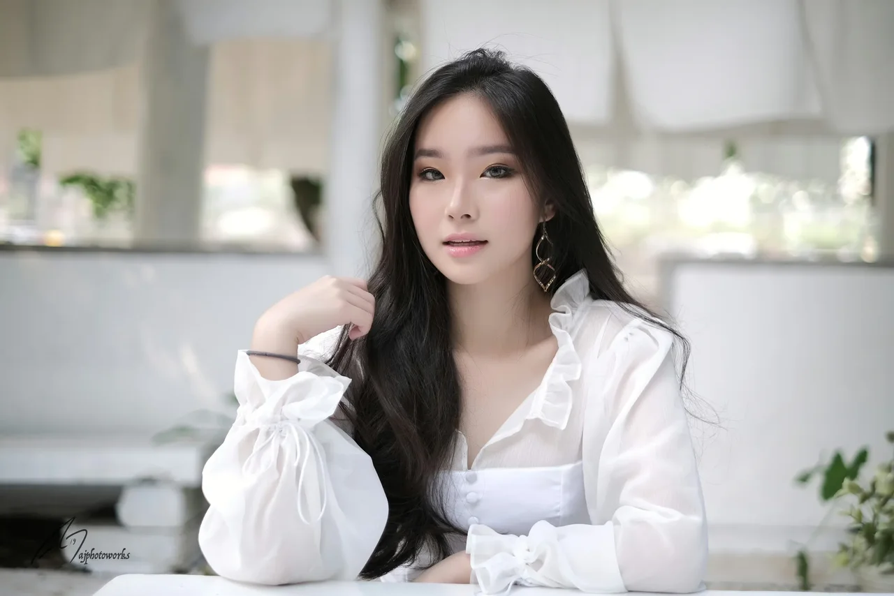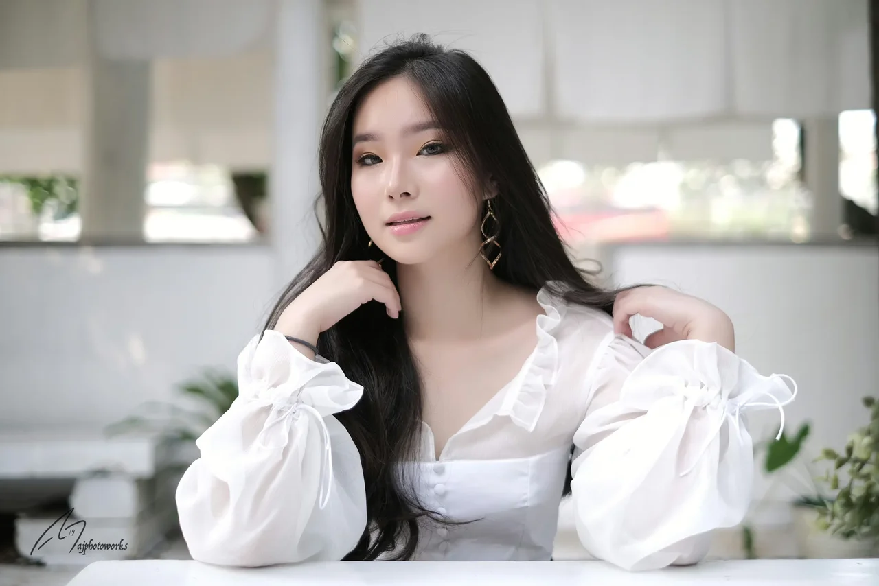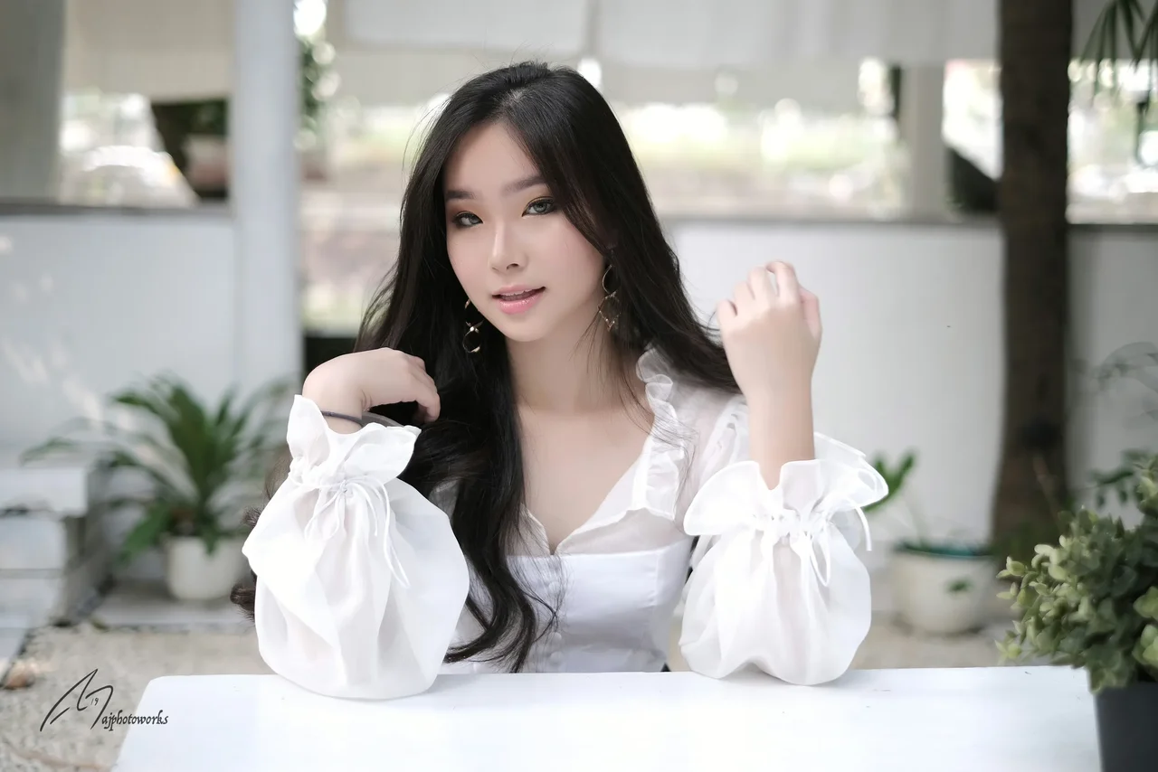 A serene outdoor portrait featuring a woman in a chic white ruffled blouse and black lace-up mini skirt, set against a lush garden backdrop under soft natural daylight.