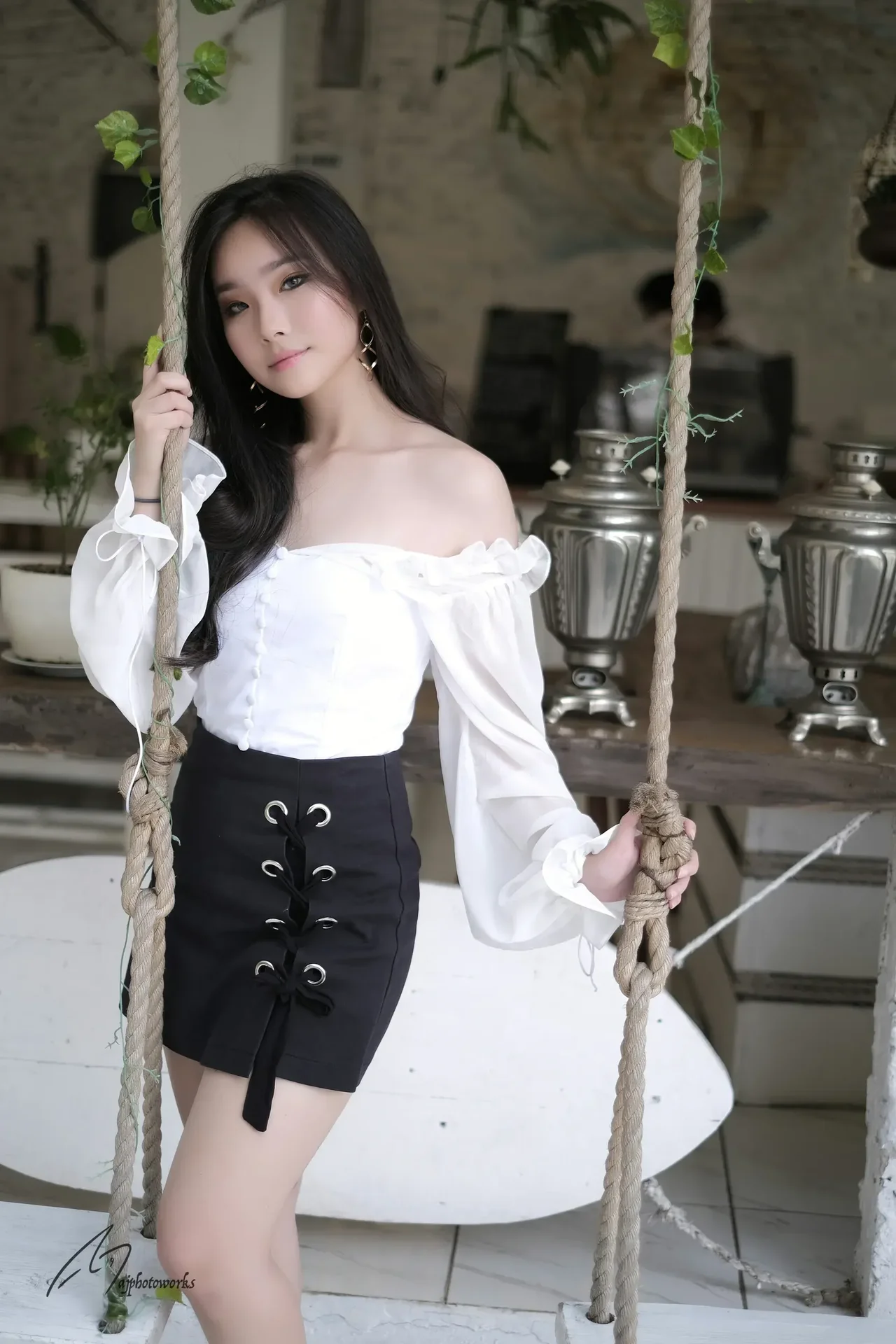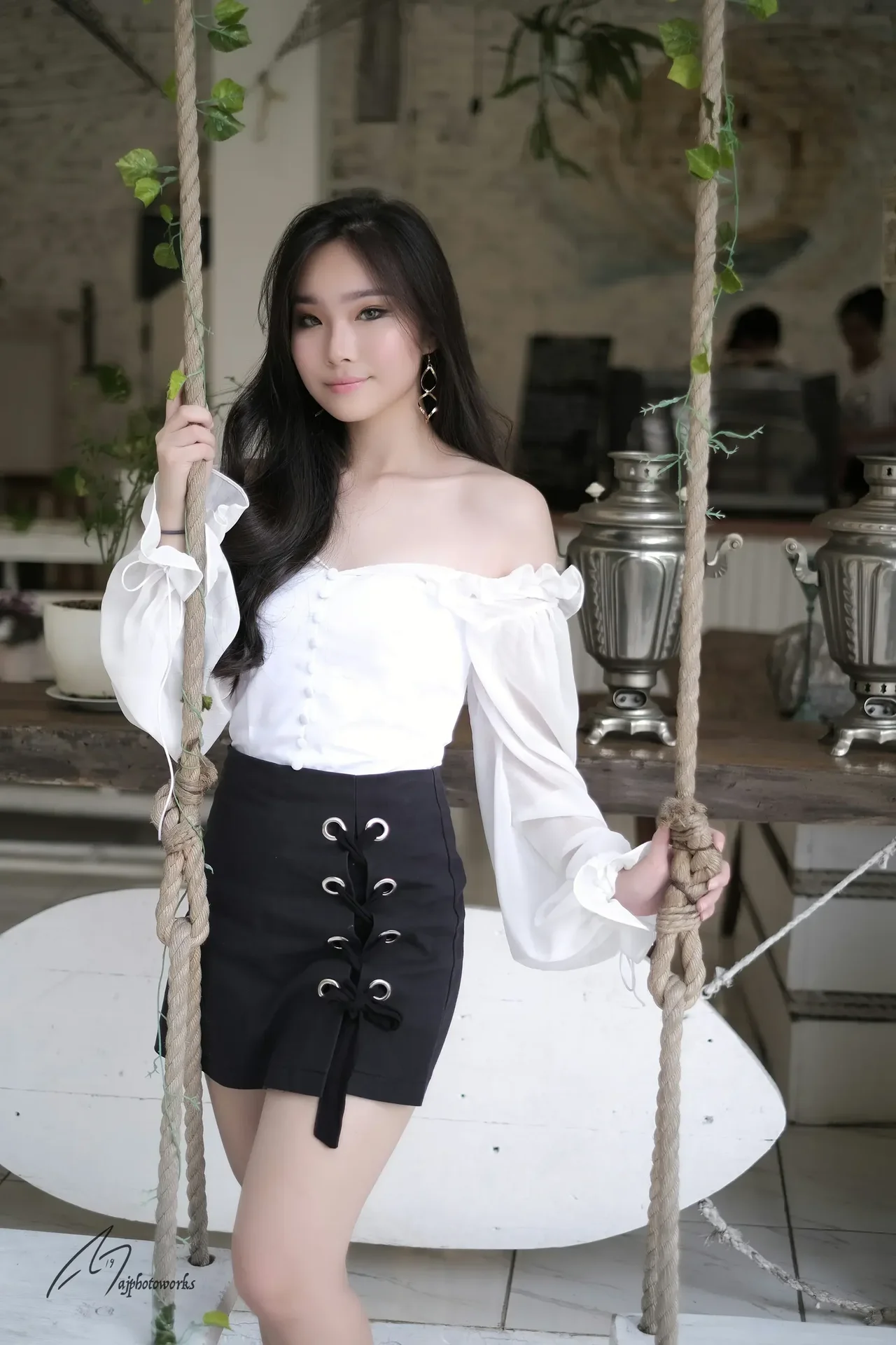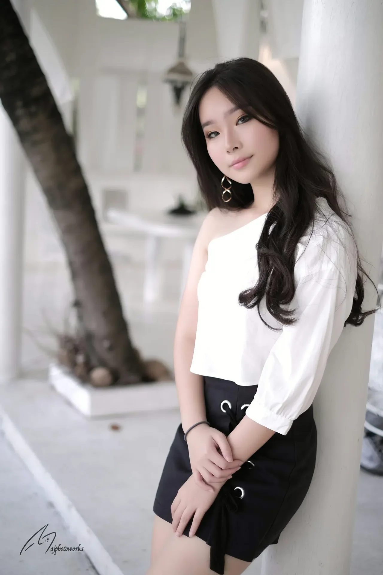 A woman in a flowing white blouse and black lace skirt poses elegantly in a sunny courtyard, her smile capturing a mix of casual grace and artistic allure.