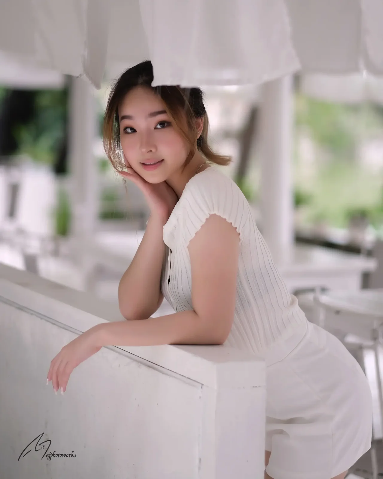 Elegance in white: A serene outdoor portrait capturing soft textures, natural light, and garden charm.