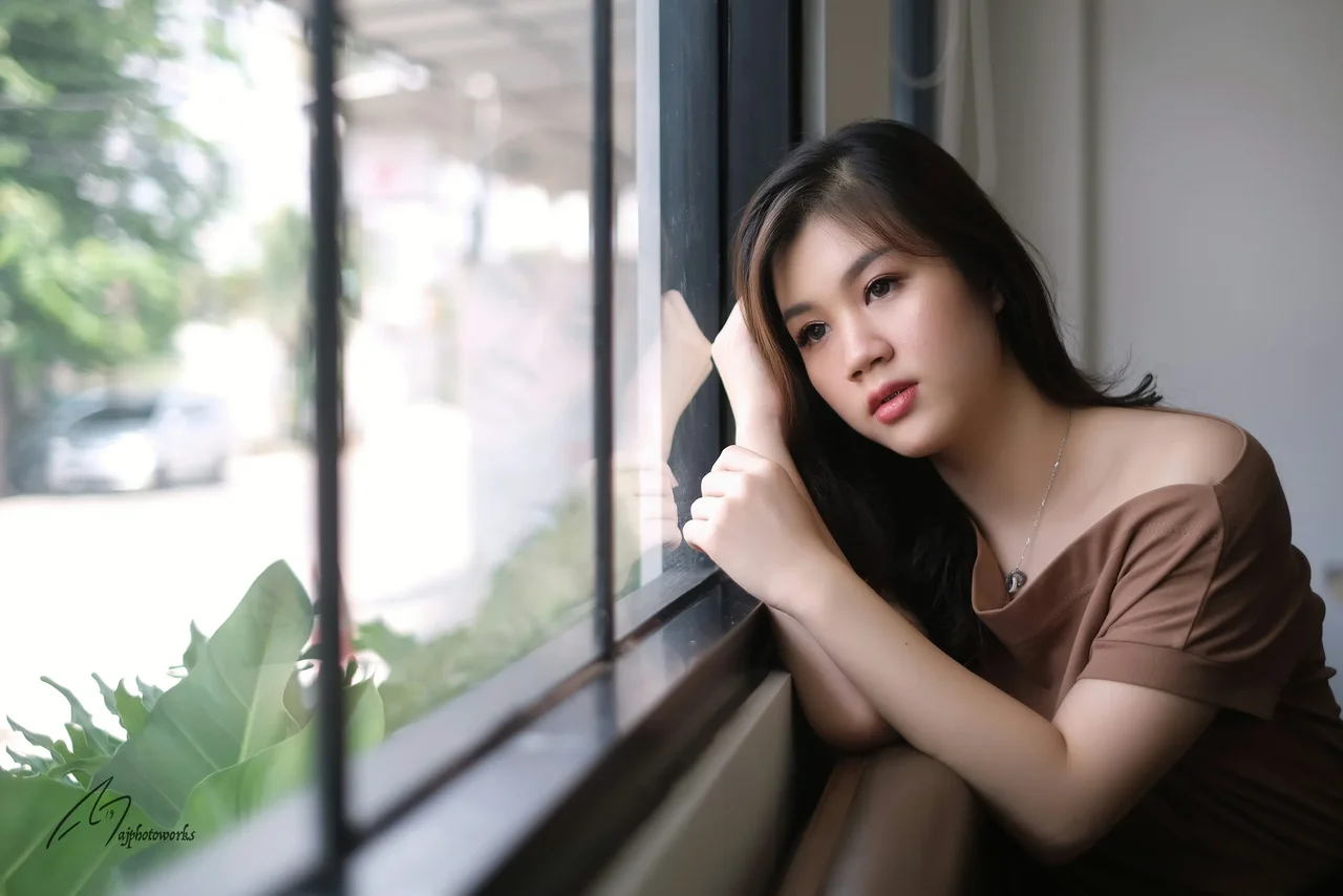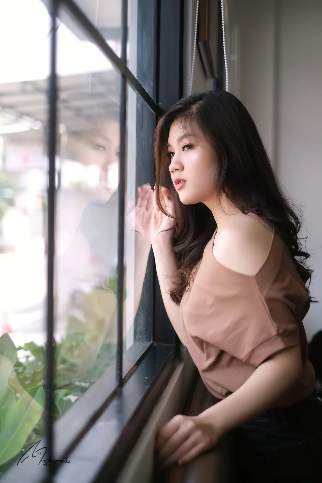 A serene figure in a warm-toned off-shoulder dress gazes contemplatively through a city-adjacent window, blending urban and natural elements in a cinematic, soft-focus study of reflection and stillness.
