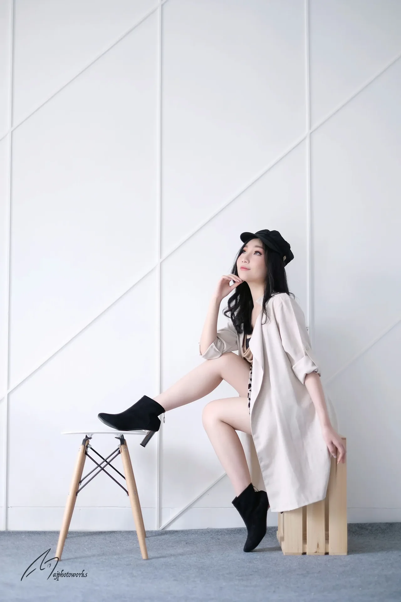 Elegant urban chic meets professional polish in a minimalist studio setting, where a striking black-and-white ensemble clashes with crisp geometric walls.