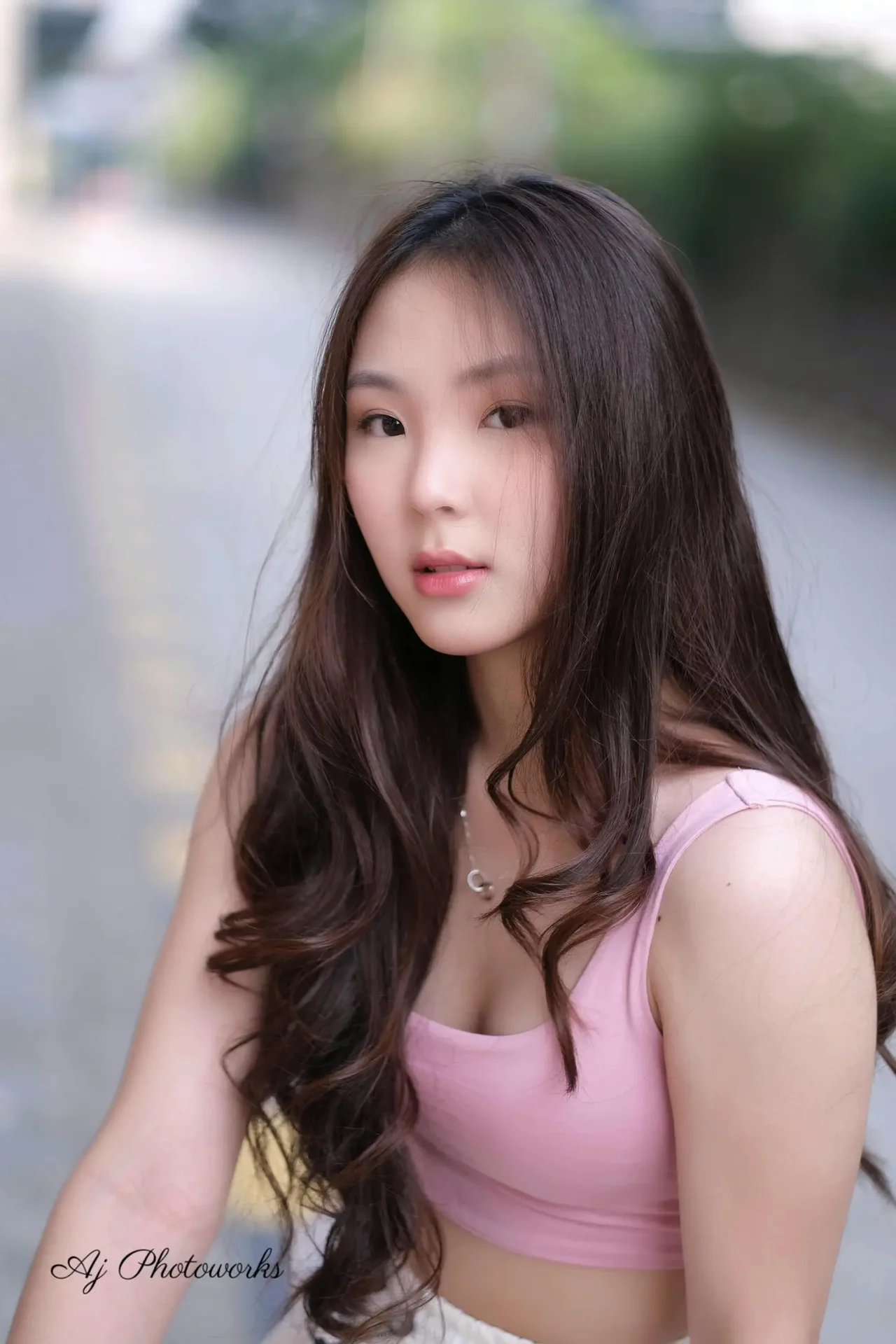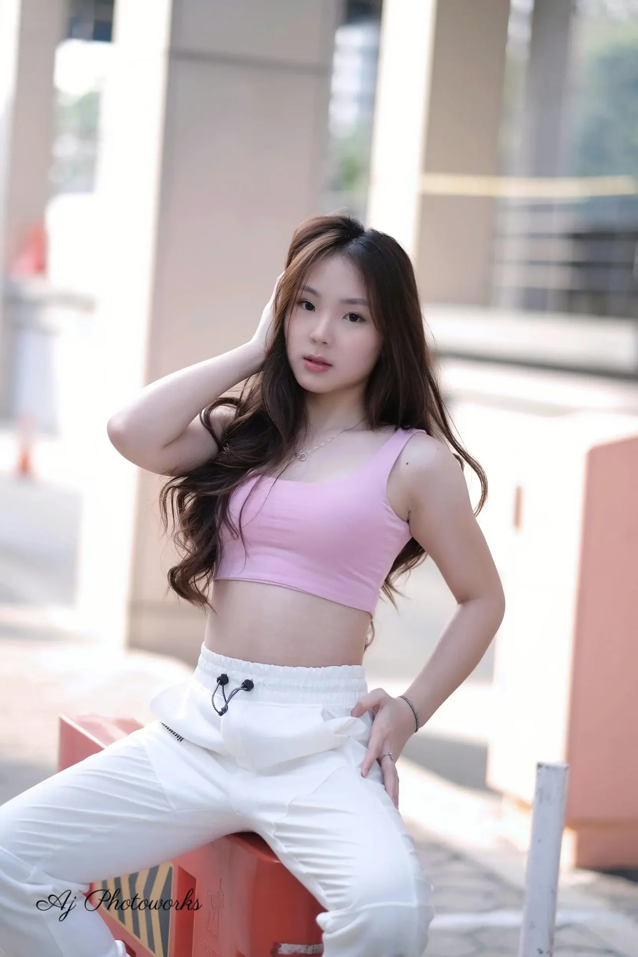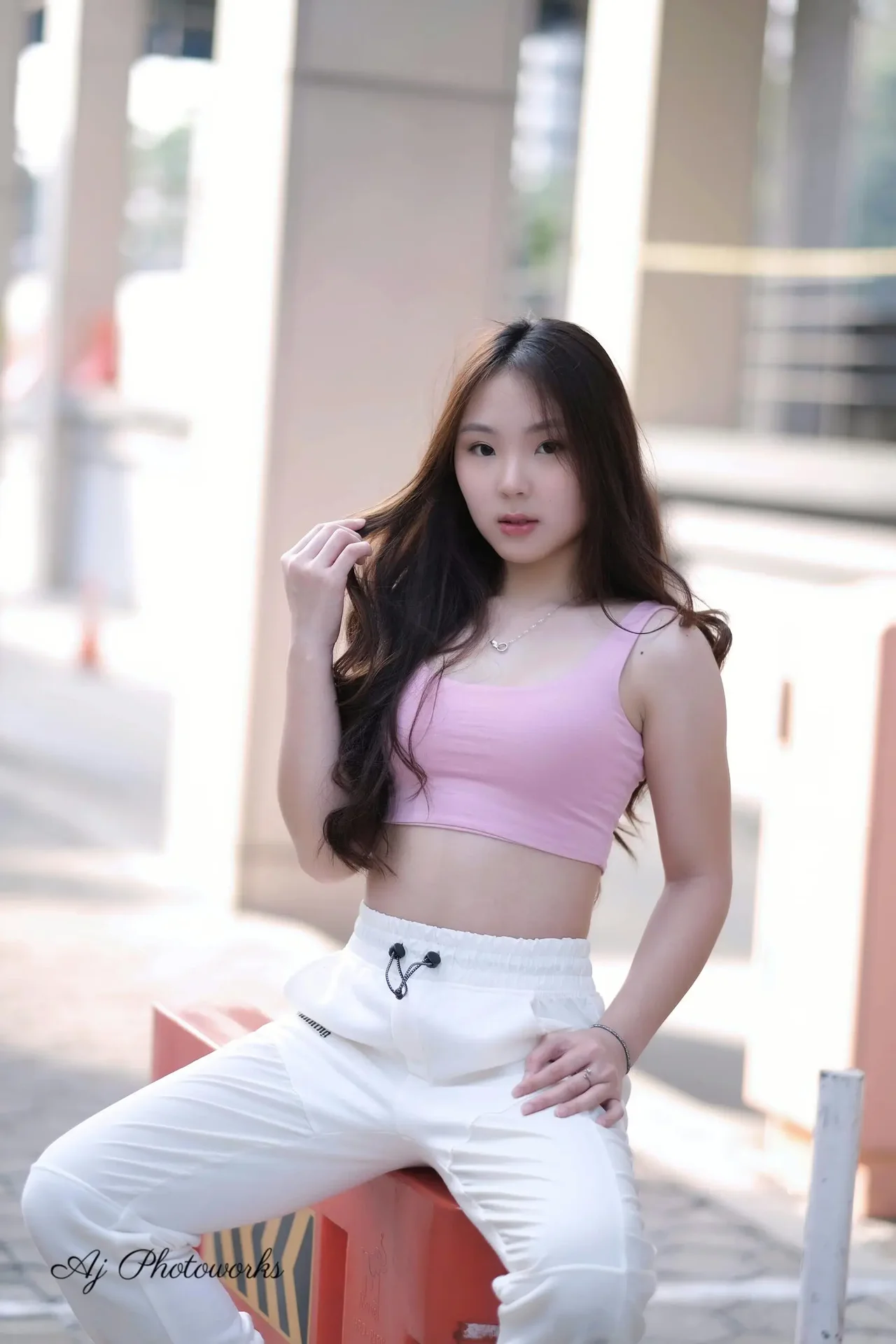A confident woman showcases modern street style in vibrant pink and white ensembles, blending urban textures with natural light and soft shadows.