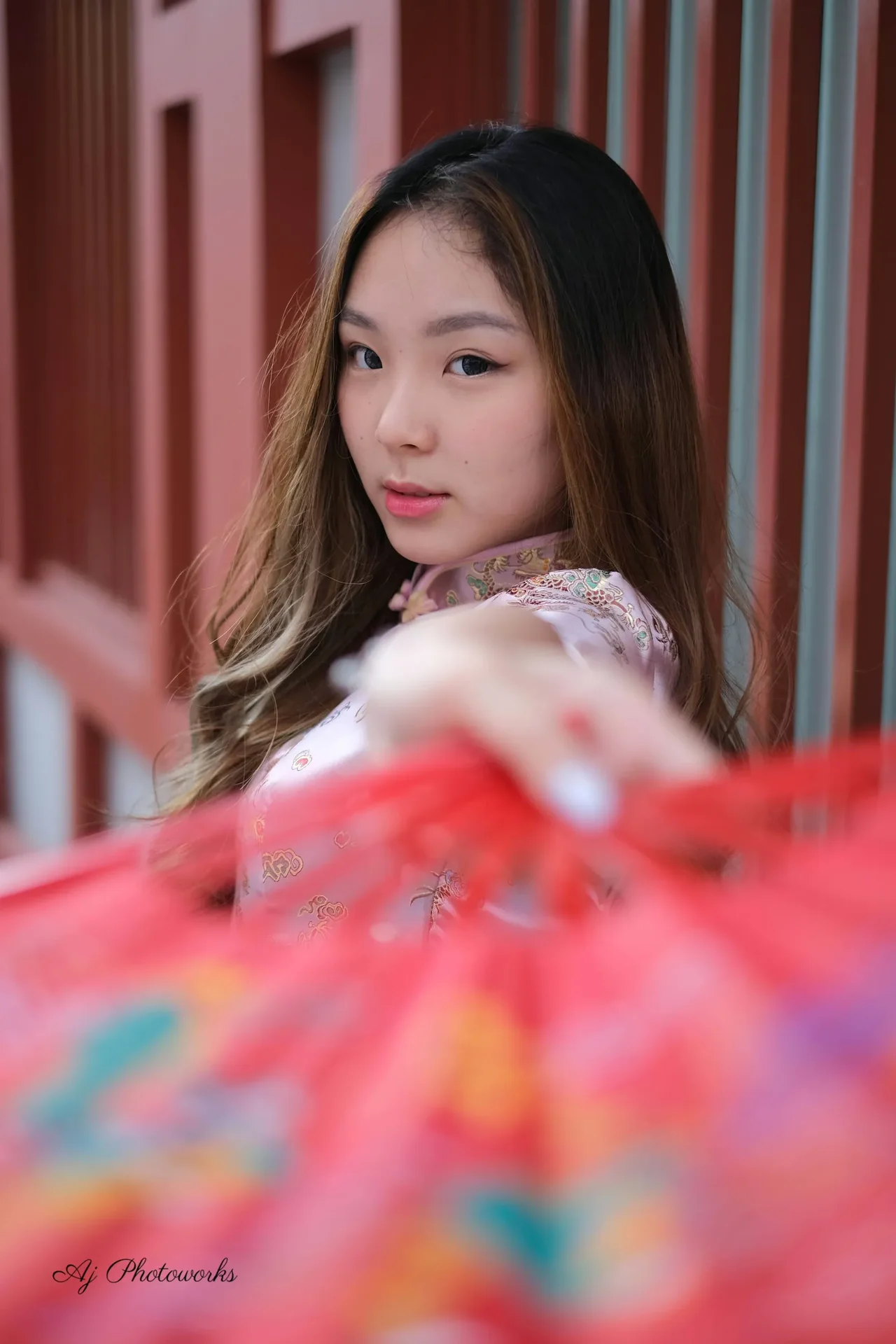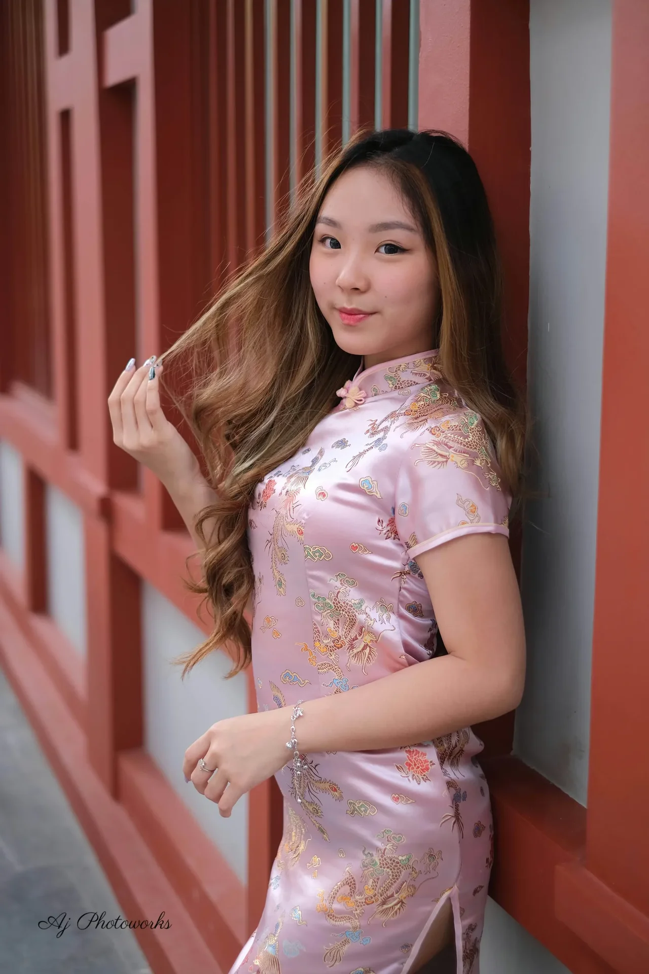 Elegance meets tradition in a vibrant portrait showcasing a silk qipao adorned with intricate floral and dragon motifs, set against a bold red architectural backdrop.