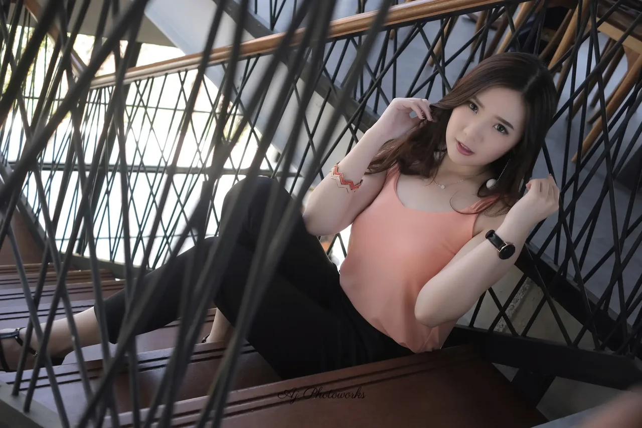 A young woman styled in a peach sleeveless top and black pants poses confidently on an outdoor staircase, blending casual elegance with urban charm
