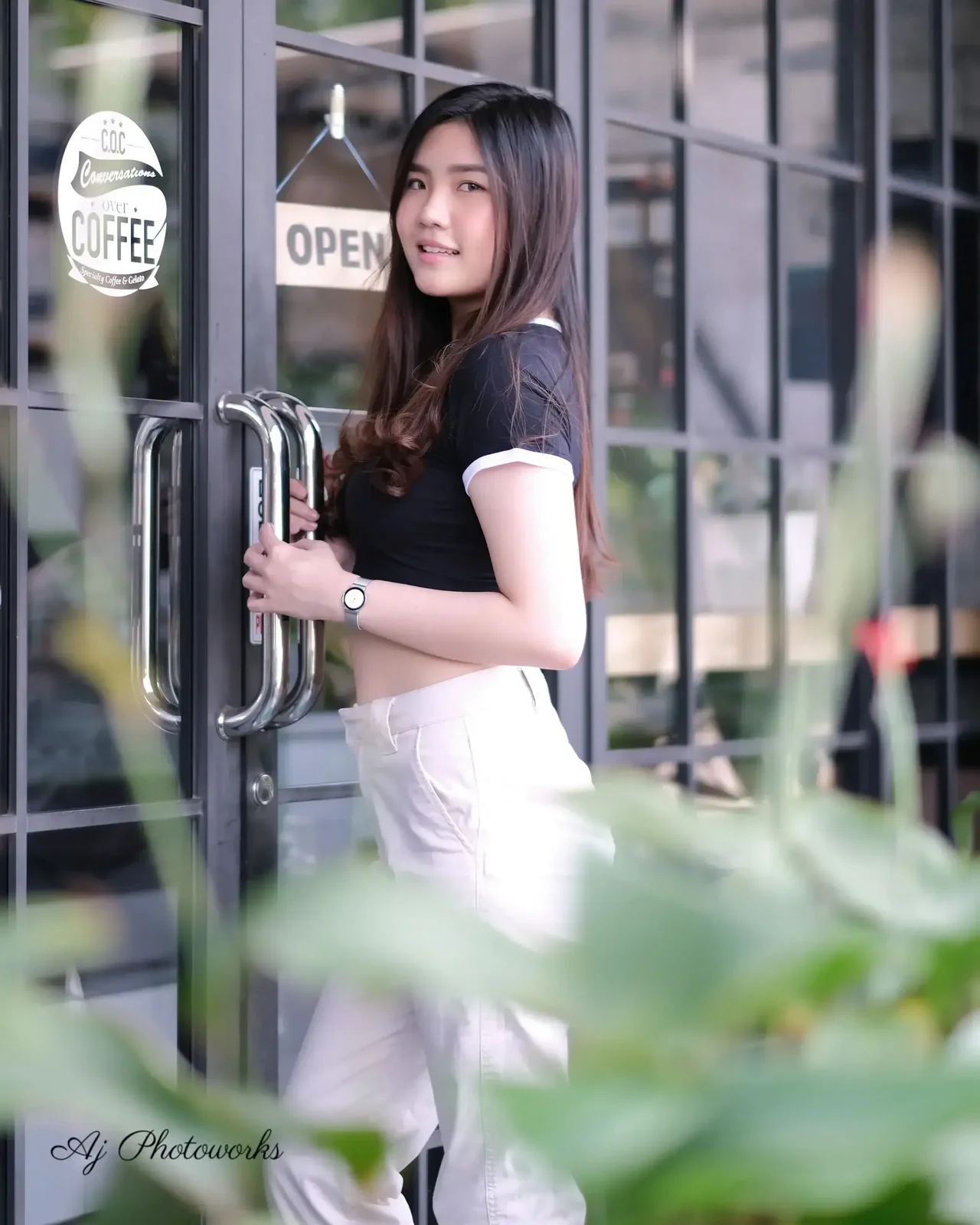 A young woman in casual-chic attire stands at a café entrance, blending urban style with natural warmth.