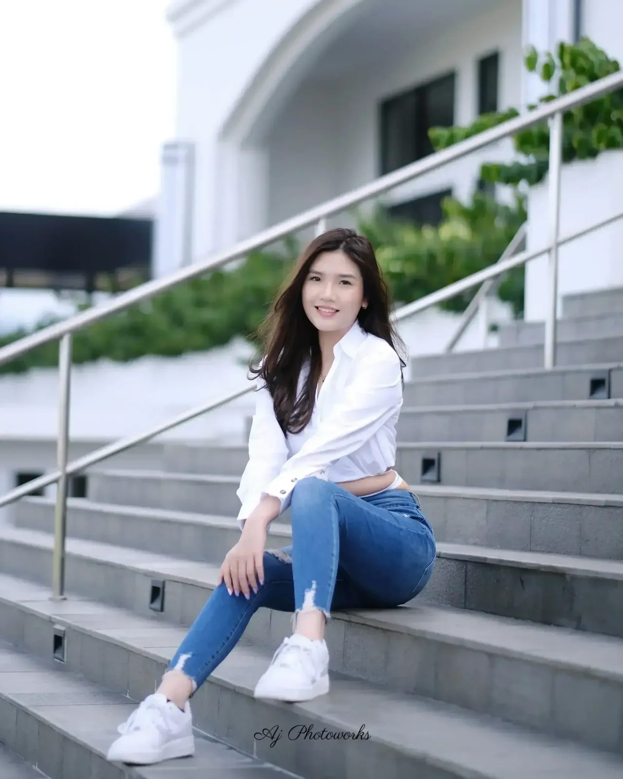 A portrait of an Asian woman dressed in a casual yet stylish outfit, seated on outdoor steps. She exudes confidence and allure with a touch of edginess. The caption references iconic magicians to highlight the blend of allure and enigma in the image.