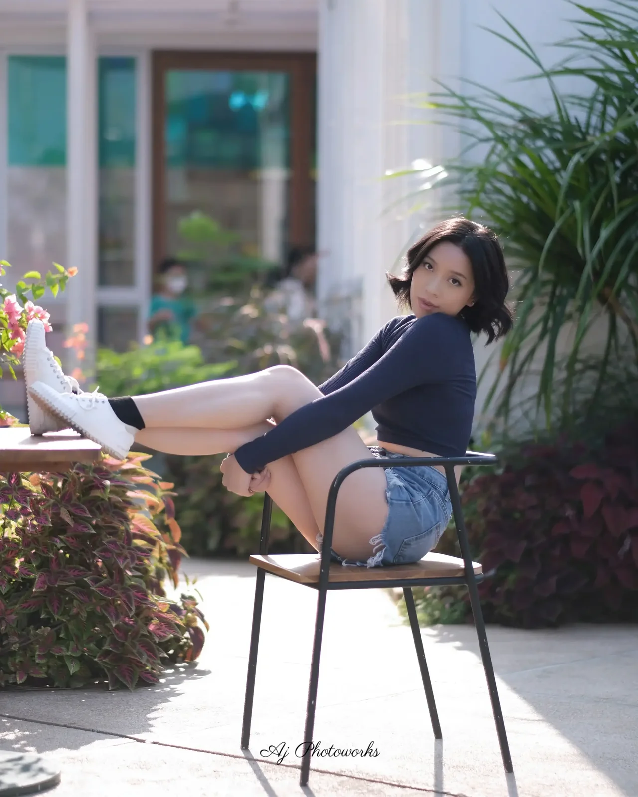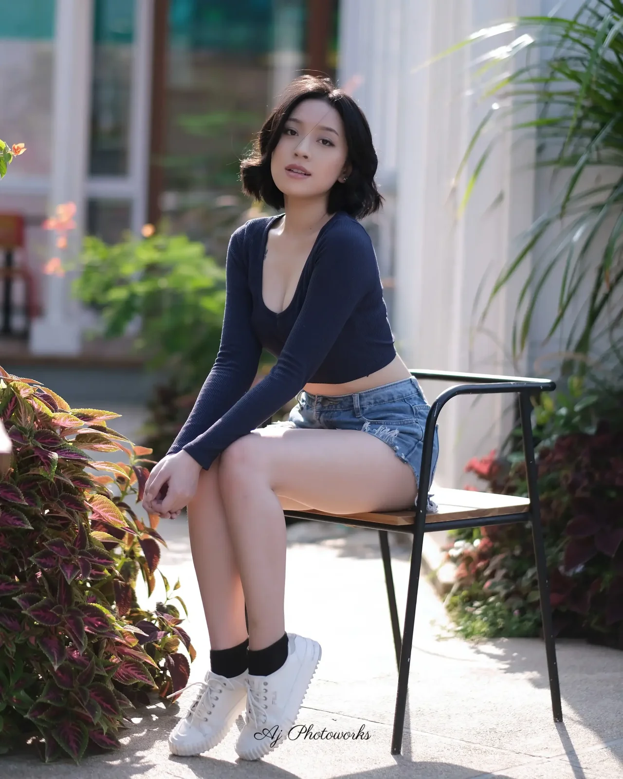 A modern, cinematic portrait of a woman in contemporary streetwear, blending natural textures and urban fashion against a serene outdoor backdrop.