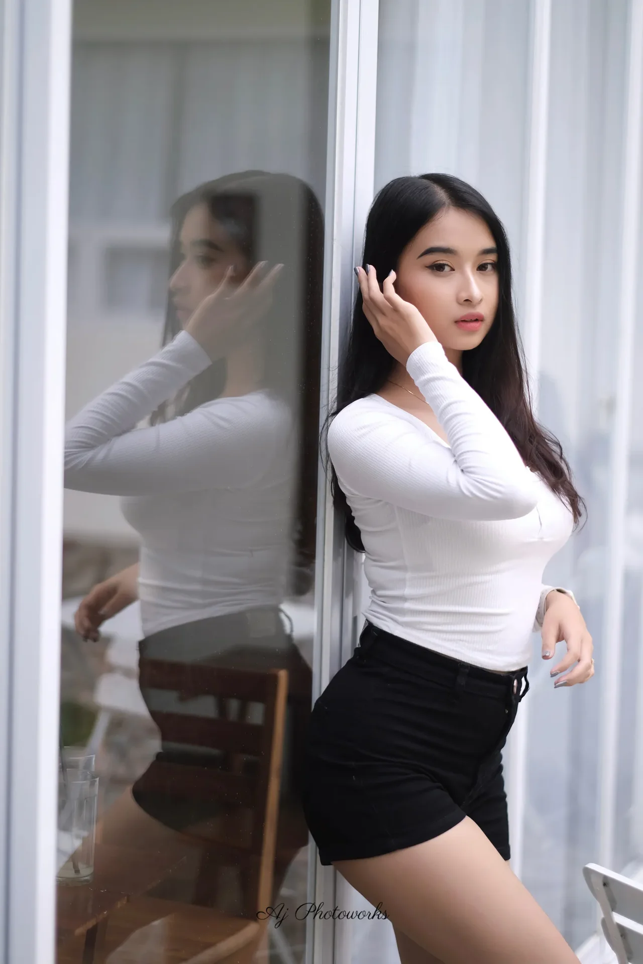 A young woman exudes confidence in a stylish white long-sleeve top and black high-waisted shorts across diverse settings.