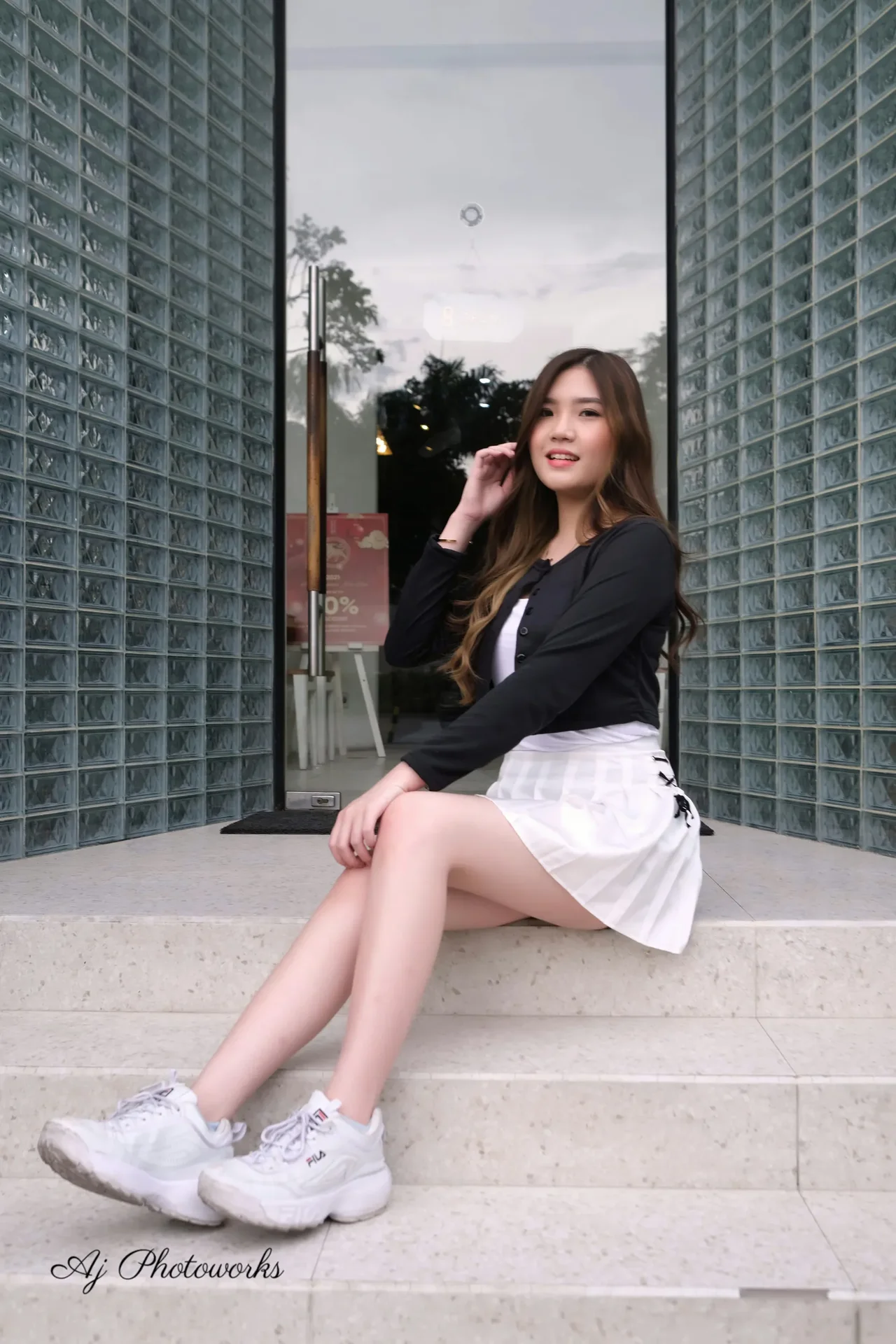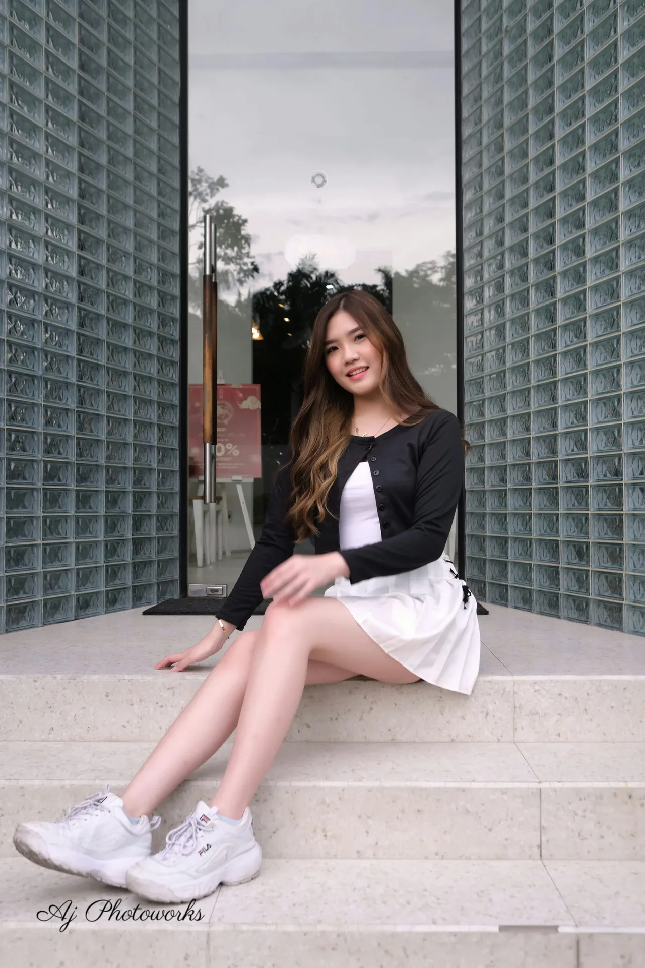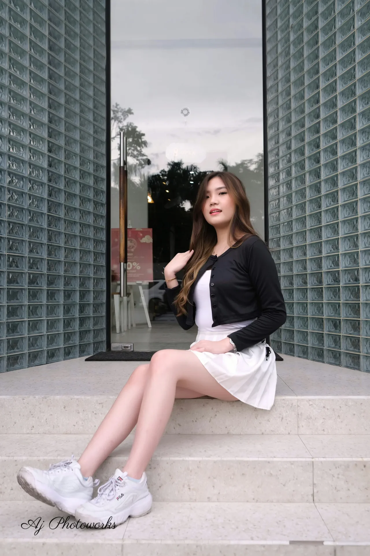 Cheerful portrait of a young woman in urban fashion photography, capturing confident poses against contrasting black, white, and glass wall backgrounds.