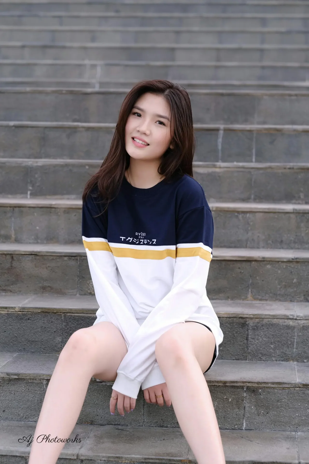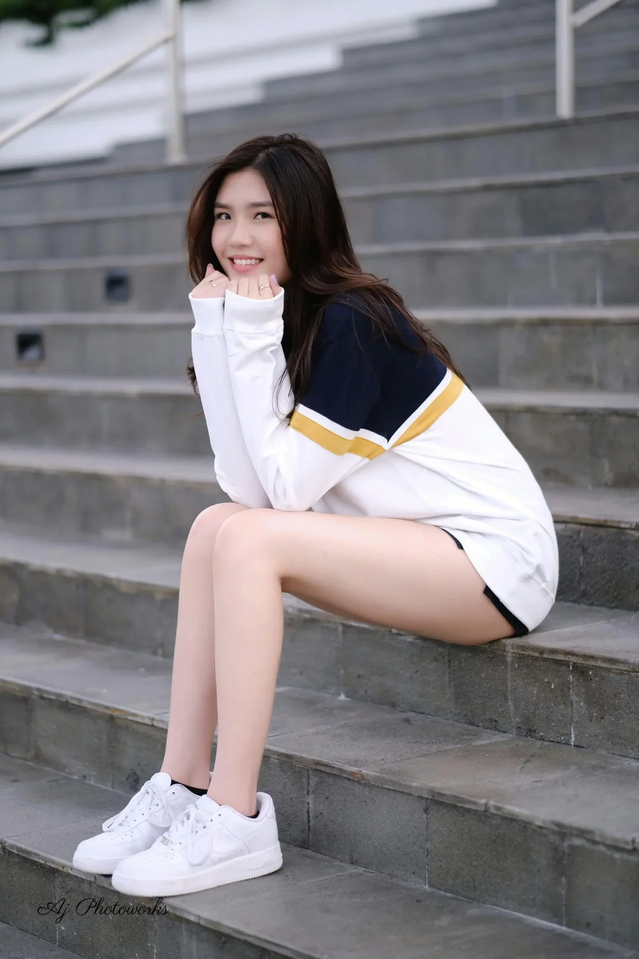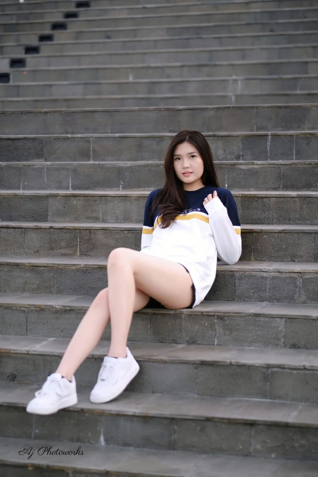 Confident portrait of a woman in a bold navy, white, and gold outfit posing on outdoor concrete steps under natural lighting.