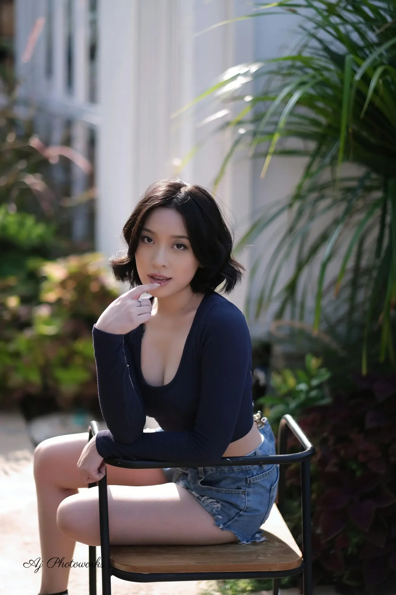 A radiant outdoor portrait of a model in a chic denim-and-navy ensemble amidst lush tropical garden elements, highlighting relaxed sophistication and natural beauty.