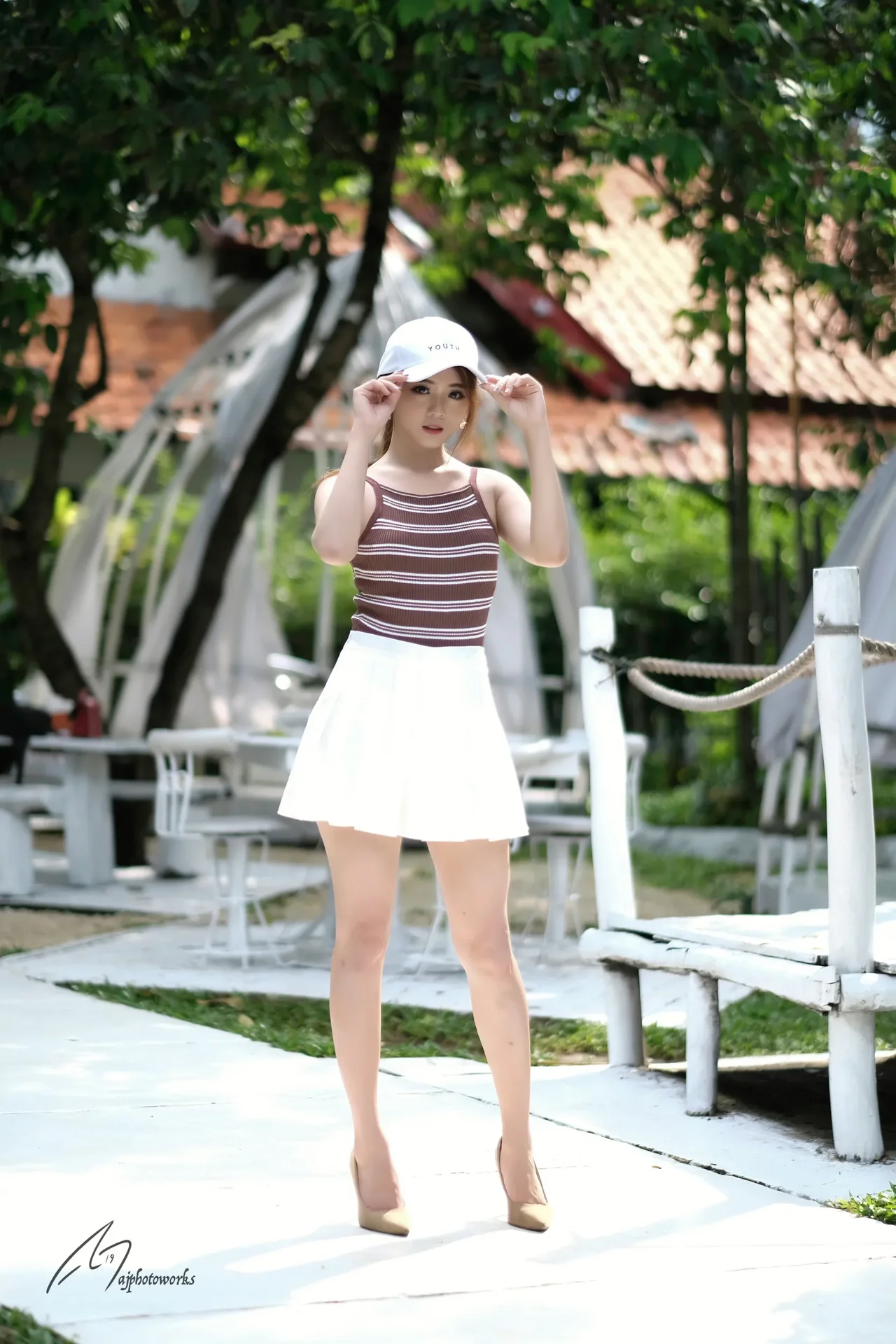 A graceful blend of fashion and nature, this subject embodies summer elegance in a vibrant outdoor setting.
