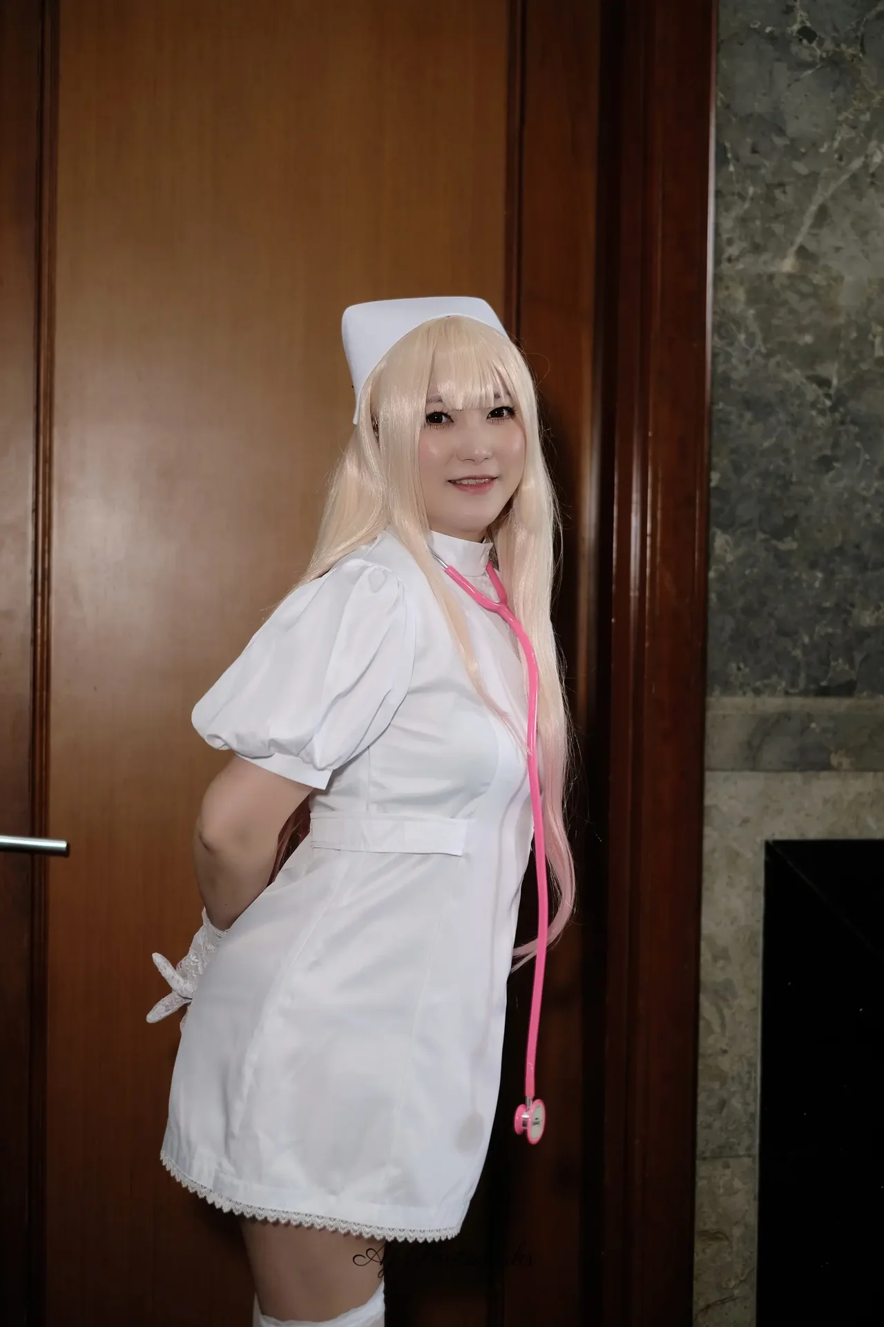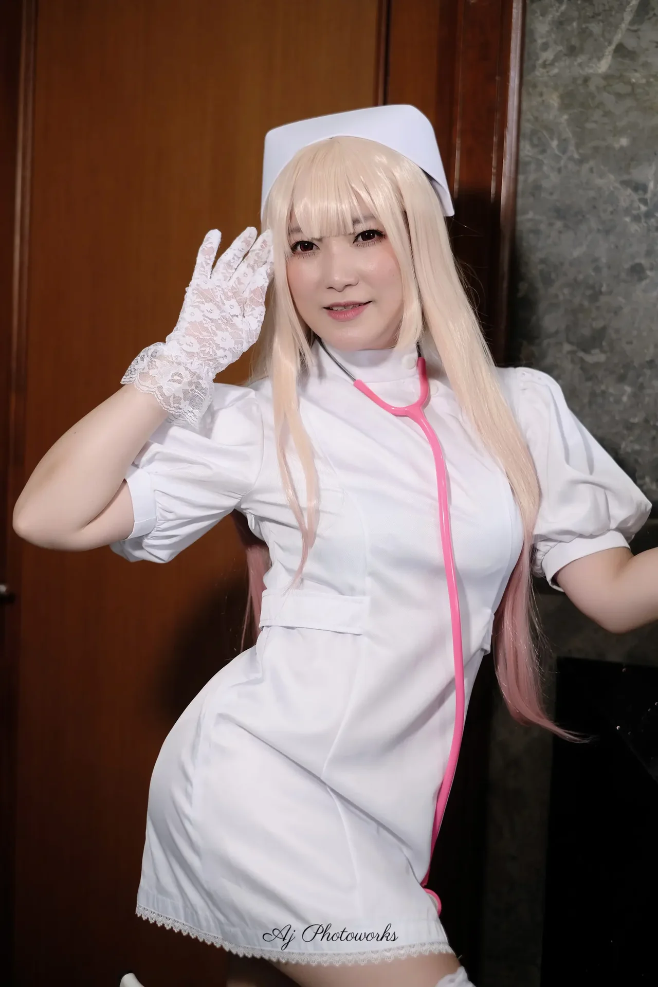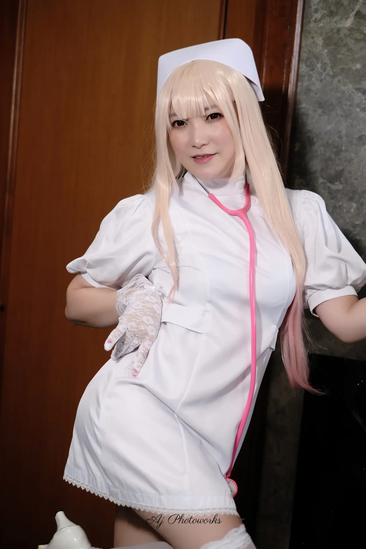 A playful and professional portrayal of a nurse in a cosplay setting, blending realistic detail with artistic fashion photography.