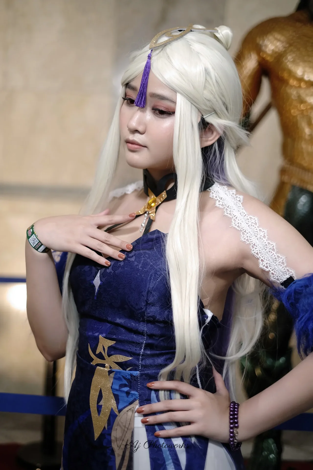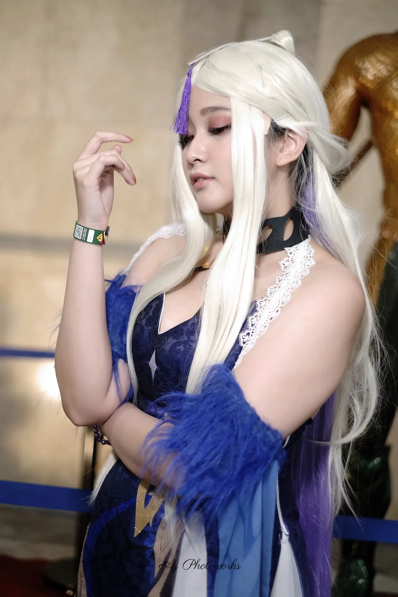 Elaborate cosplay of a fantasy-inspired character with intricate costume details, vibrant colors, and dramatic styling in a curated event space.