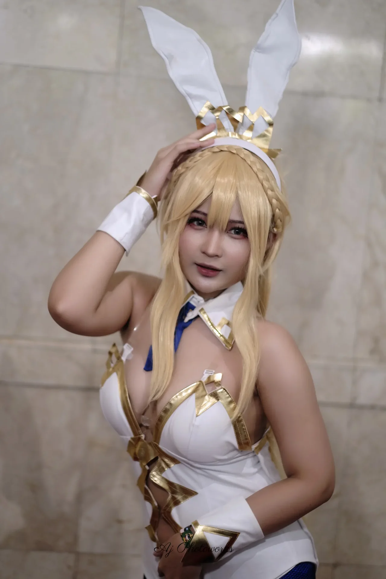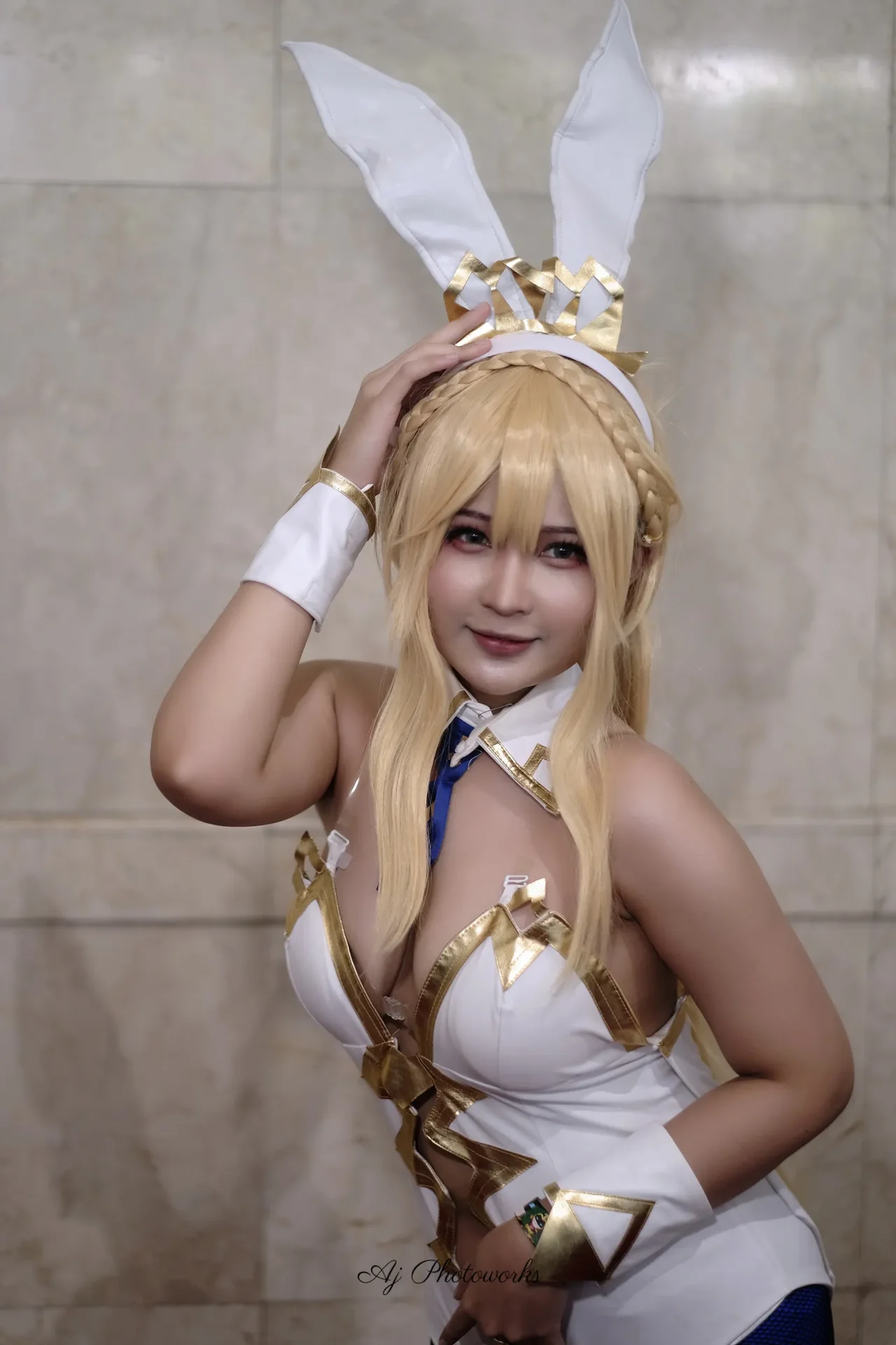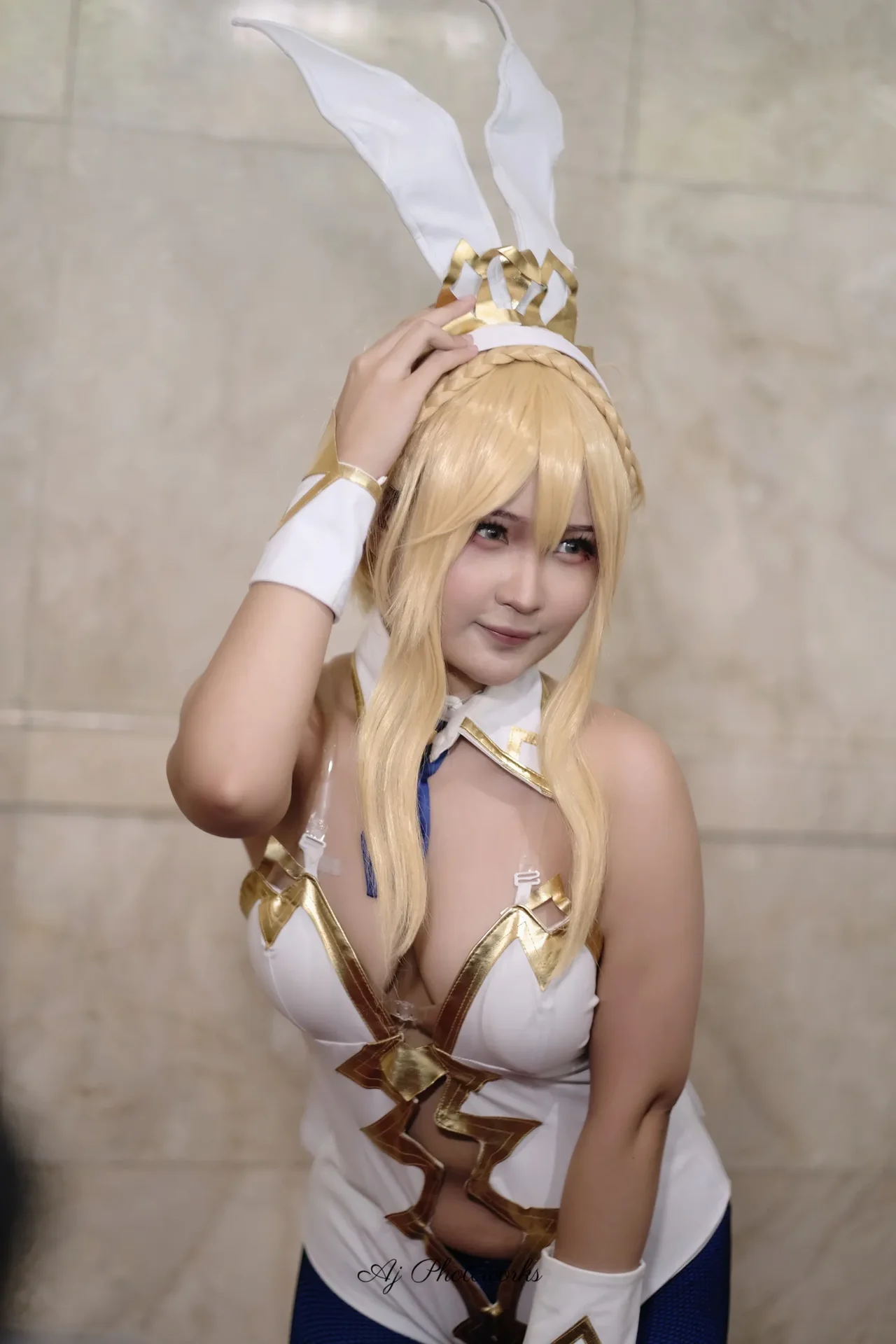 A cosplayer embodies a bunny-themed character with intricate white and gold detailing, evoking playful fantasy and glamour through striking contrasts and stylized poses.