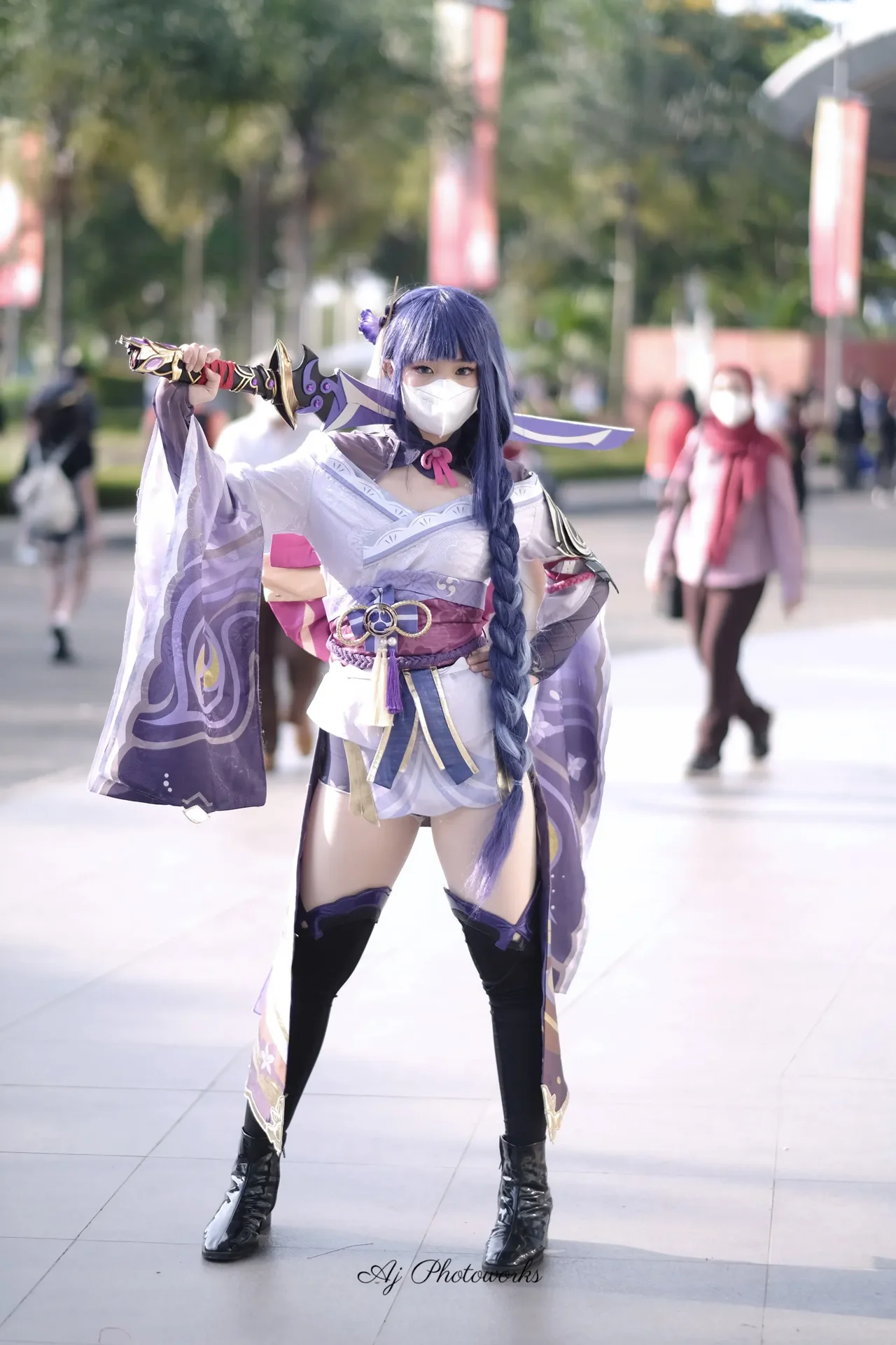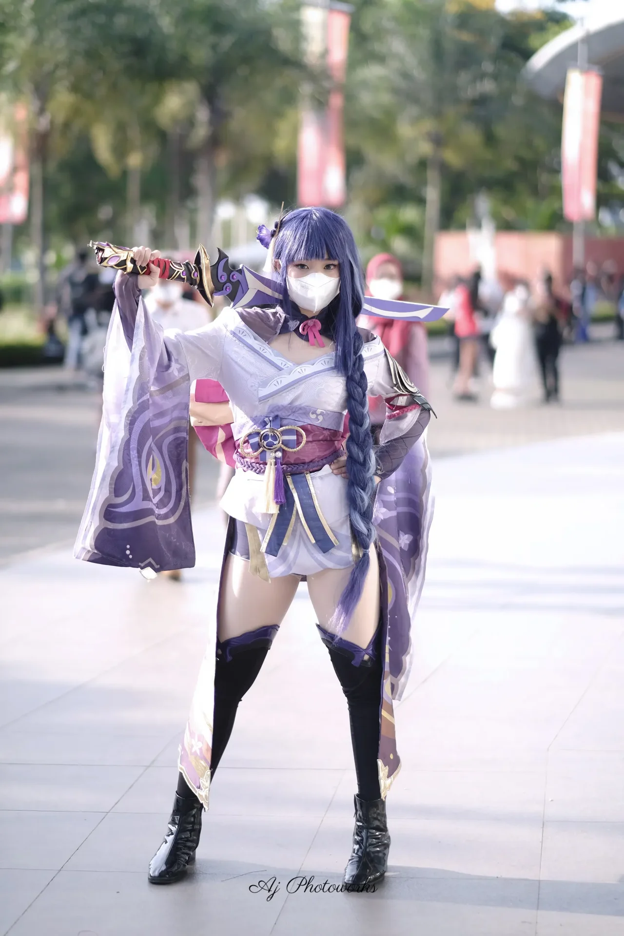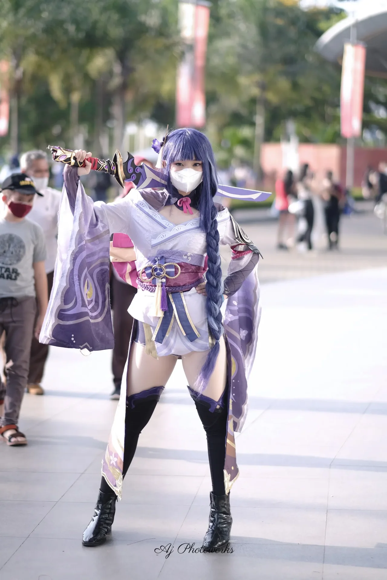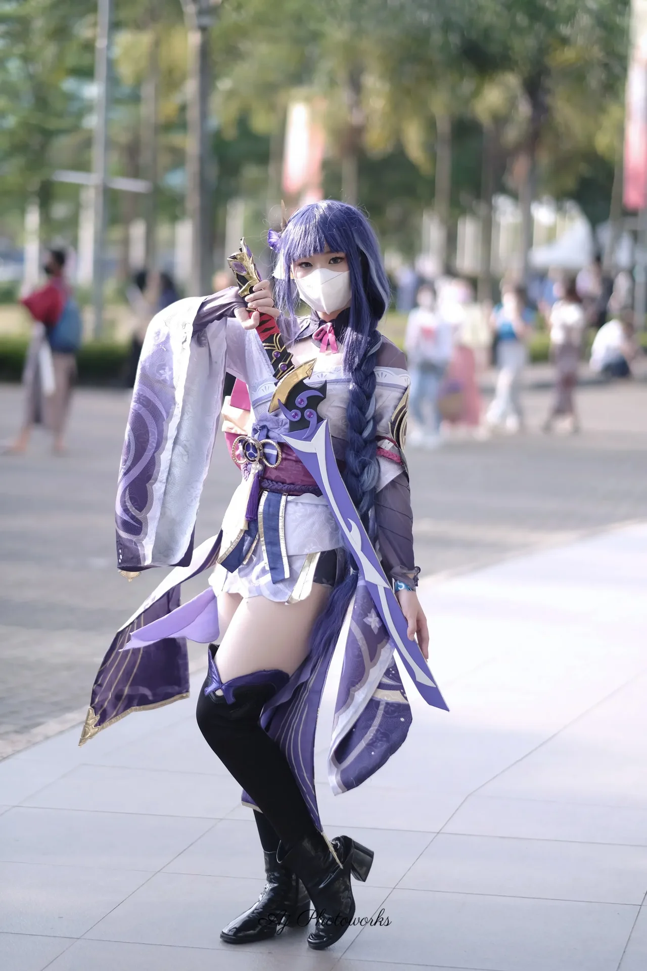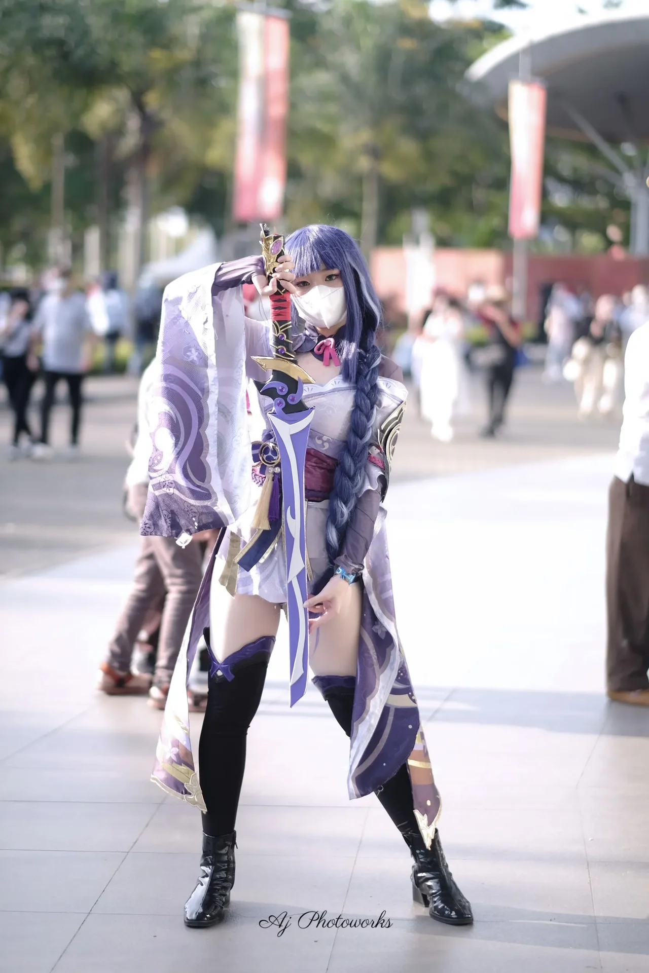 A vibrant cosplay of a fantasy character in purple and blue attire, holding a ceremonial sword, outdoors on a bustling street surrounded by trees and red banners.