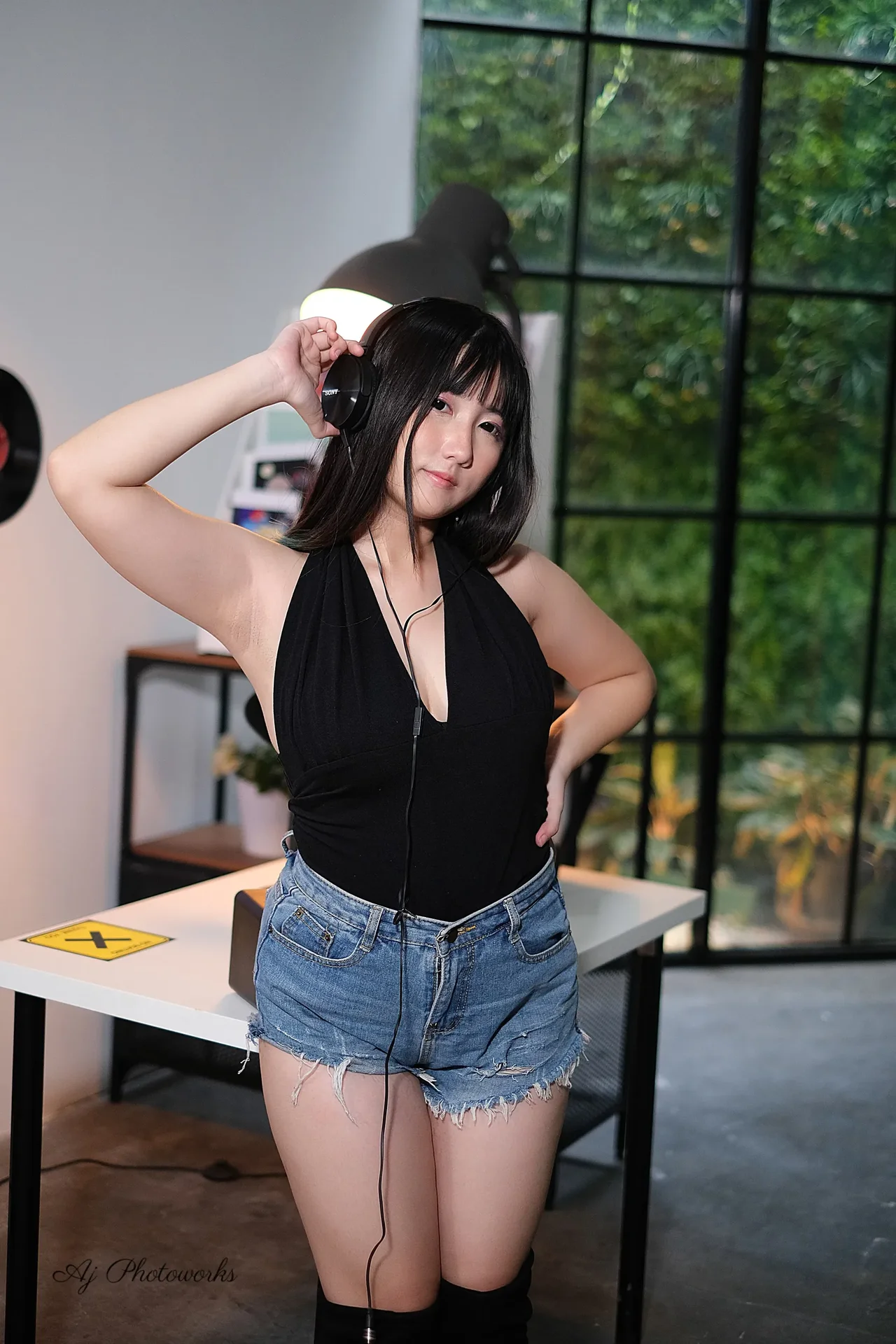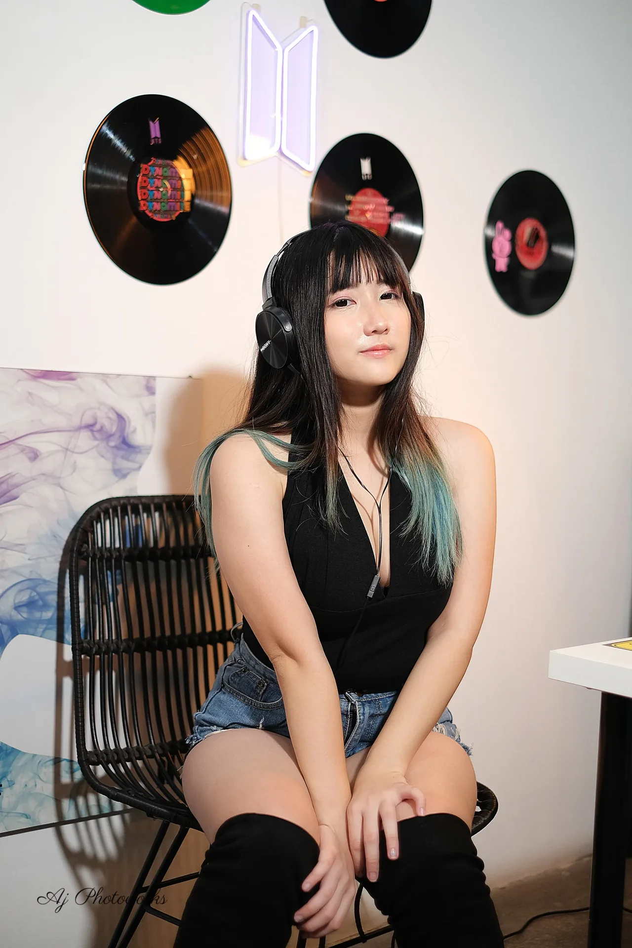 A modern studio portrait featuring a woman in a black sleeveless top, high-waisted denim shorts, and knee-high boots with headphones, surrounded by vinyl records and a microphone setup.