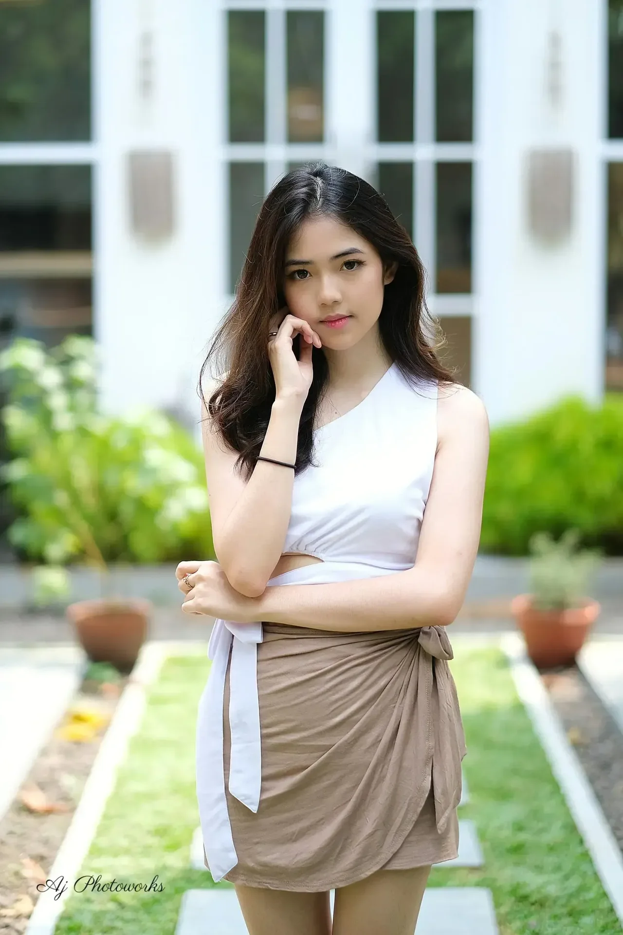 A model showcases a chic, casual summer ensemble in a serene outdoor setting, blending natural warmth and breezy elegance.