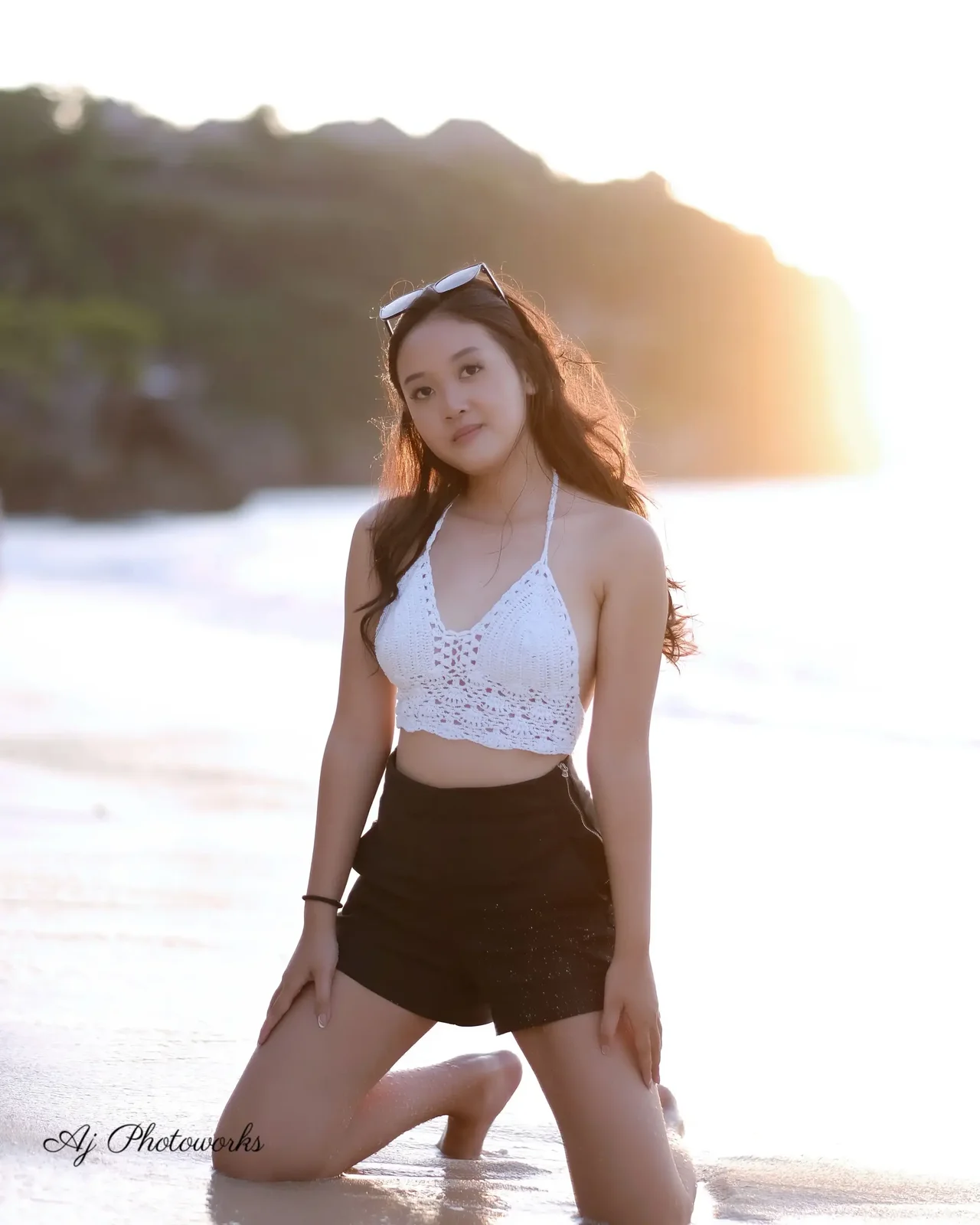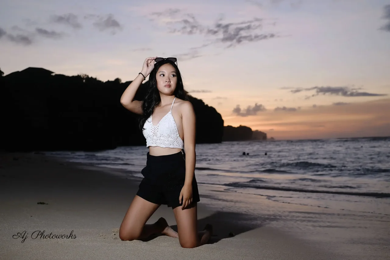 Capturing elegance in nature's embrace, a woman's graceful journey from sunlit cliffs to twilight shores, showcasing timeless style against dynamic natural backdrops.