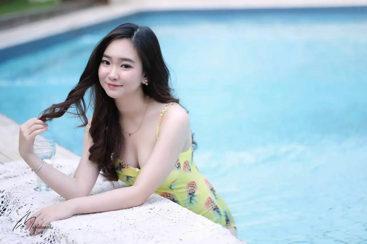 A vibrant fashion editorial photoshoot by the poolside, blending summer leisure with editorial elegance.