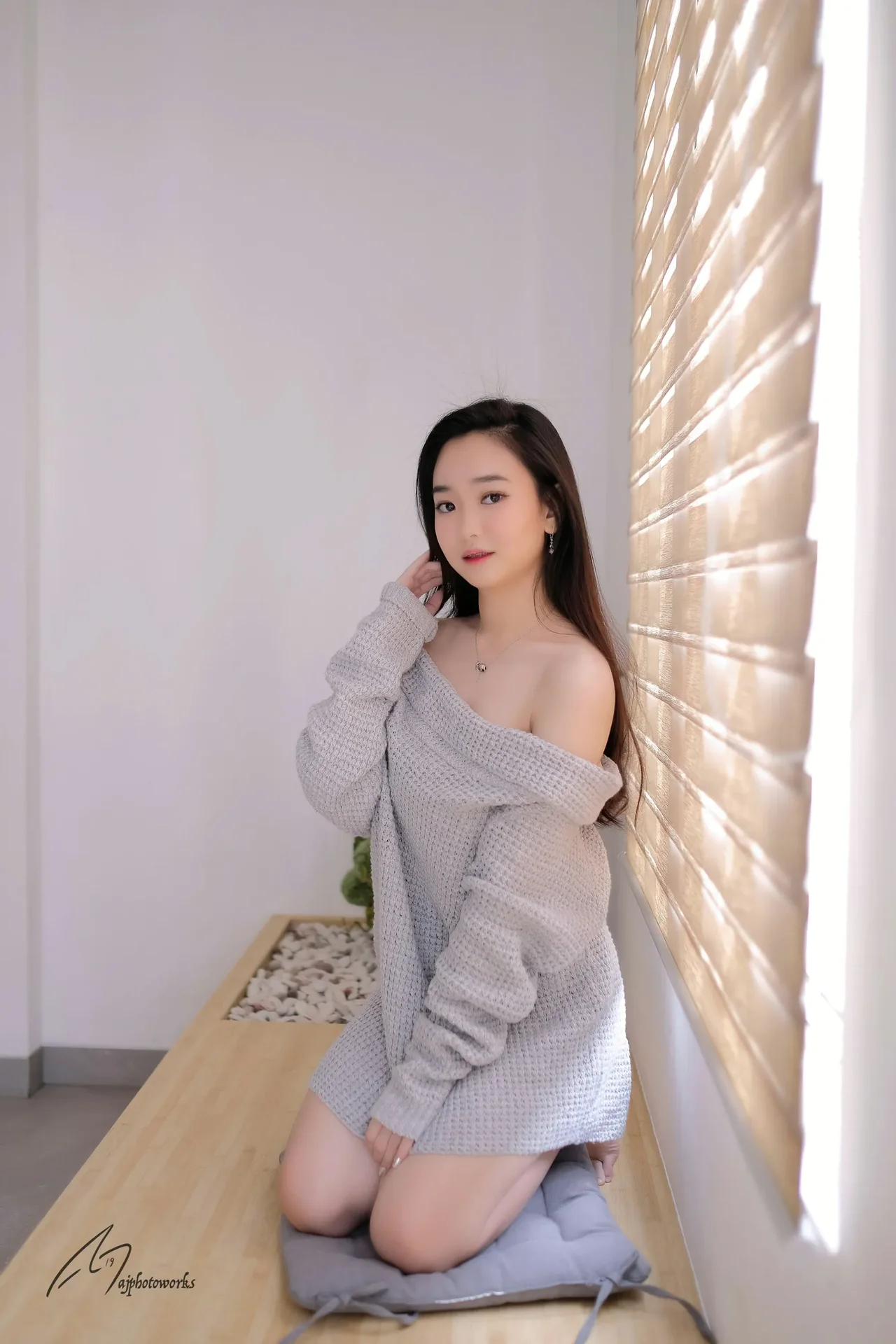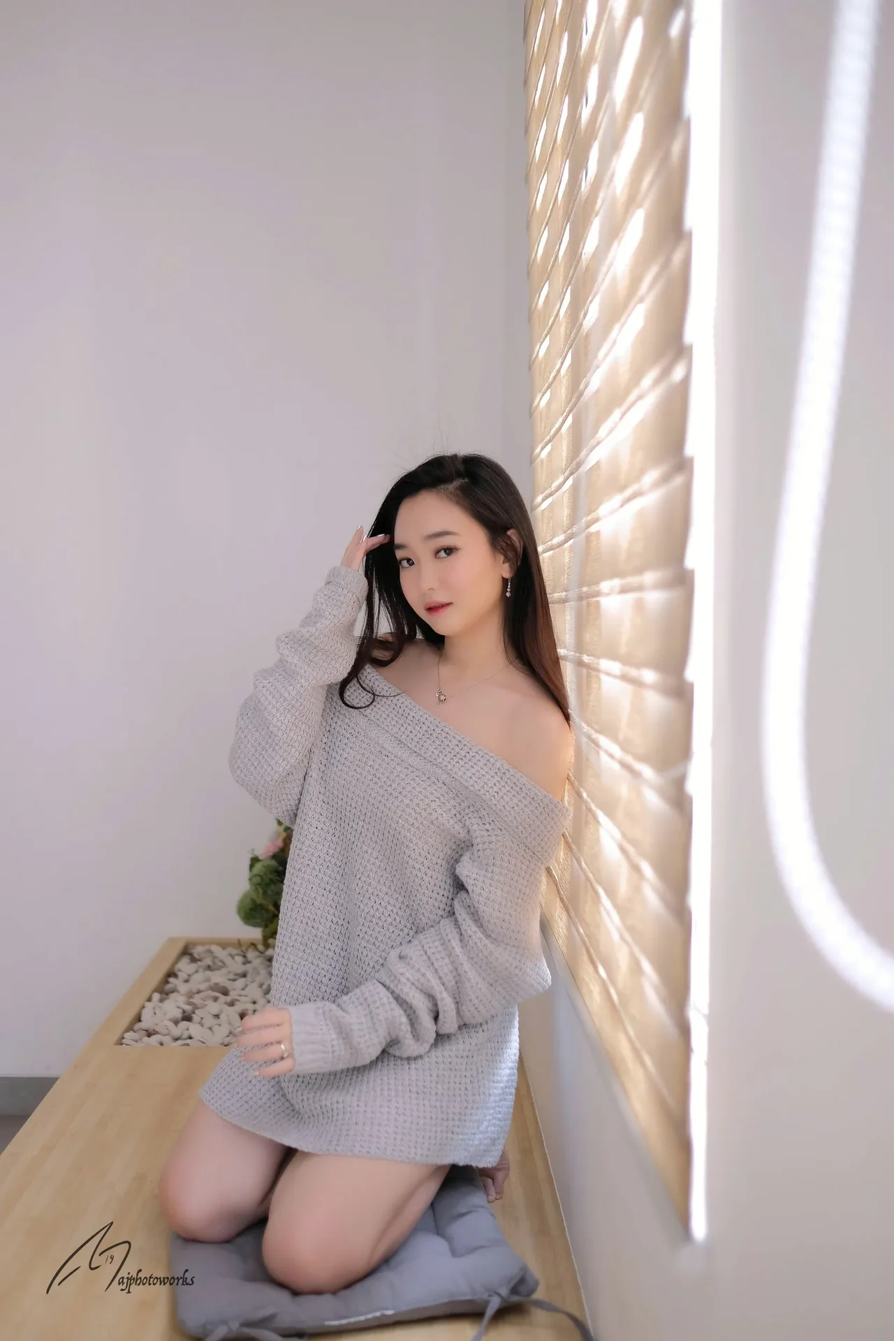A serene indoor portrait of a woman in a cozy gray knit dress, bathed in soft natural light through bamboo blinds, evoking calm and comfort.
