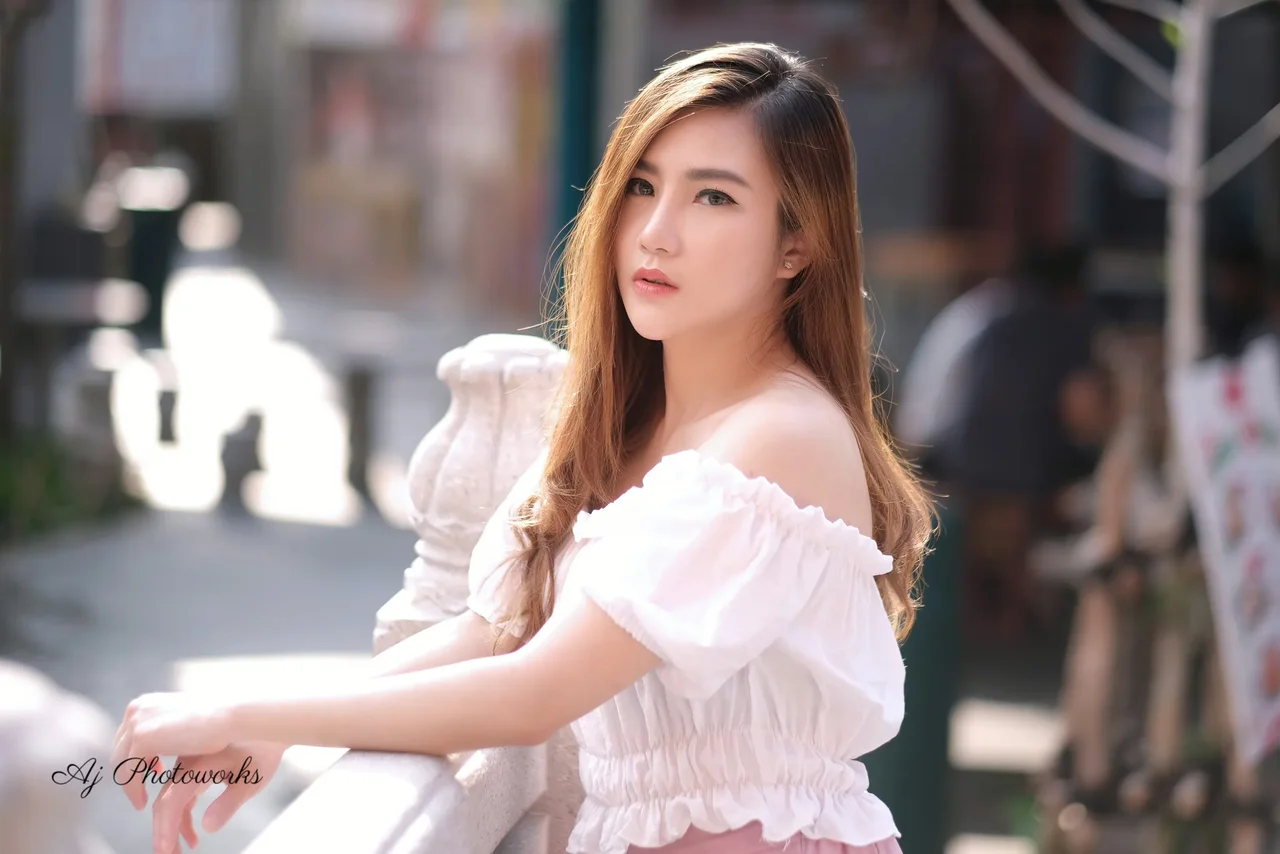 The dance of light and shadow in urban whispers; her story told in hues of ivory and blush.